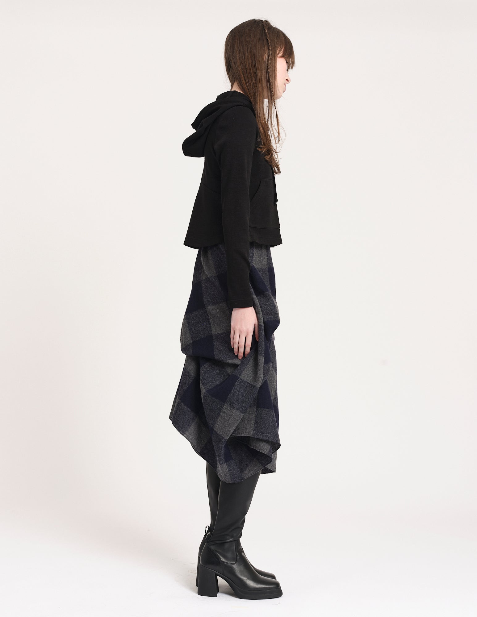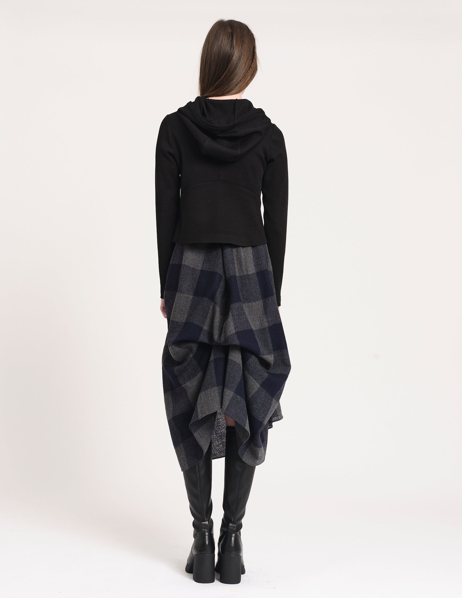 fitted hooded cardigan with front button closures and pockets. styled with the hyacinth skirt.
