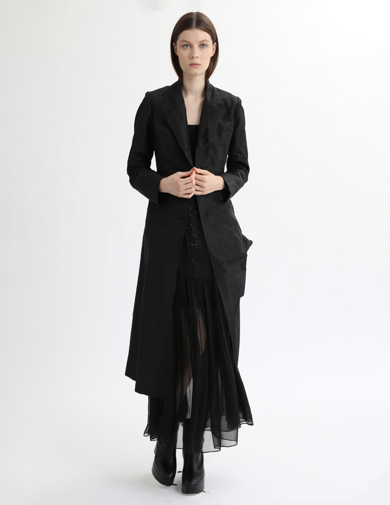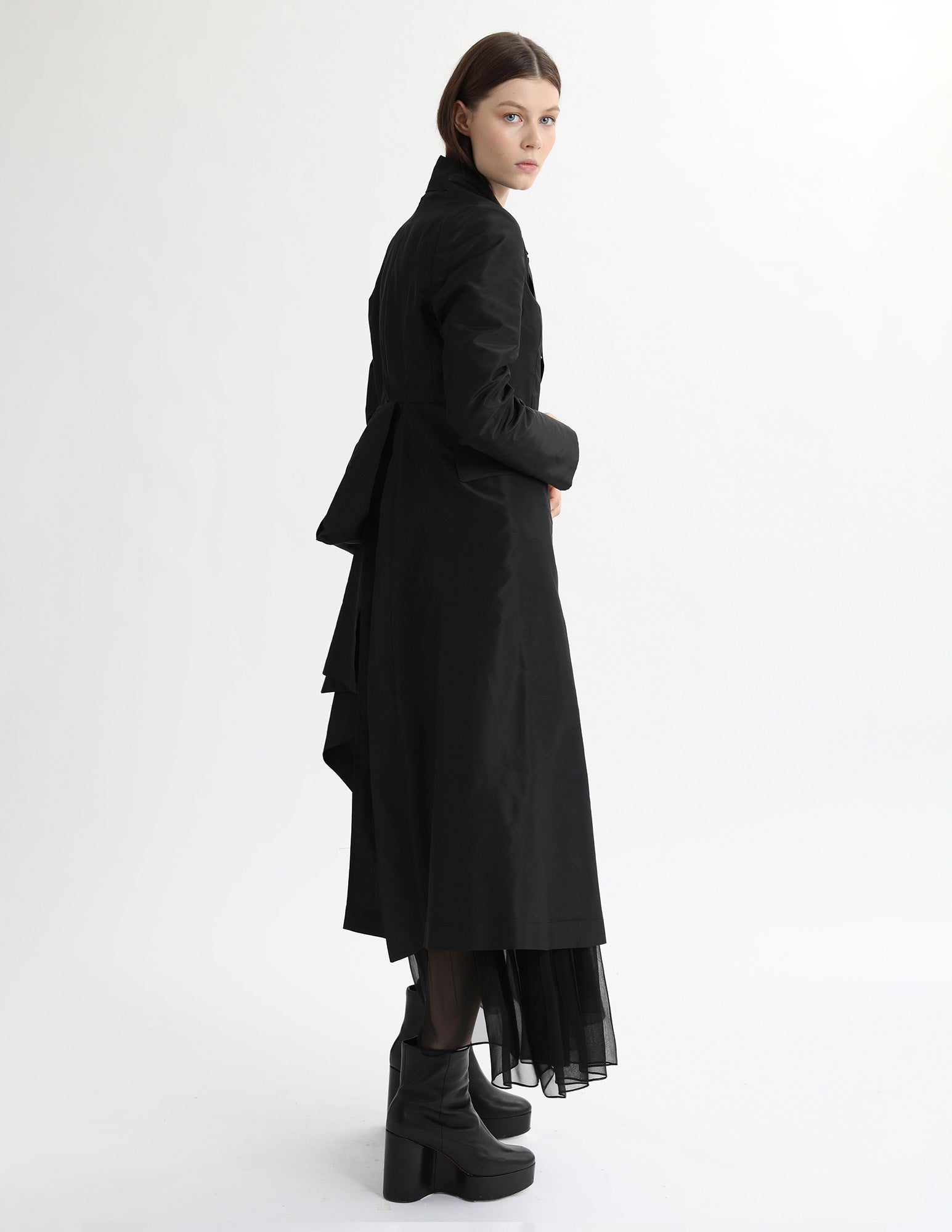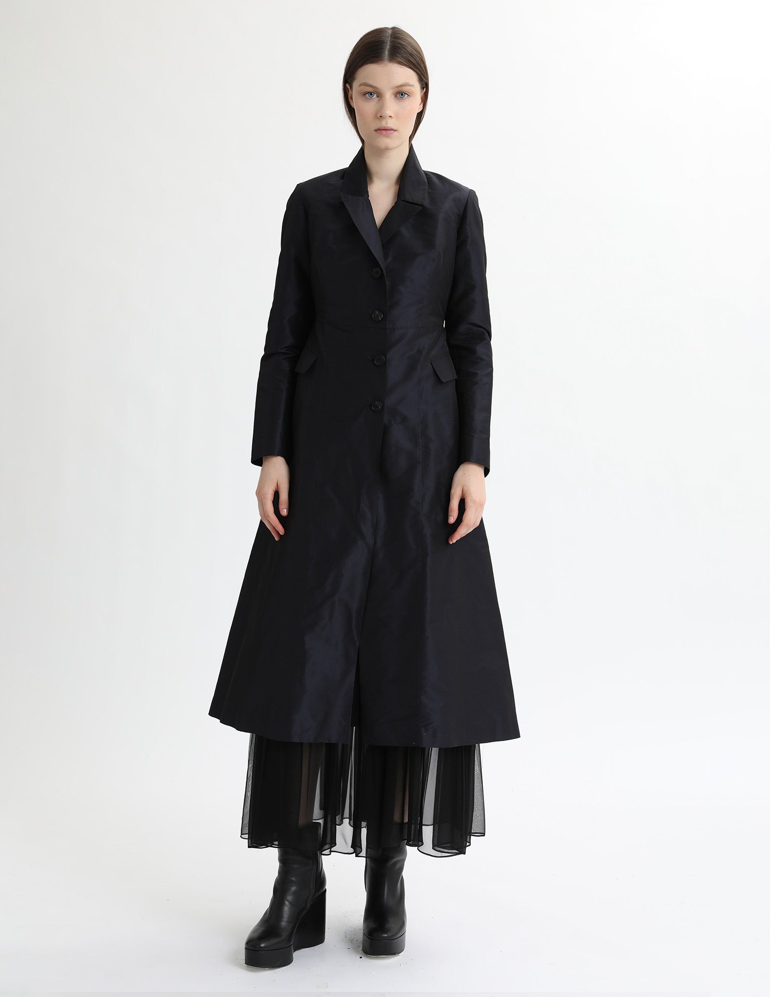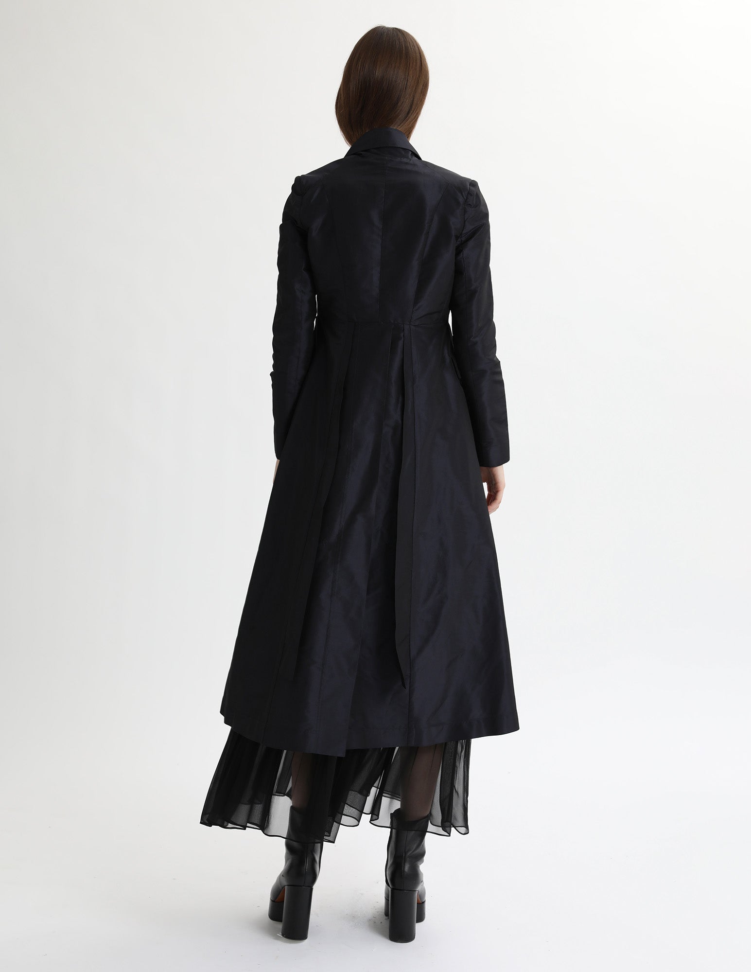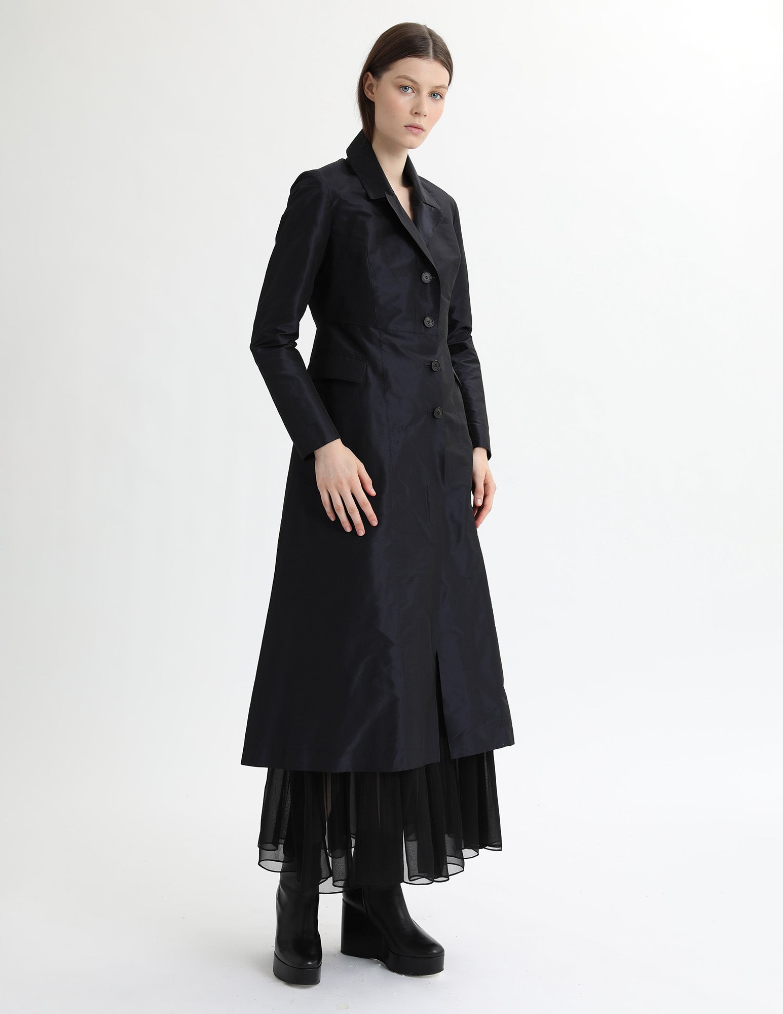 maxi taffeta jacket that has a modern silhouette, a structured collar, and interior ties for additional bustling. styled with the mulberry dress and mulberry slip.