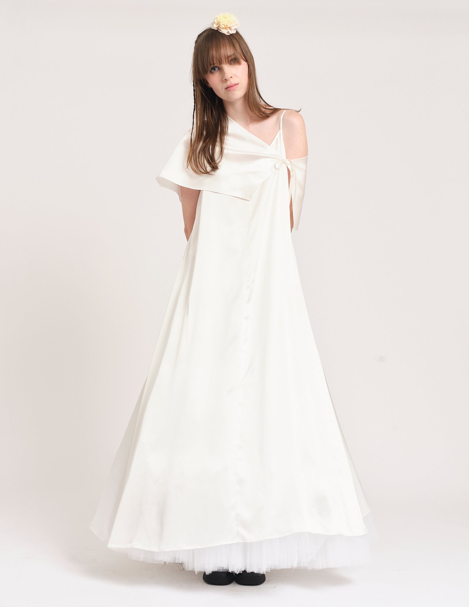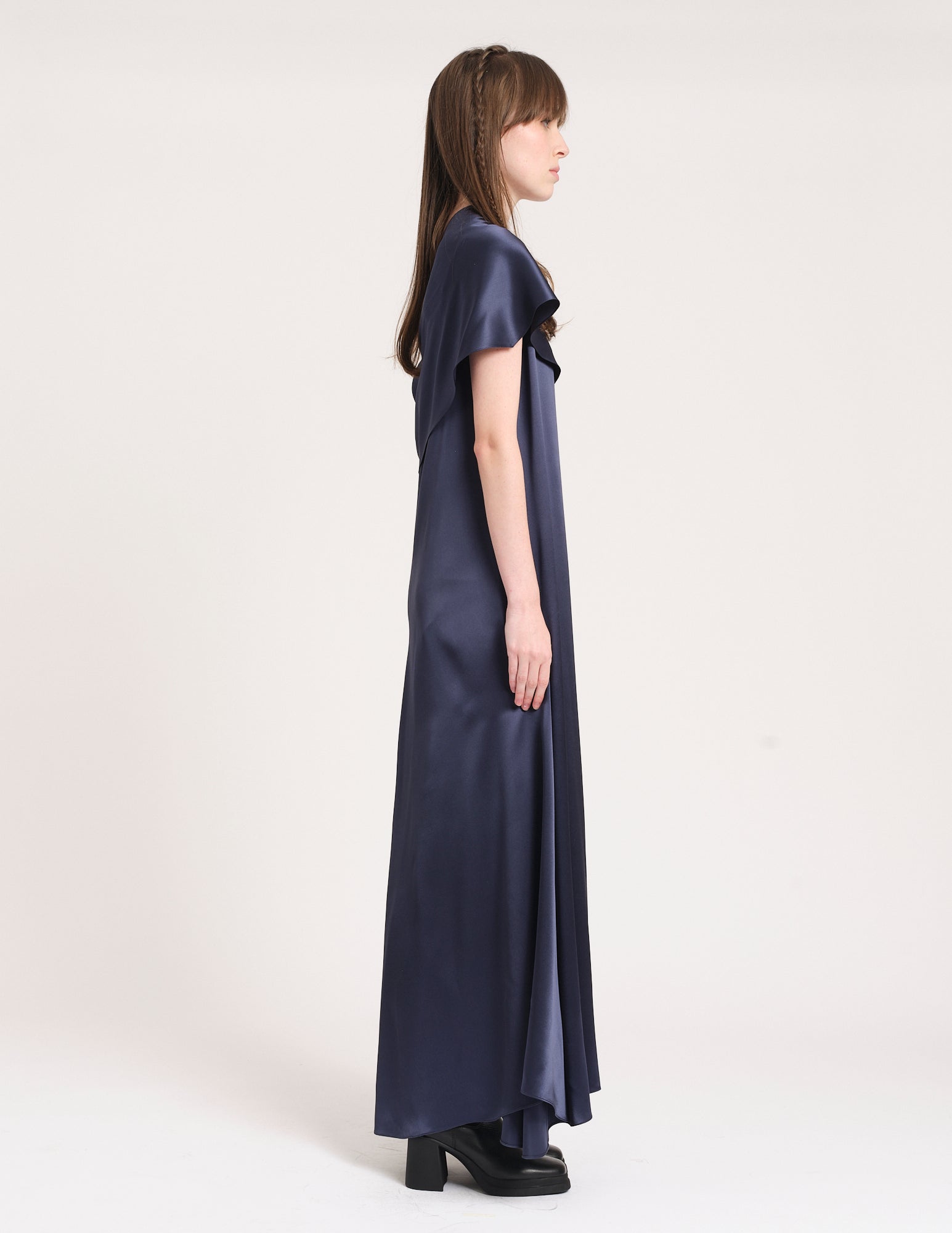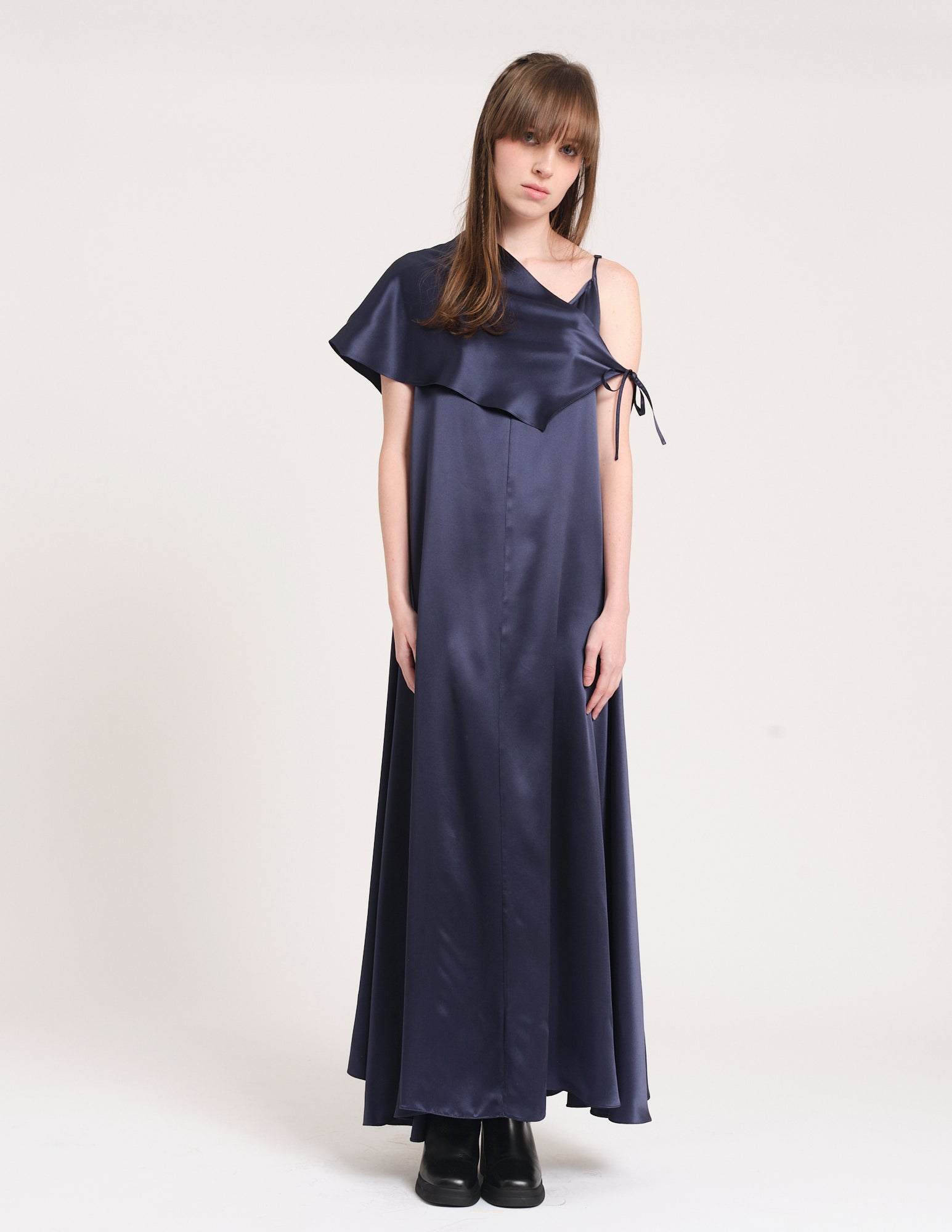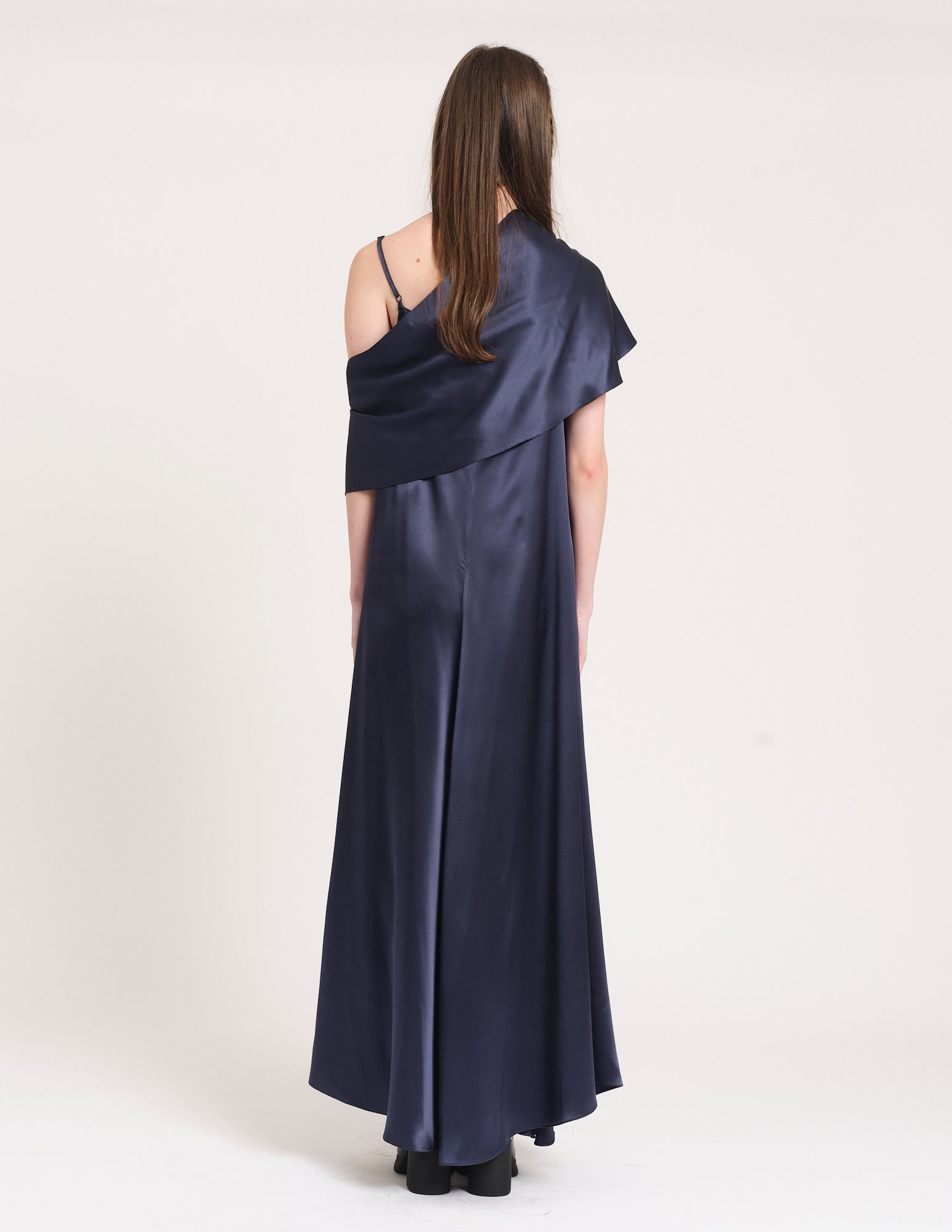 long panelled charmeuse maxi dress with adjustable straps, elegant silhouette, and asymmetric shawl.