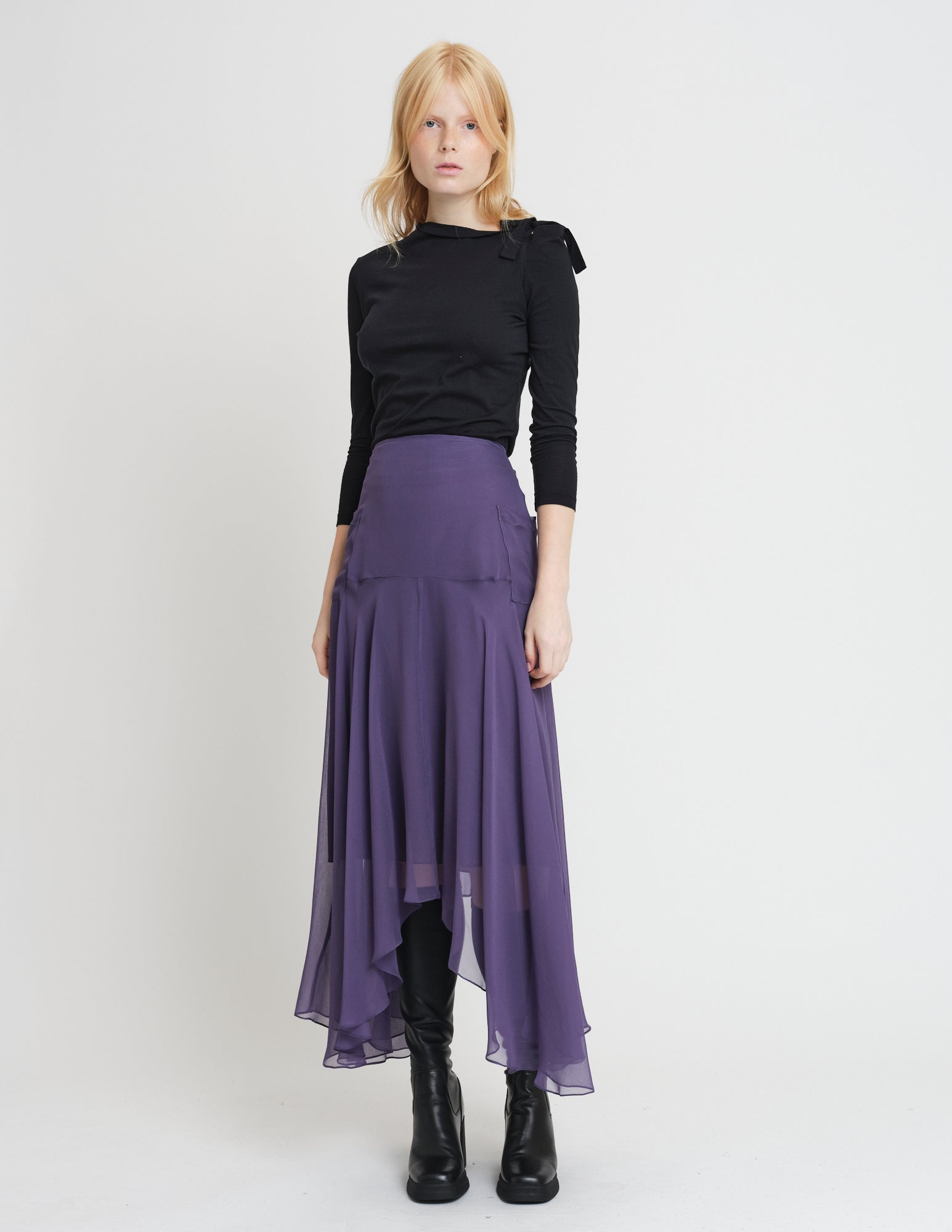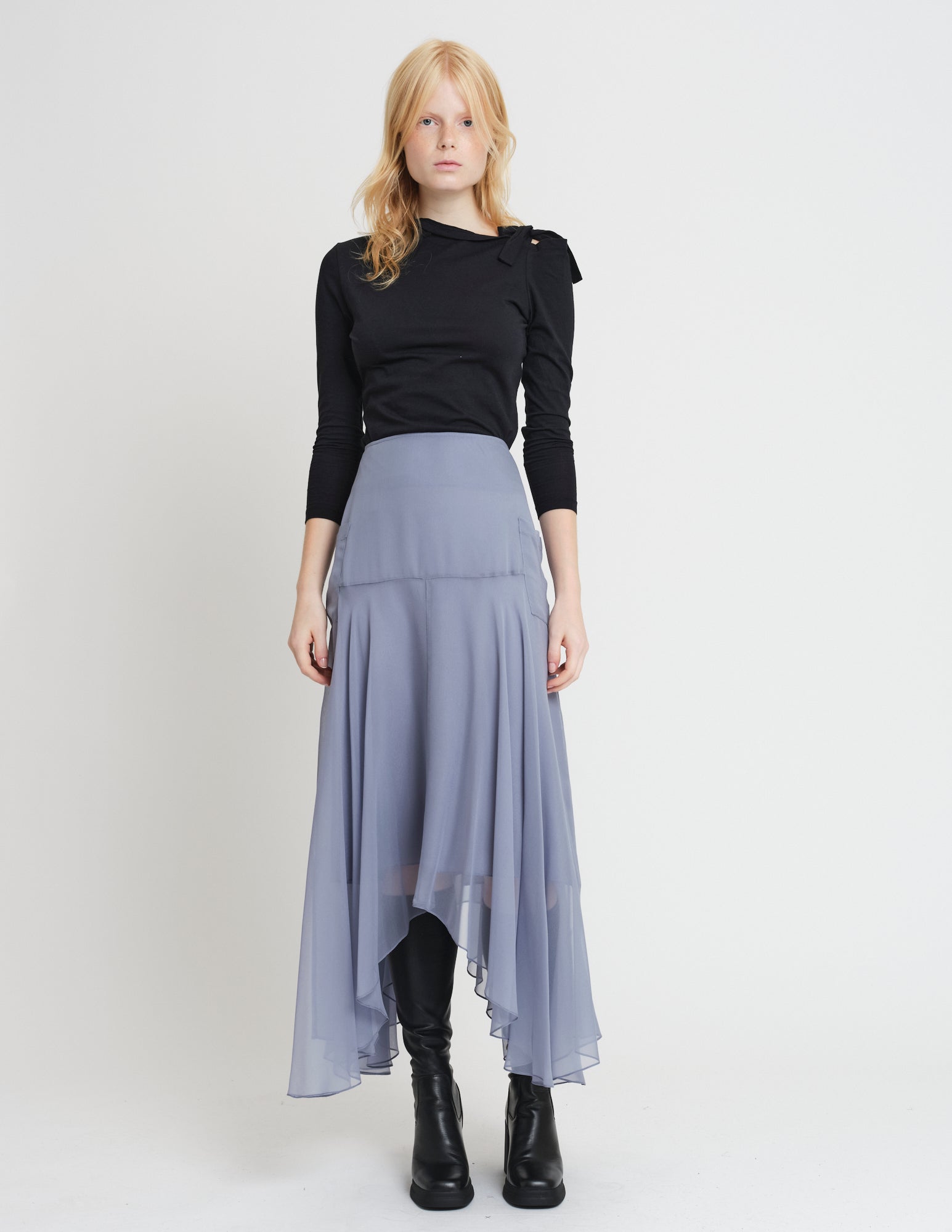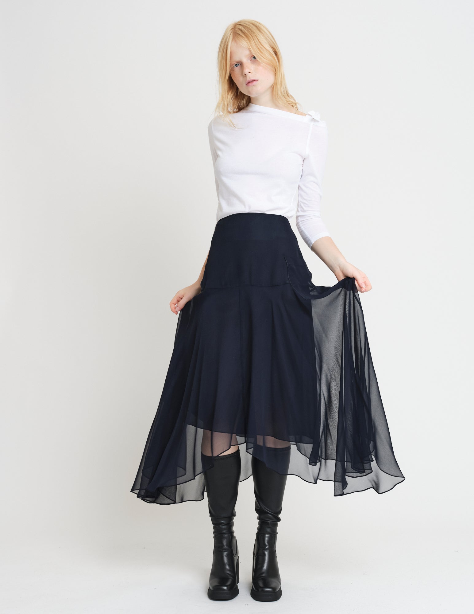romantic midi silk chiffon skirt with fitted yoke and extended side drapes with patch pockets.