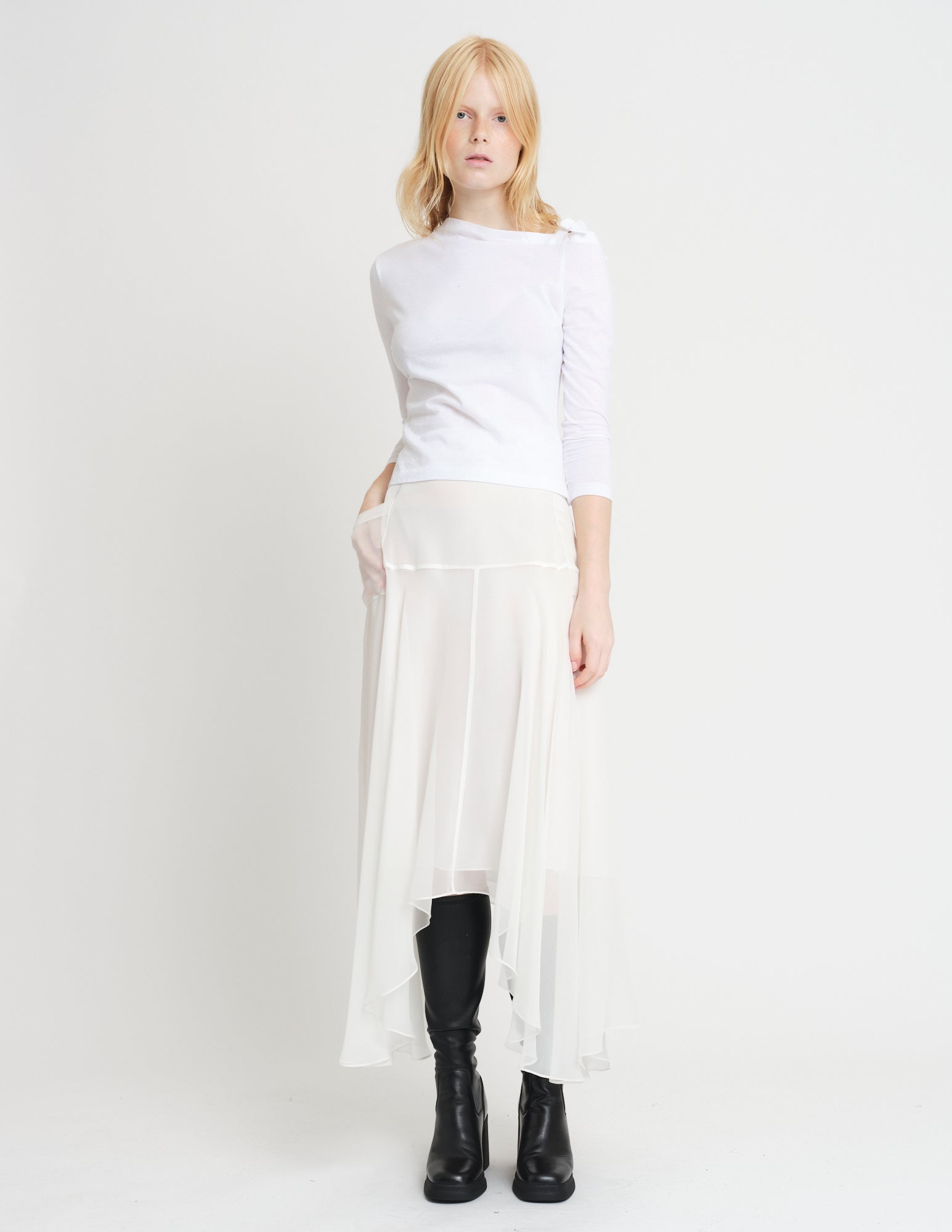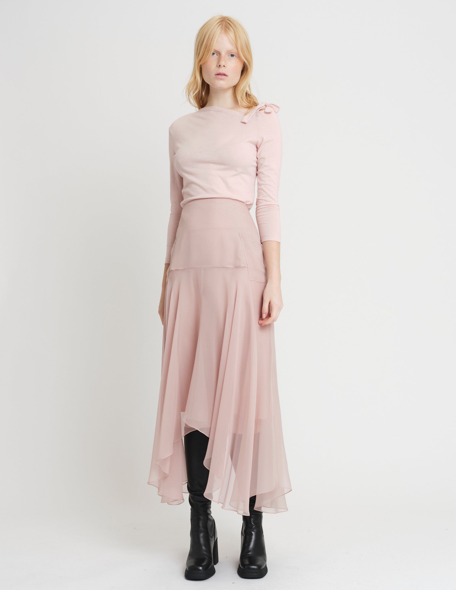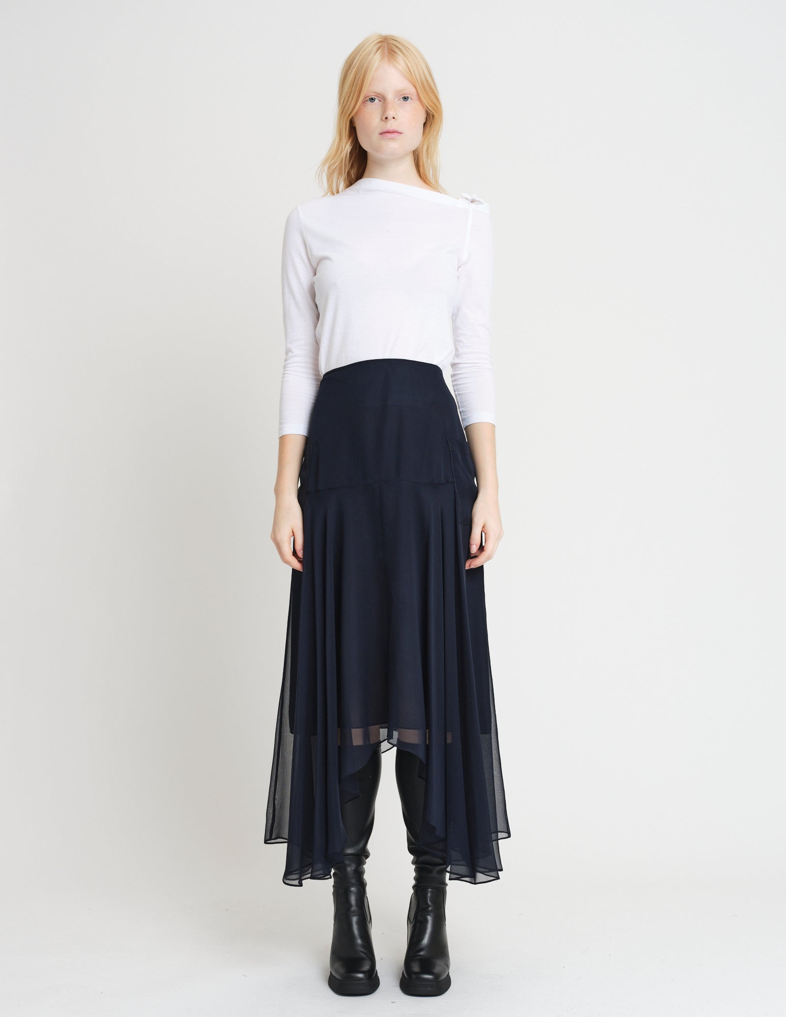 romantic midi silk chiffon skirt with fitted yoke and extended side drapes with patch pockets.