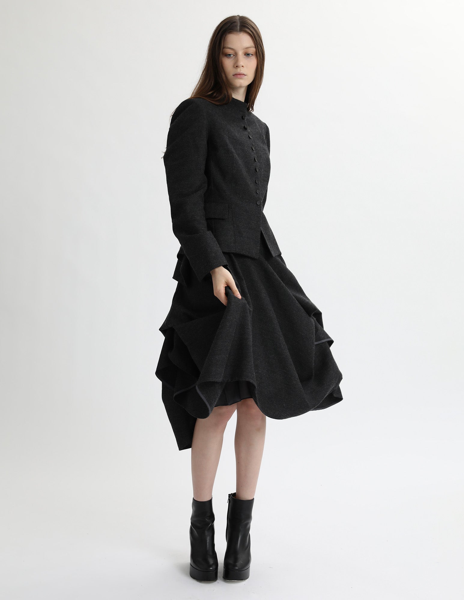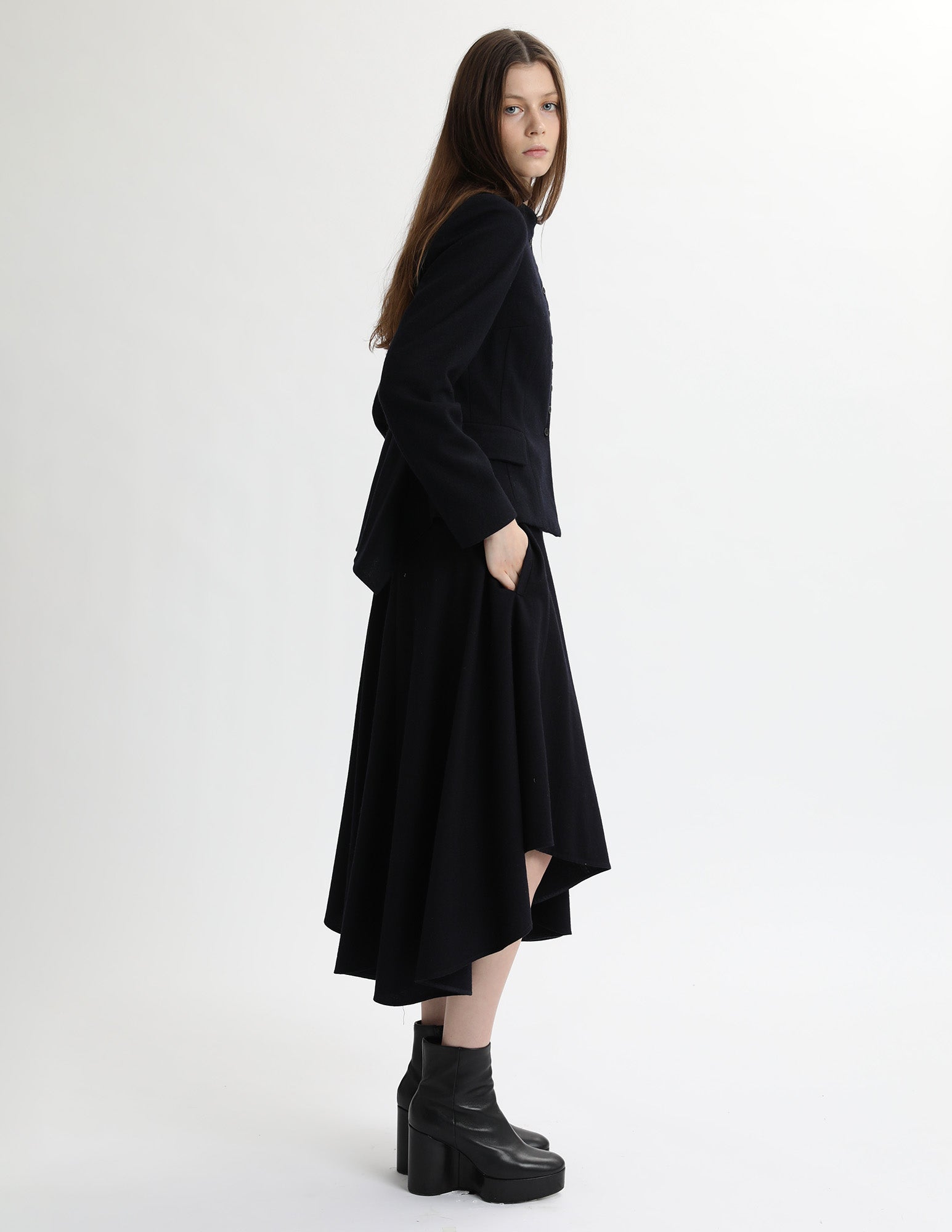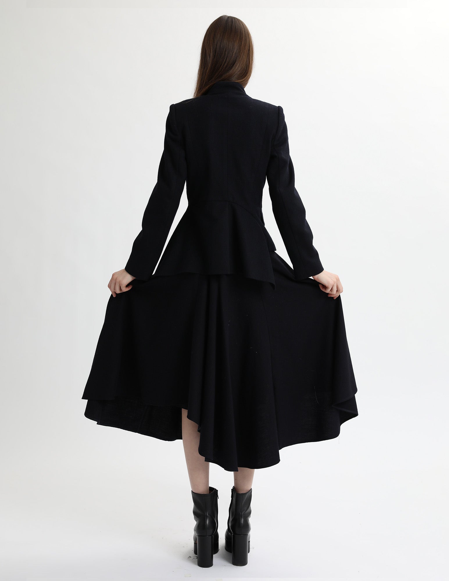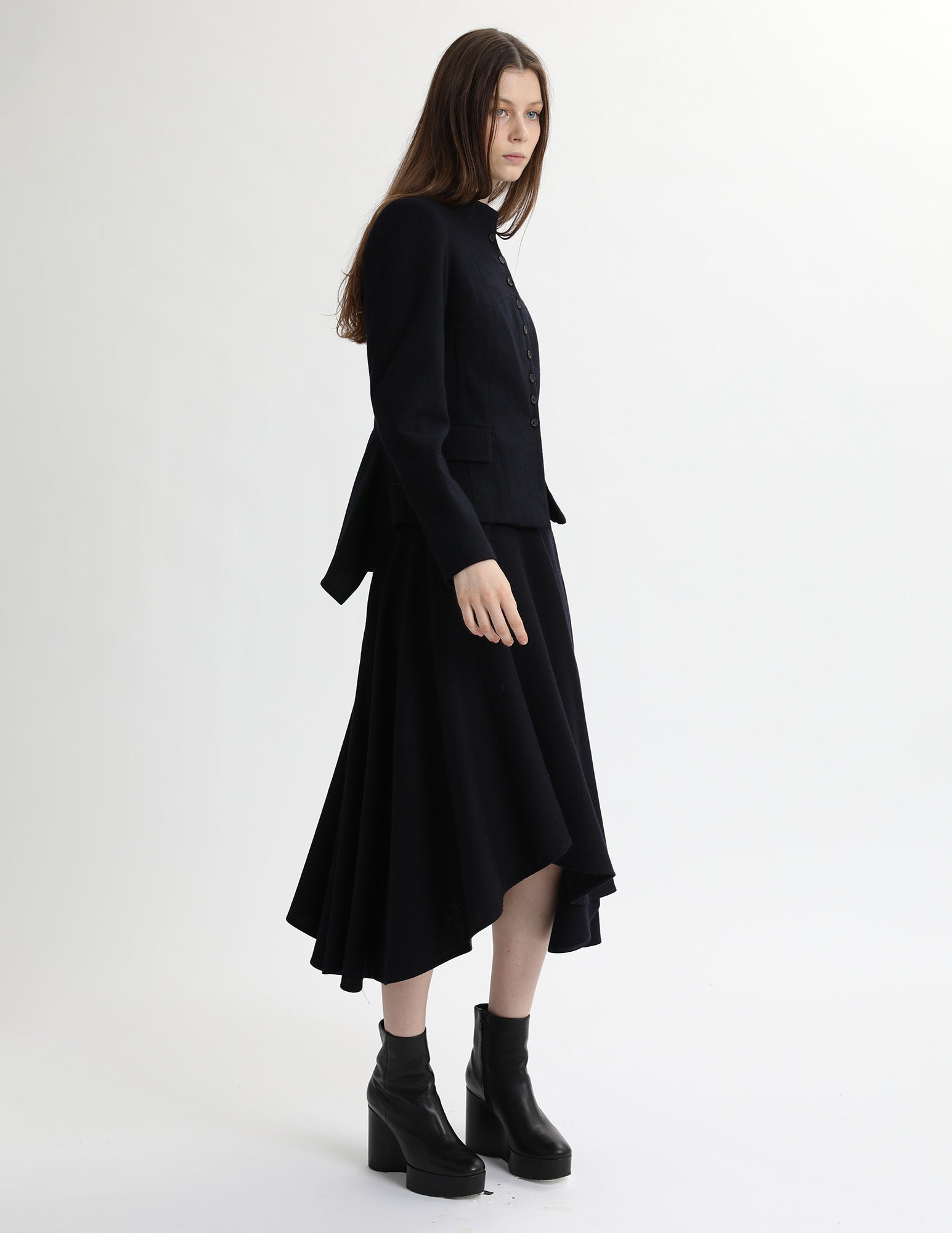 fitted jacket with a front button closure, high collar, and a rounded flair panel in the back that delicately drapes at the hips.