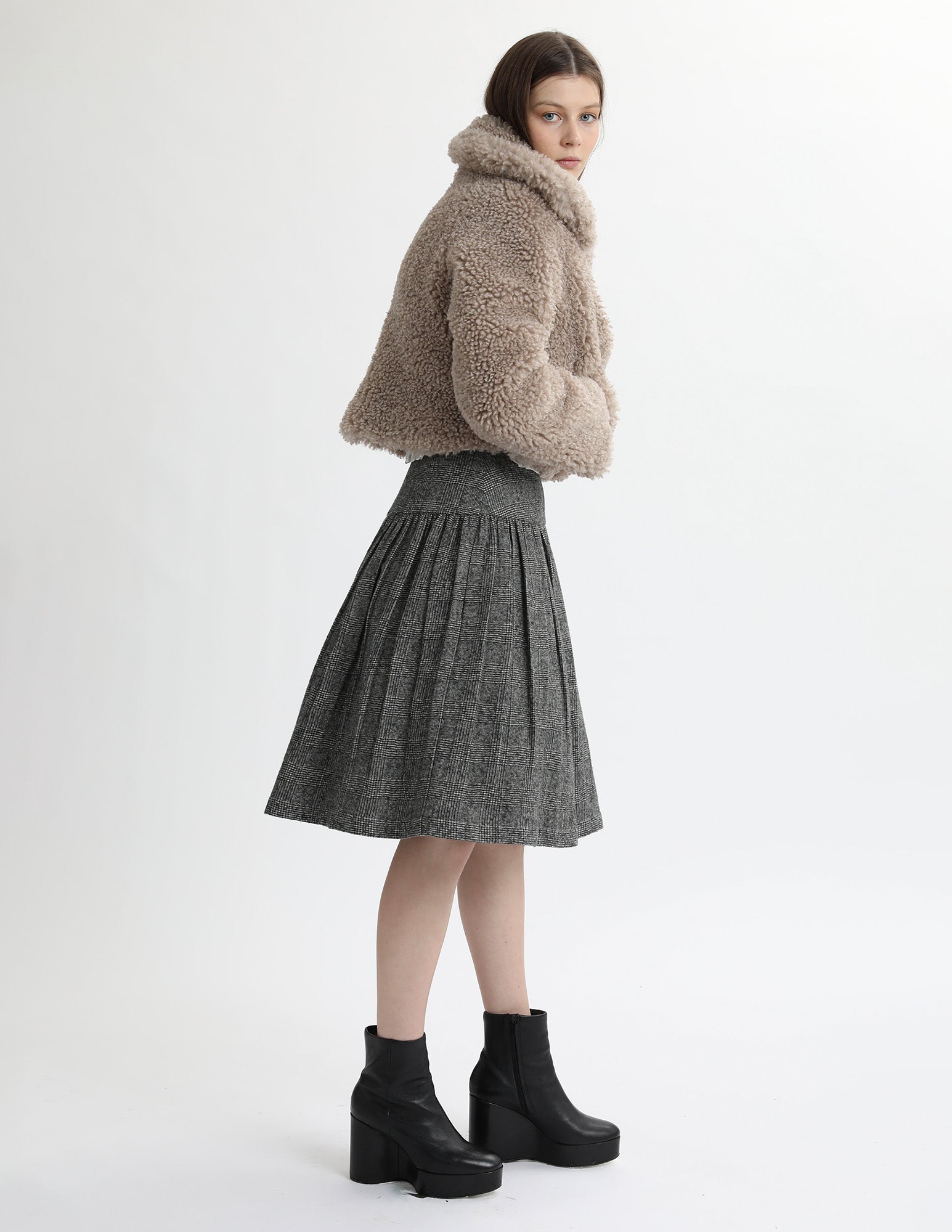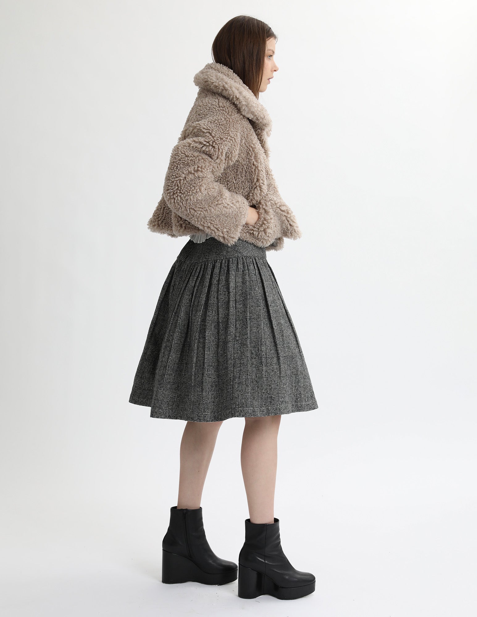 midi skirt with yoke, gathered panels, and optional ties to create drapery. styled with the lancaster coat.