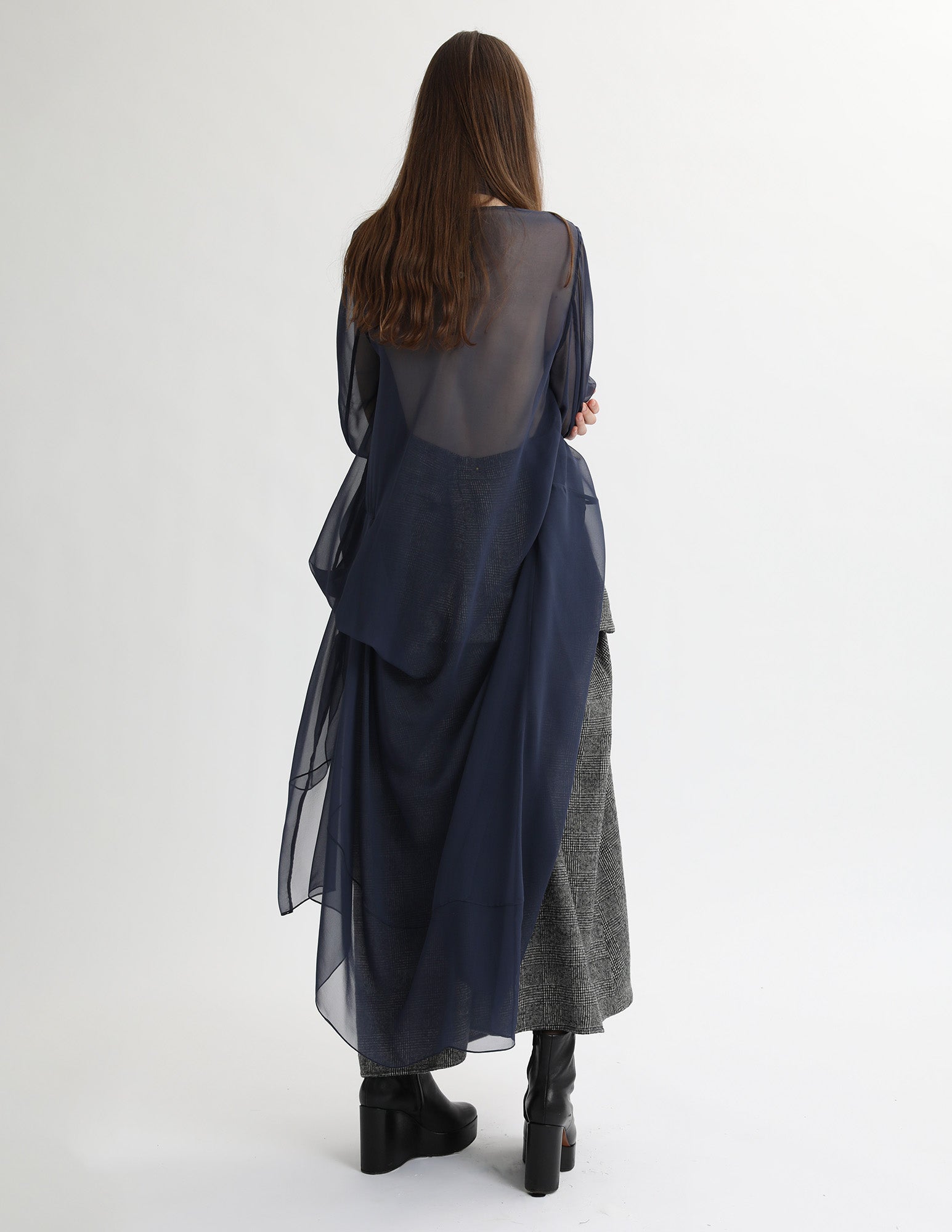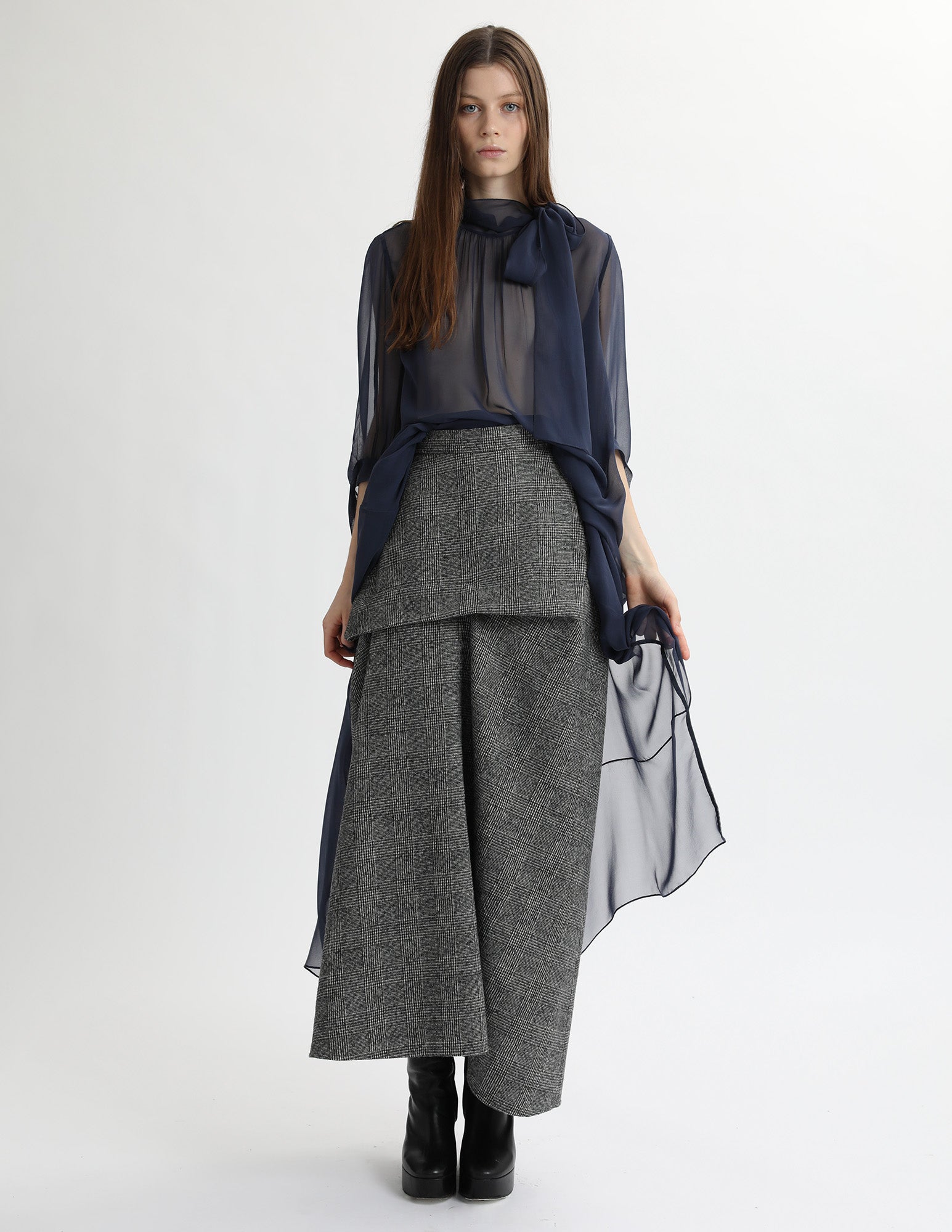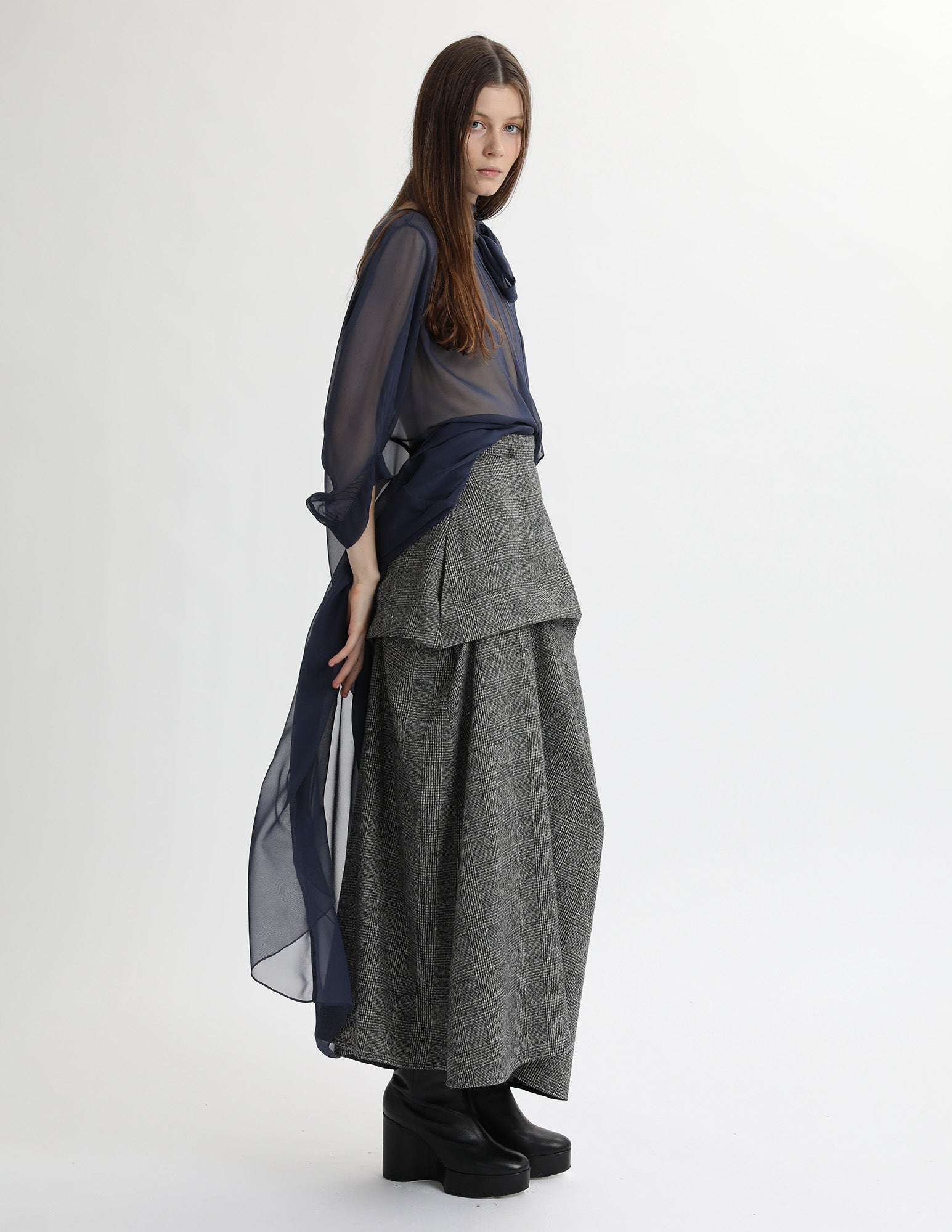 maxi skirt with a front and back fixed drape, a waistband, and interior pockets. styled with the uranus gown.