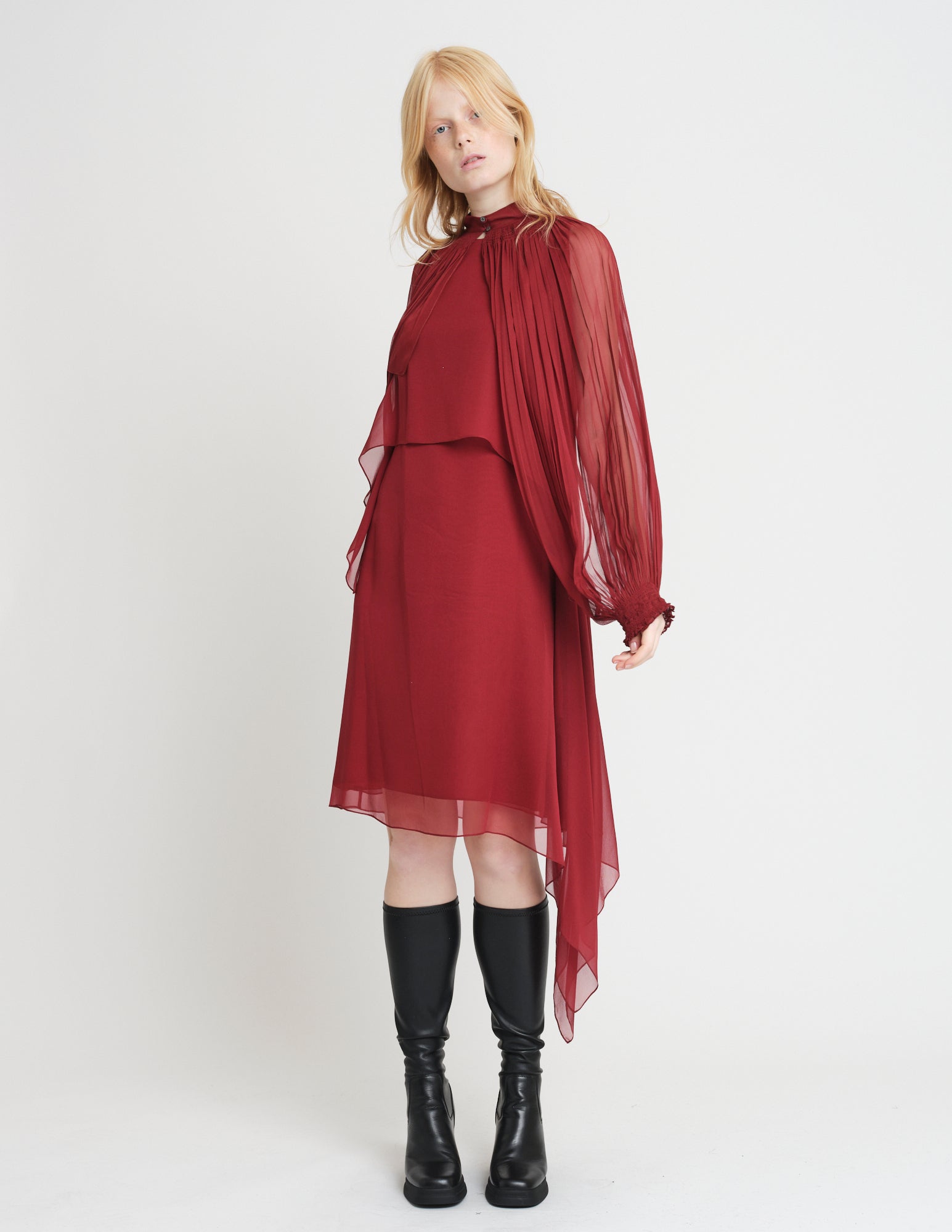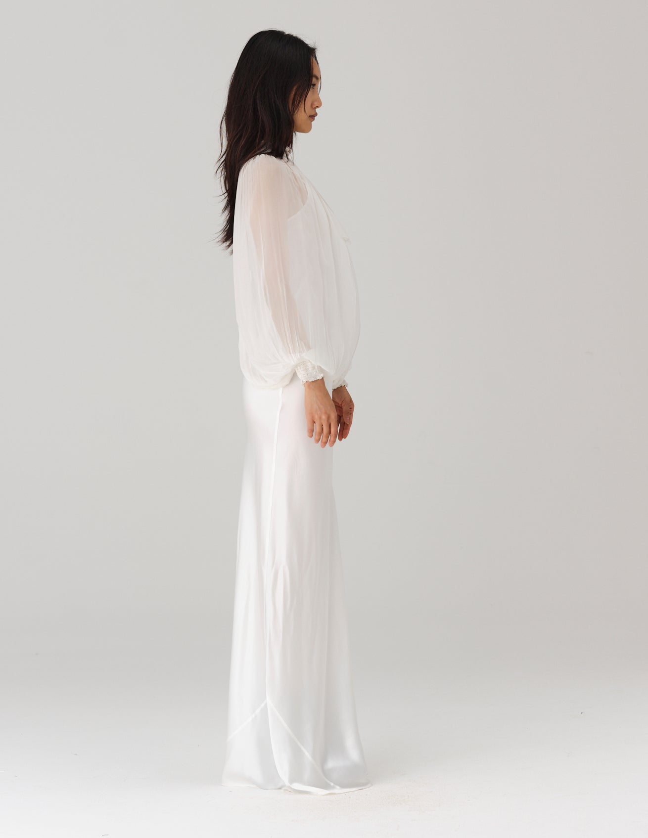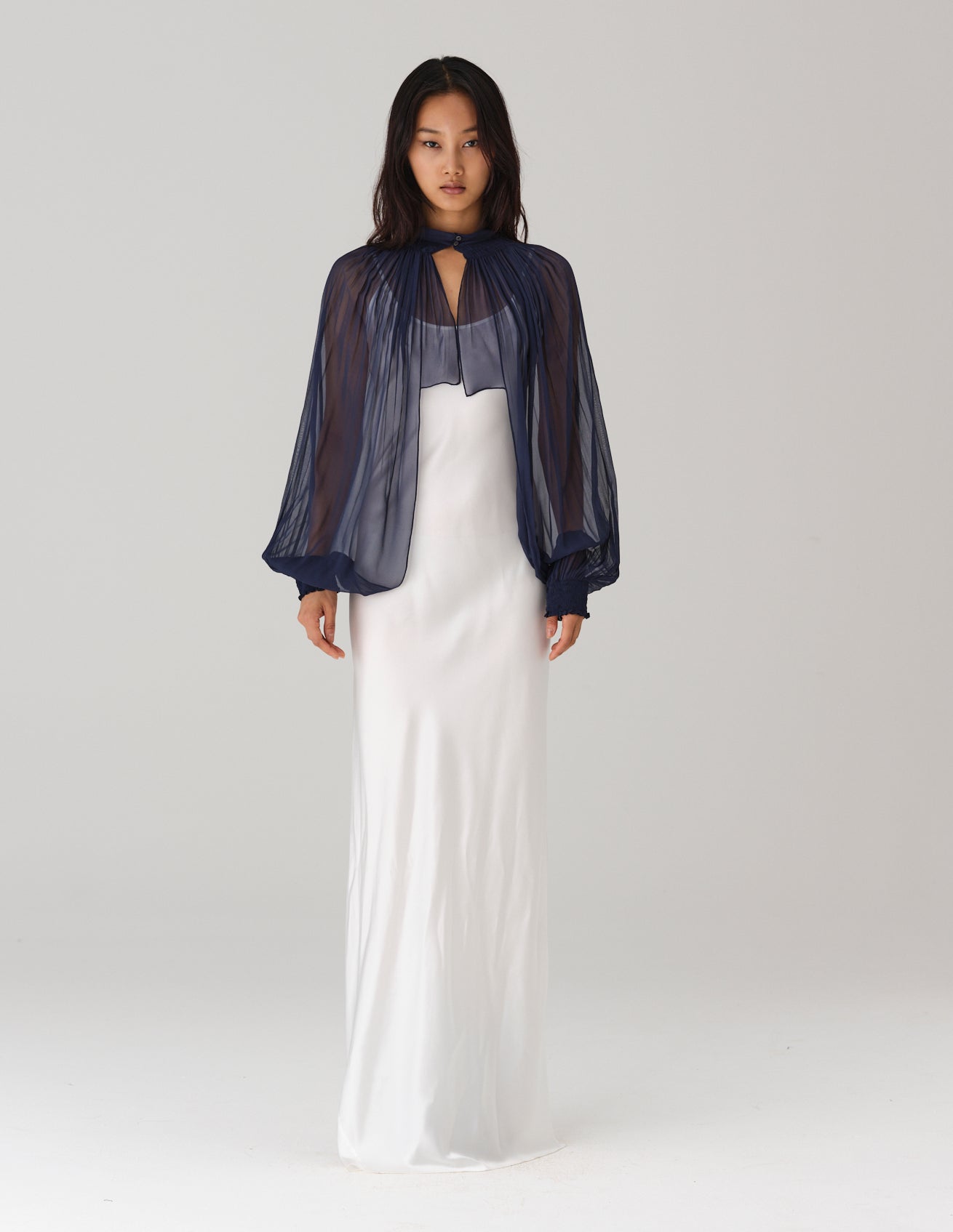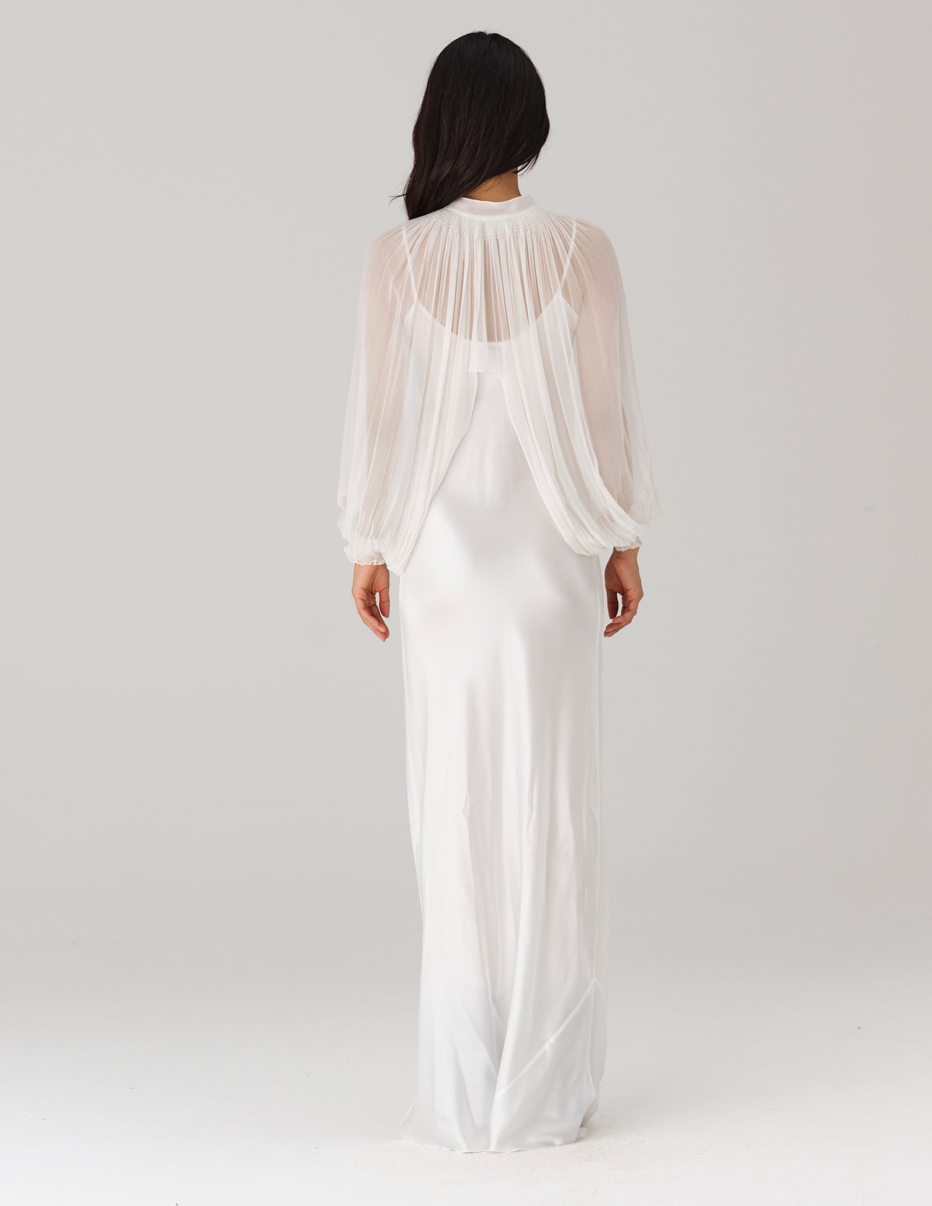 long, gathered chiffon sleeves featuring a high neck, center front button closure, and smocked cuffs. styled with the san slip dress and caelia dress.