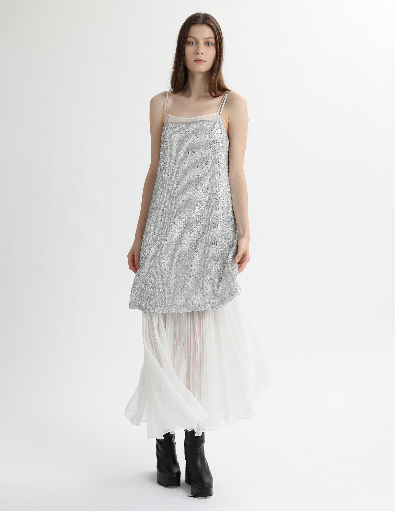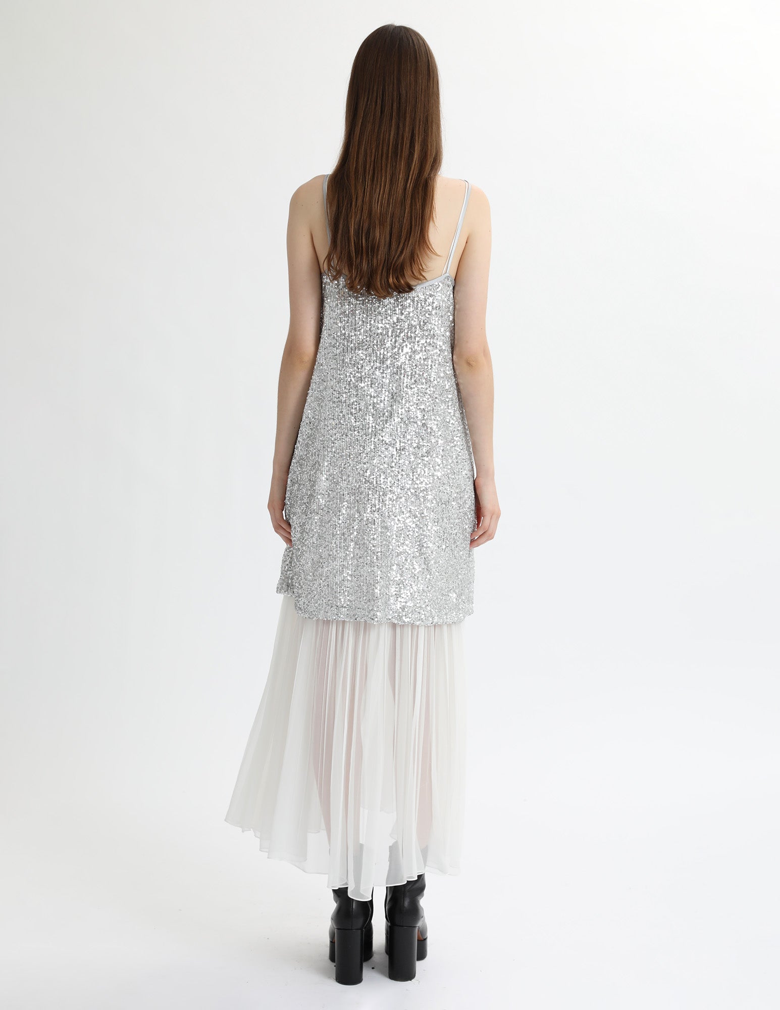 sequin mini dress with a loose silhouette and spaghetti straps, worn with the mulberry slip.
