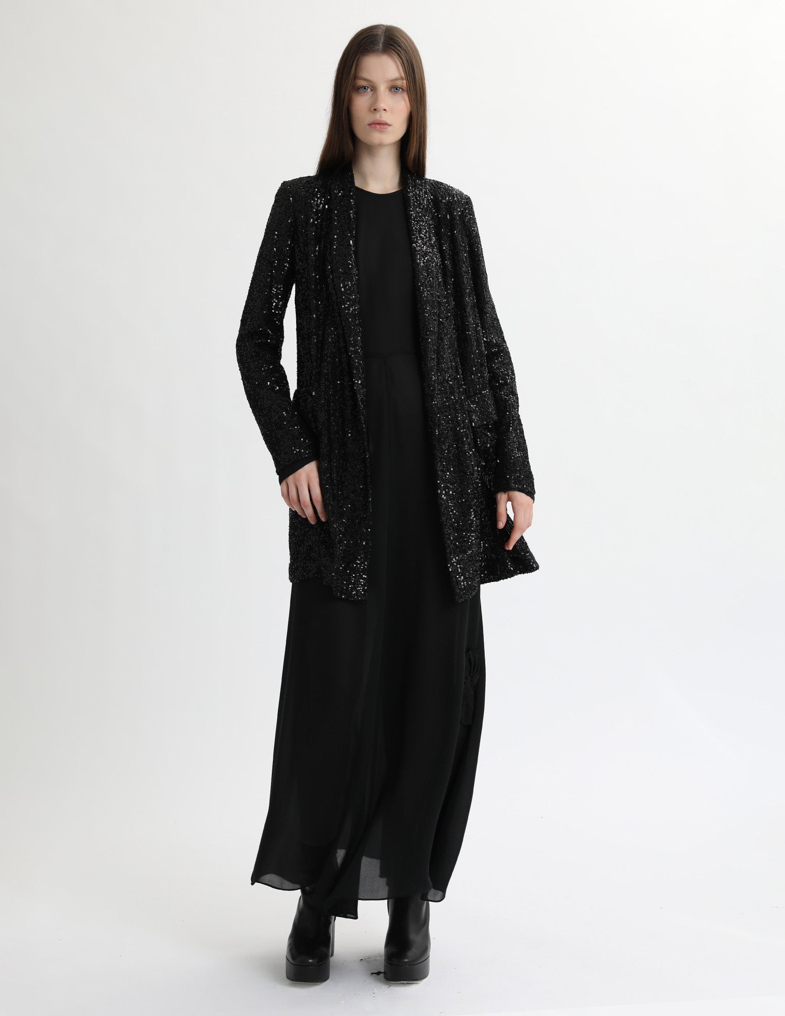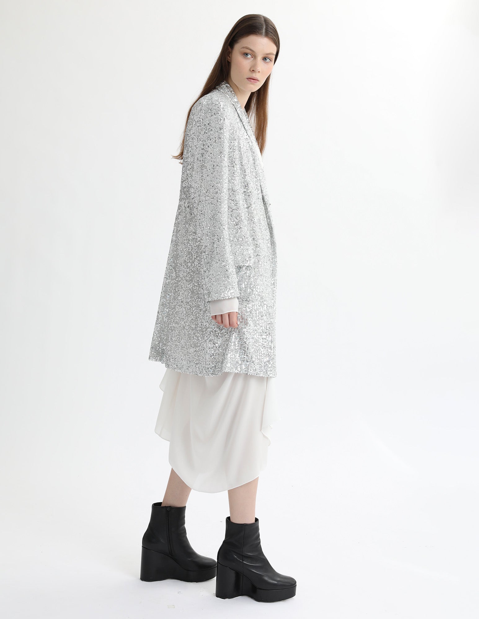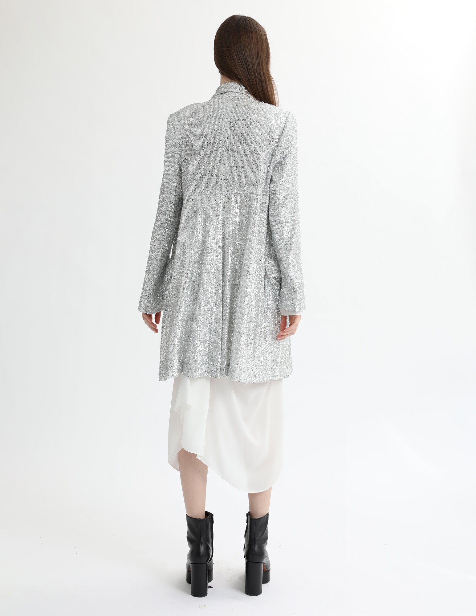 a glimmering sequin tuxedo jacket featuring a thin shawl collar and interior ties to adjust drape for added volume. styled with the edmund dress.