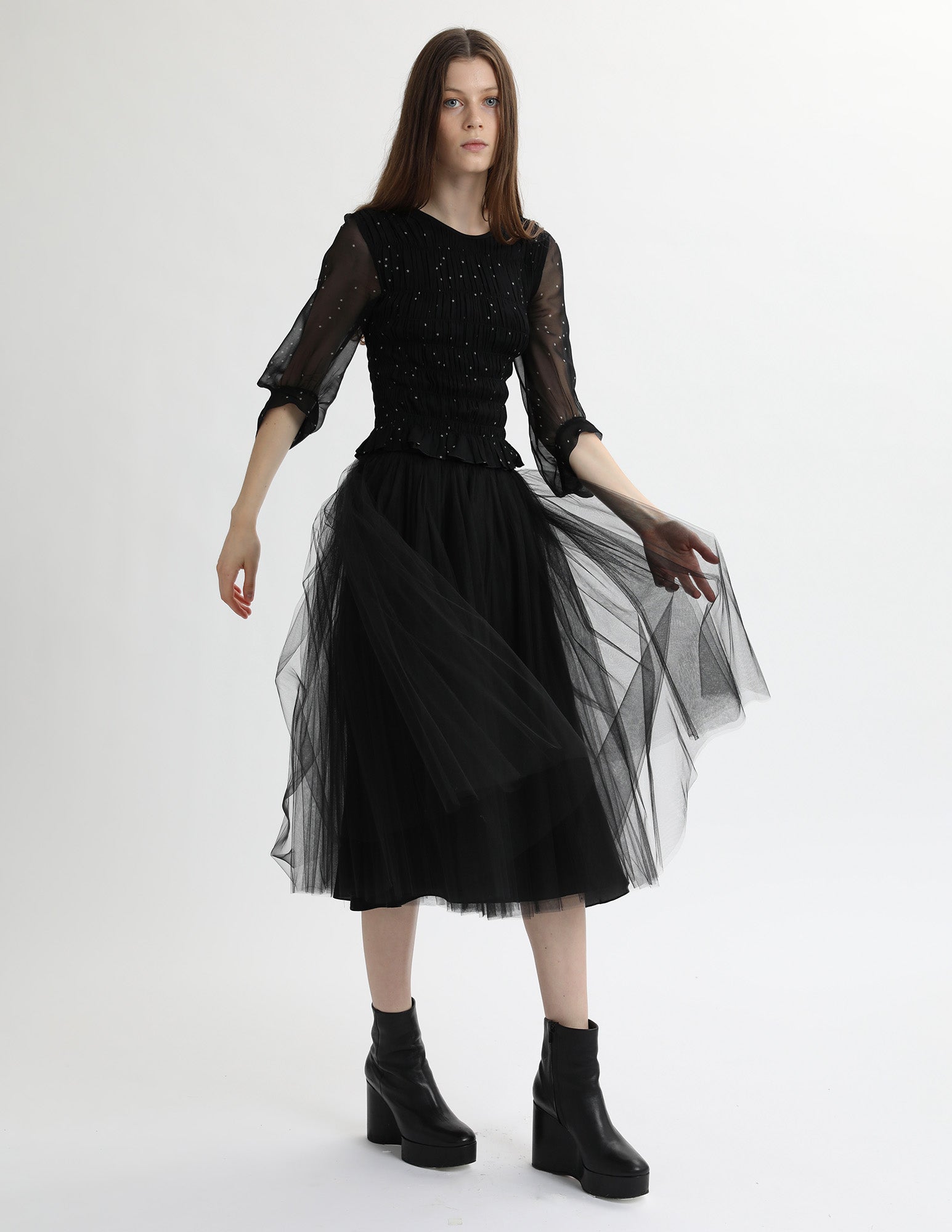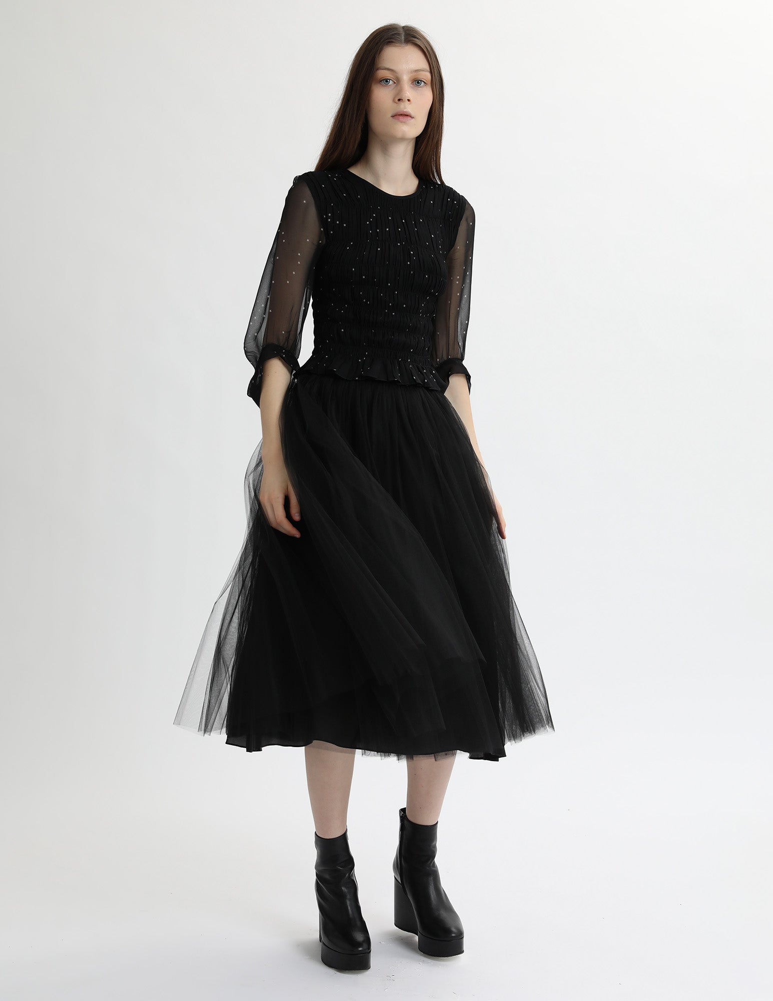 our signature star print in a fitted blouse with ruching and 3/4 length sleeves. styled with the daphne crinoline.