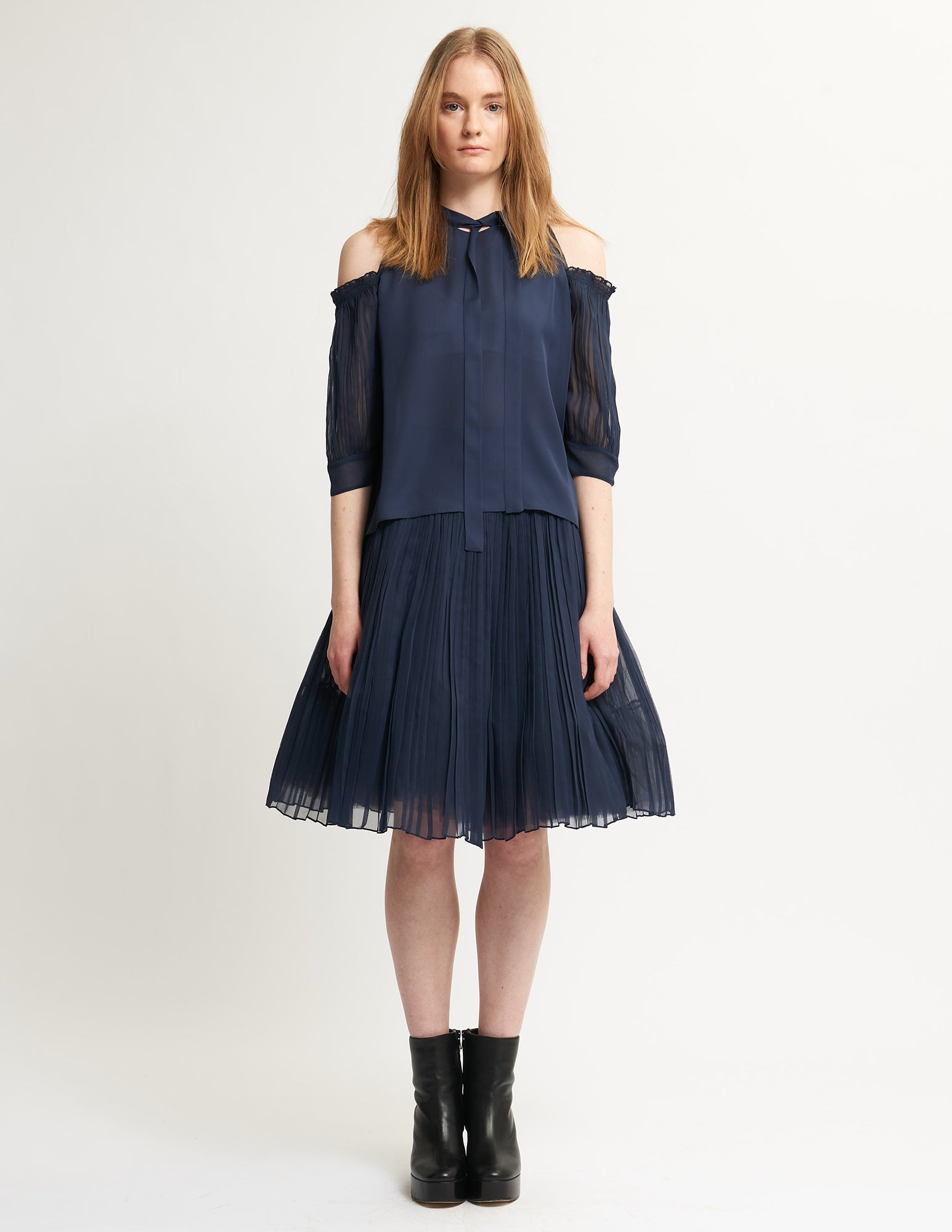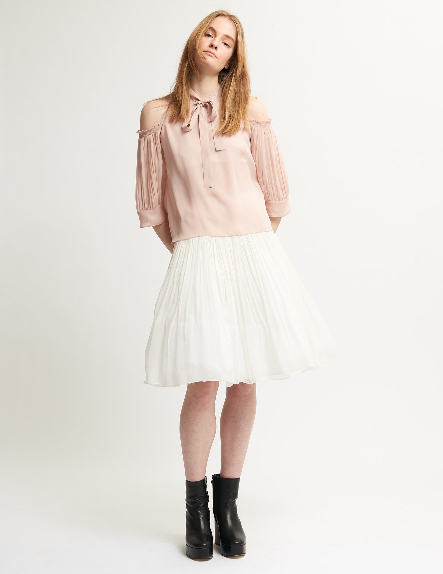 halter blouse that has a relaxed fit, pleated sleeves, and a neck tie. styled with the galileo skirt.