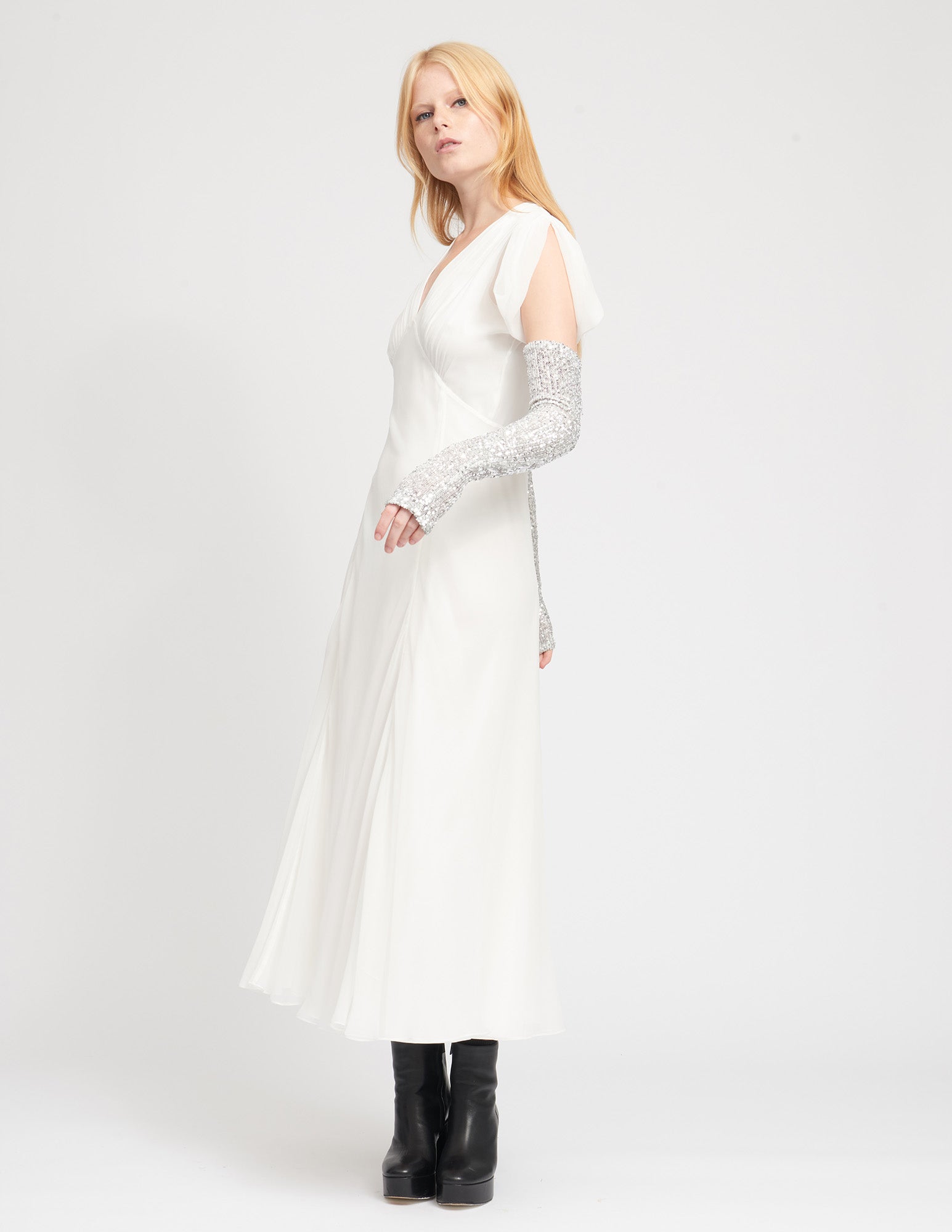 the opera gloves add a dreamy touch of brilliance to any outfit. crafted from hand-sewn french sequin fabric in our signature fingerless glove. styled with the dafodil dress.