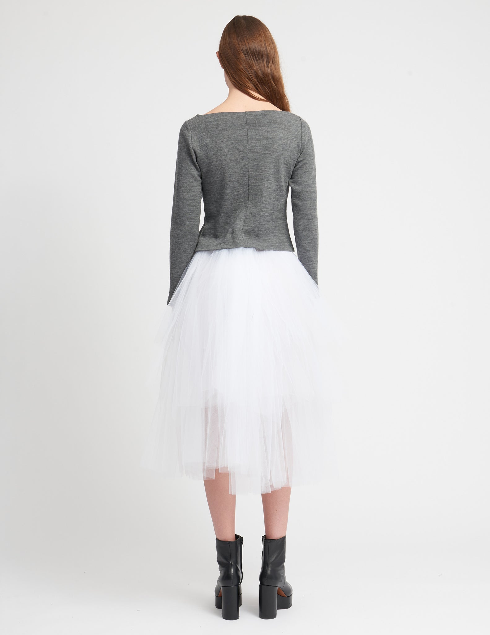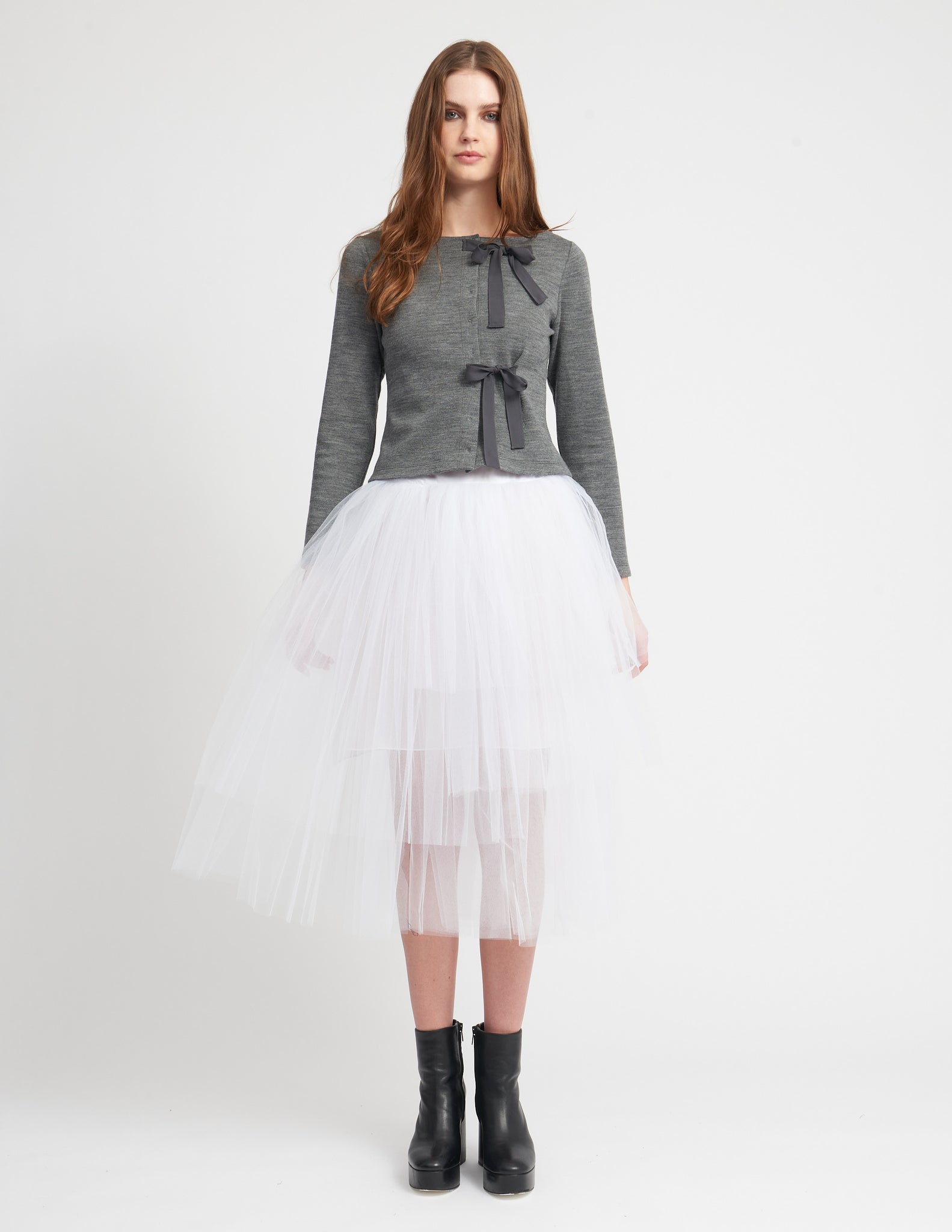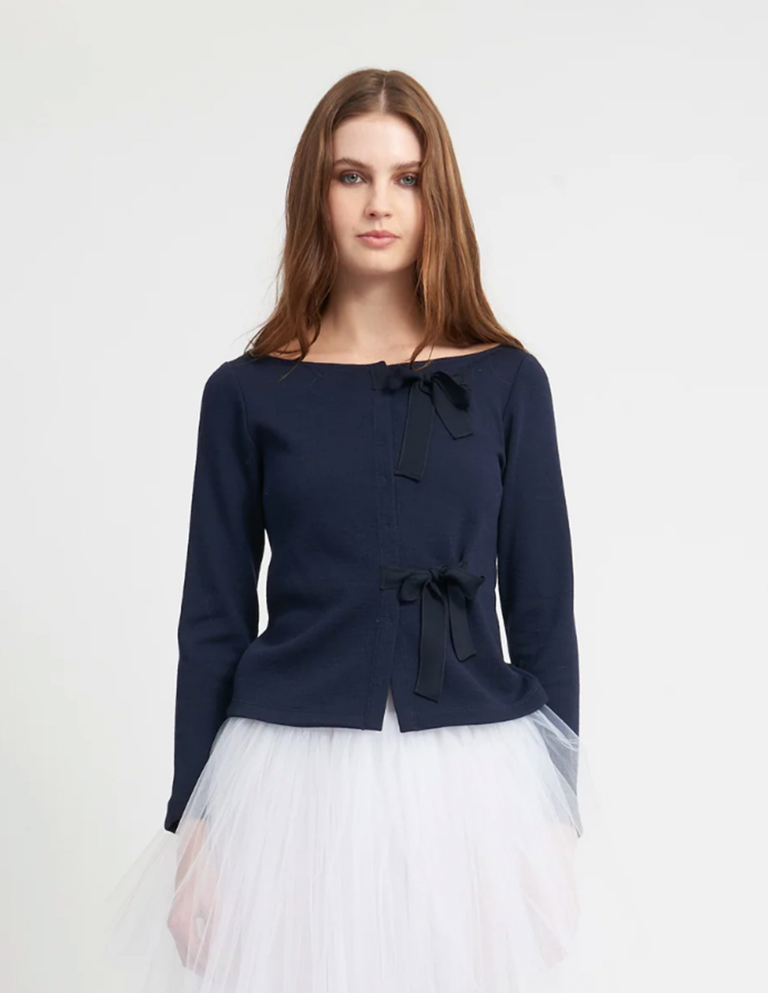 semi-fitted cardigan with an open neckline, front snap closure, and delicate bow details. styled with the irena crinoline.