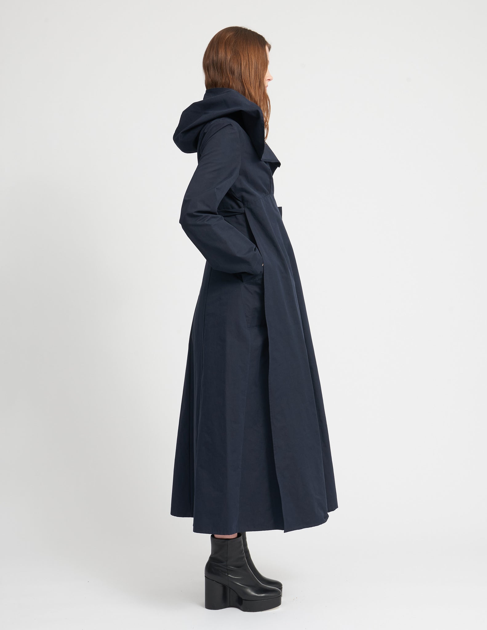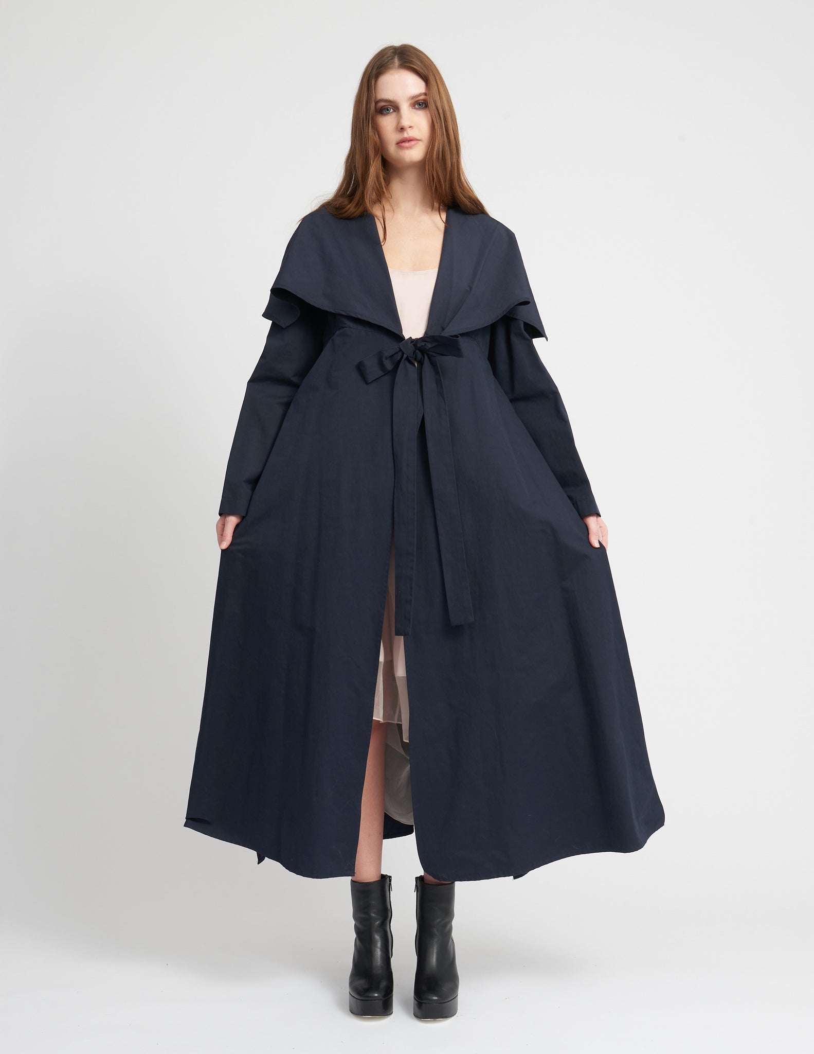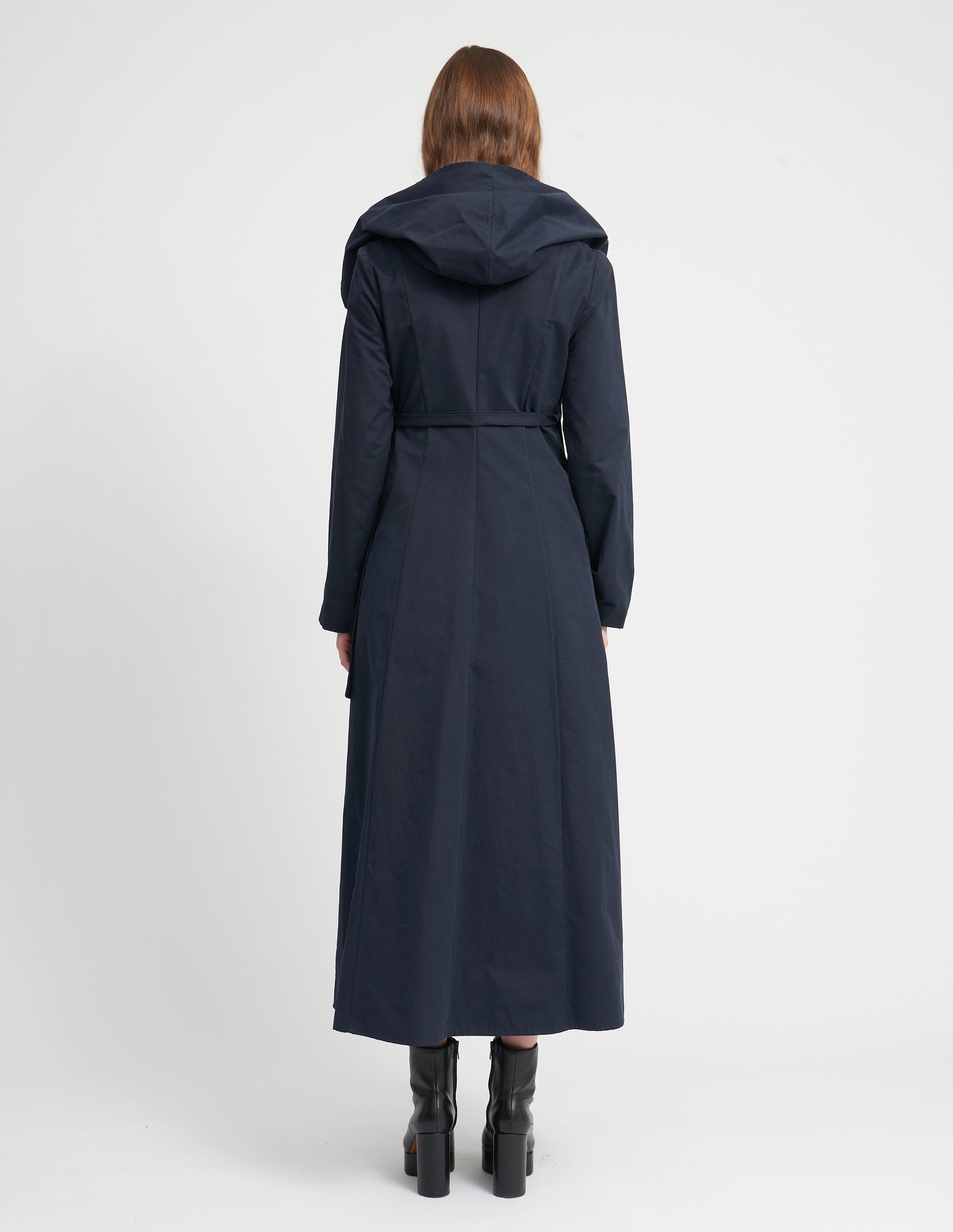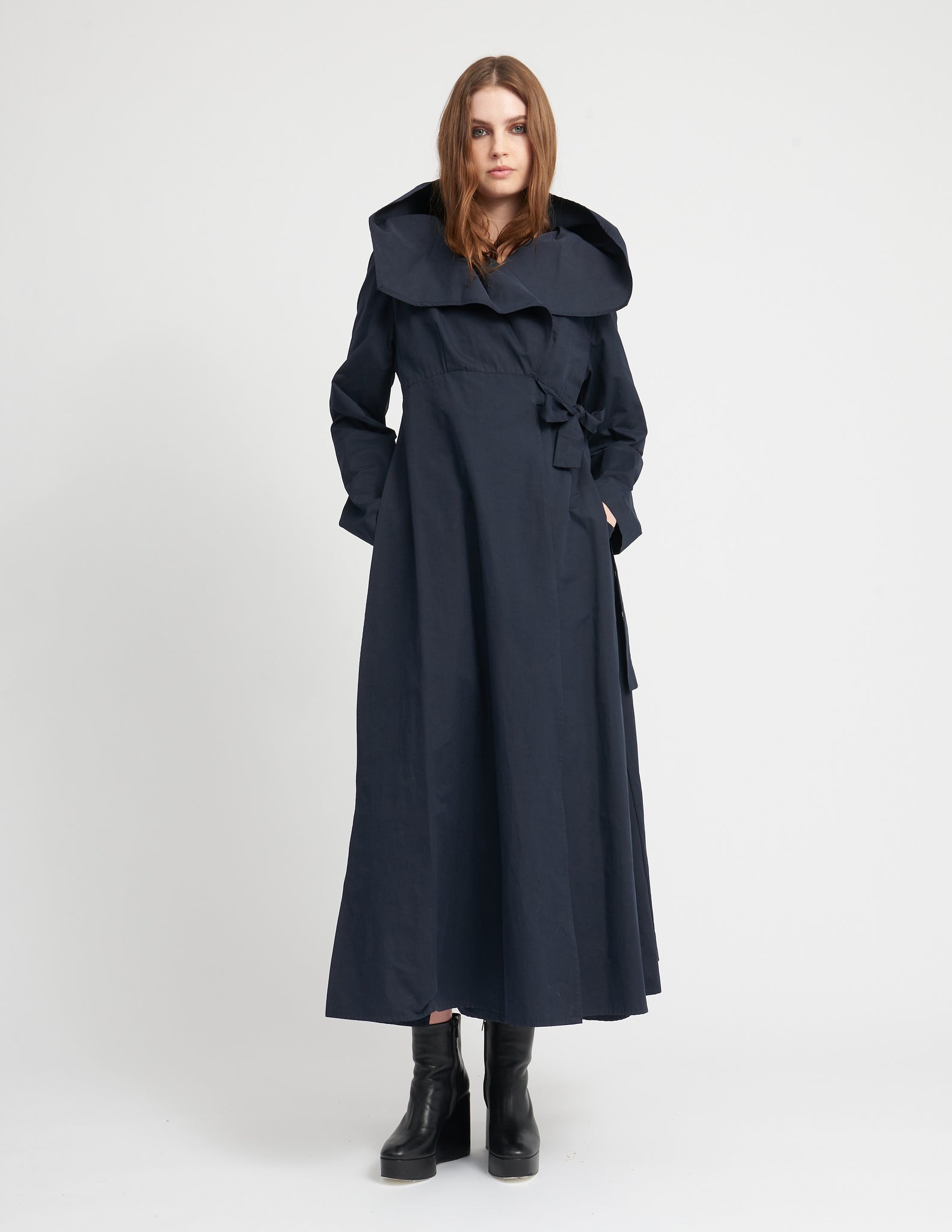 maxi water repellent jacket with an oversized collar and hood, a wrap tie closure, and high side slits. styled with the minerva gown.