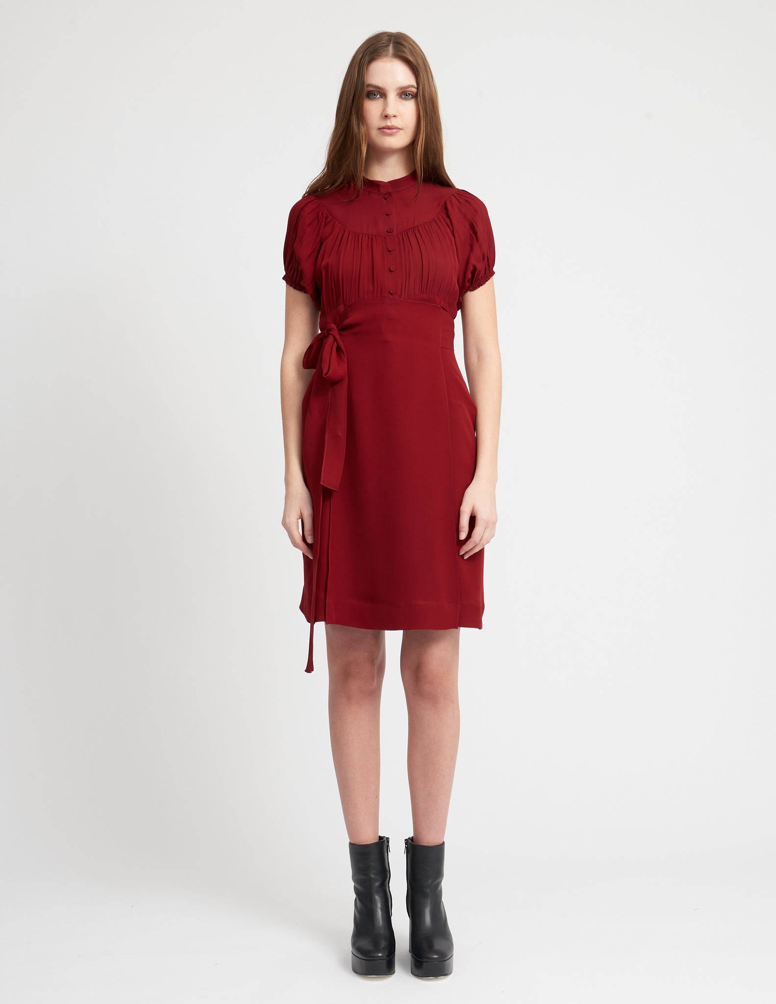 mini dress with a high neck, ruching detailing, front button closure, and a panel that wraps around to create a bow detail. styled with the irena crinoline.