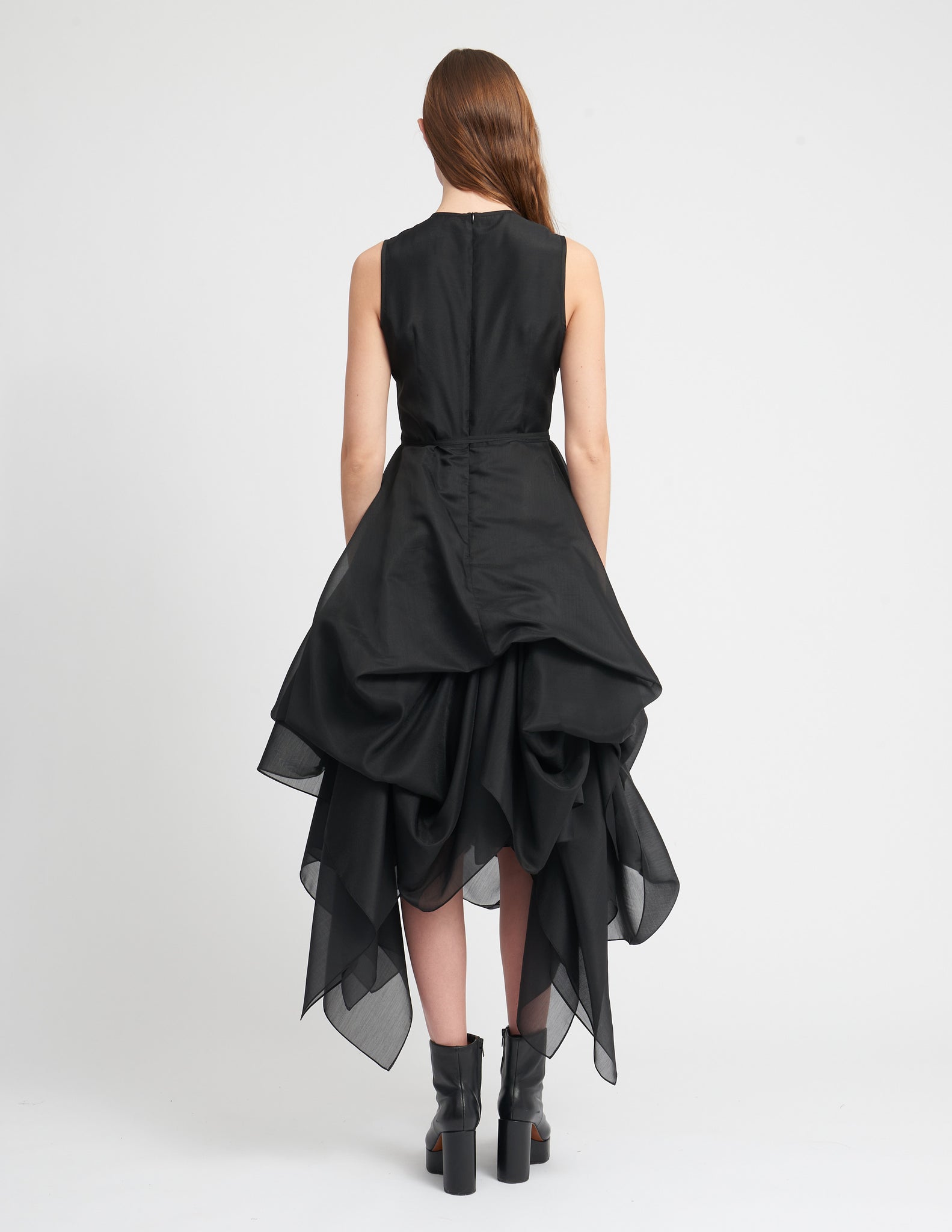gown with a fitted bodice and an extravagant sculptural skirt with drapery.