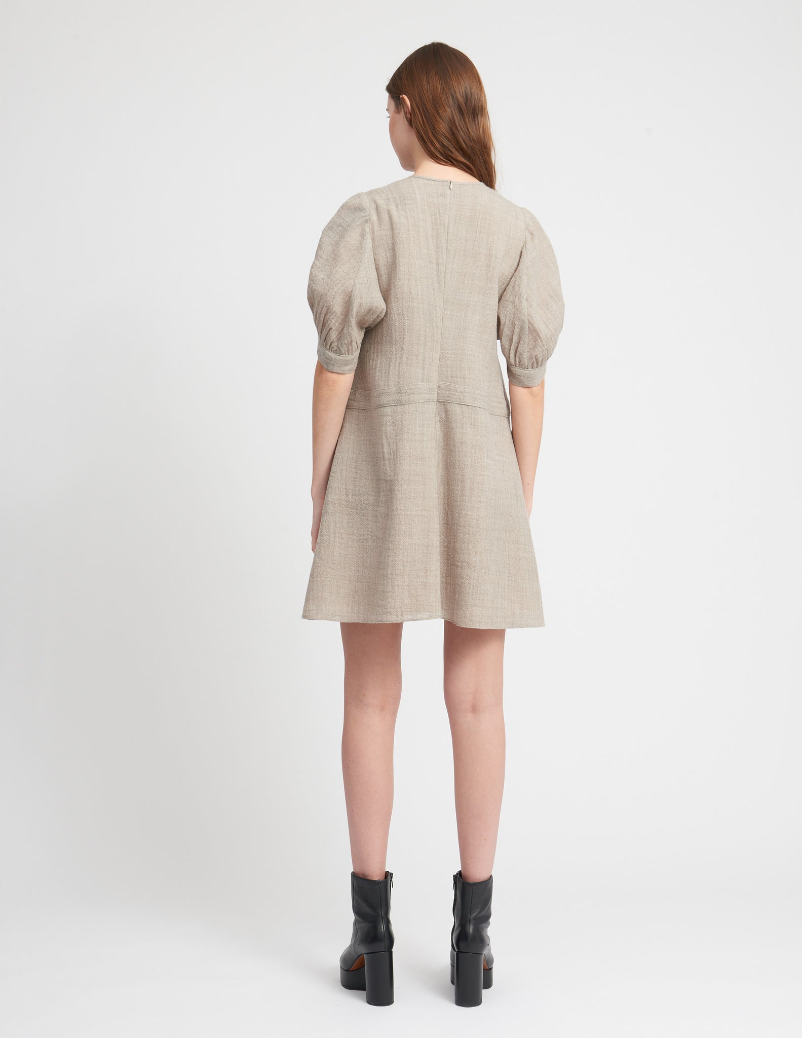 short dress with a loose silhouette that has a delicate bow detail with voluminous sleeves.