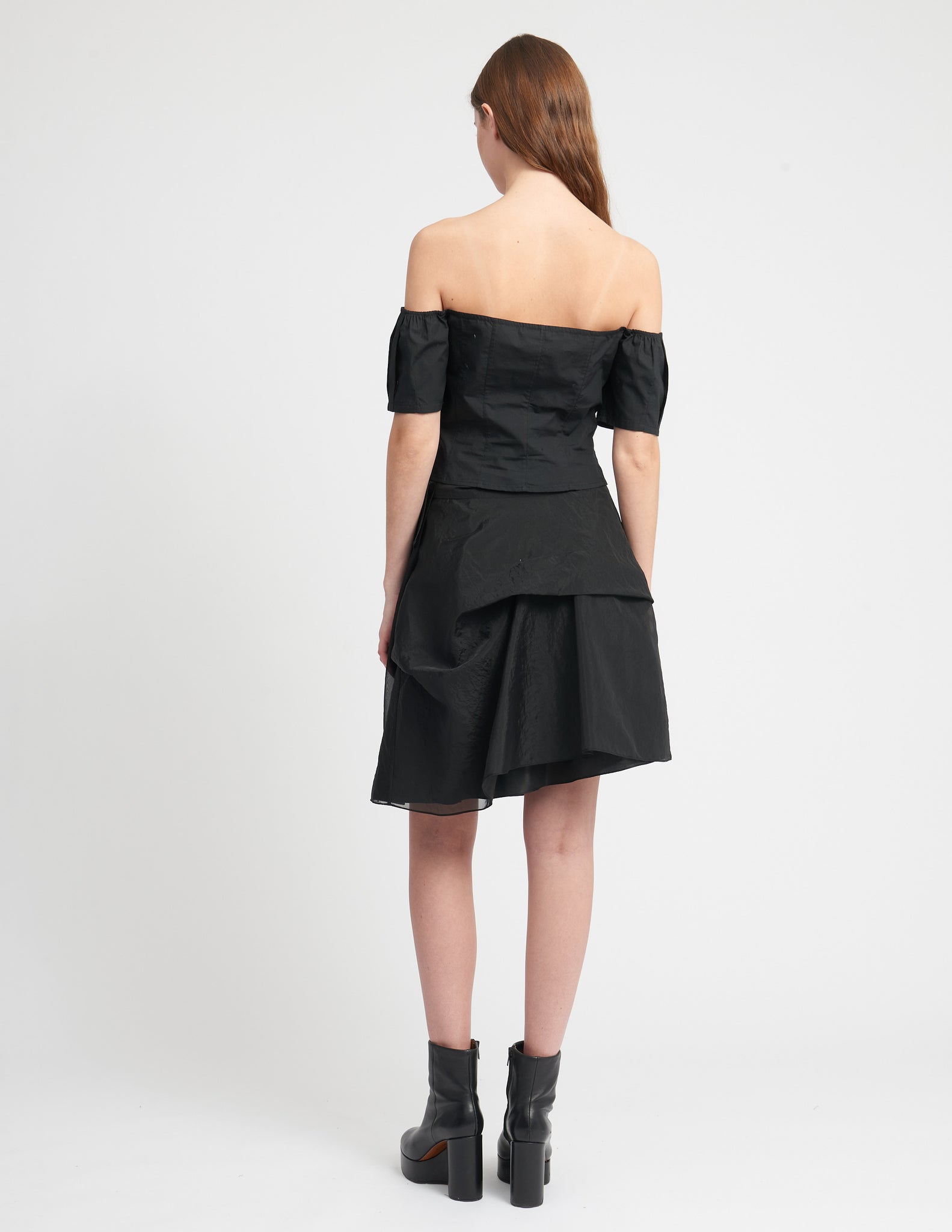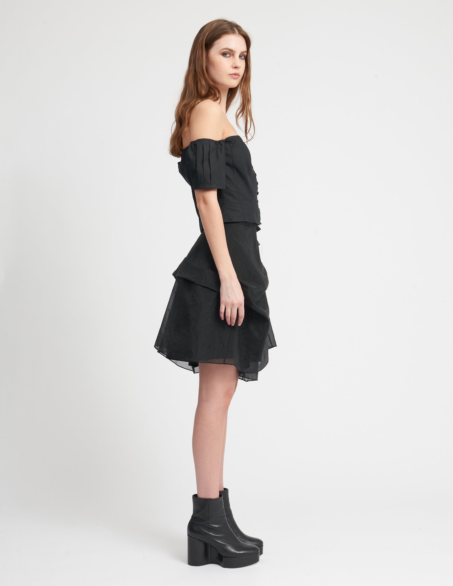 off the shoulder corset top with a front button closure and bubble sleeves with pleating details.