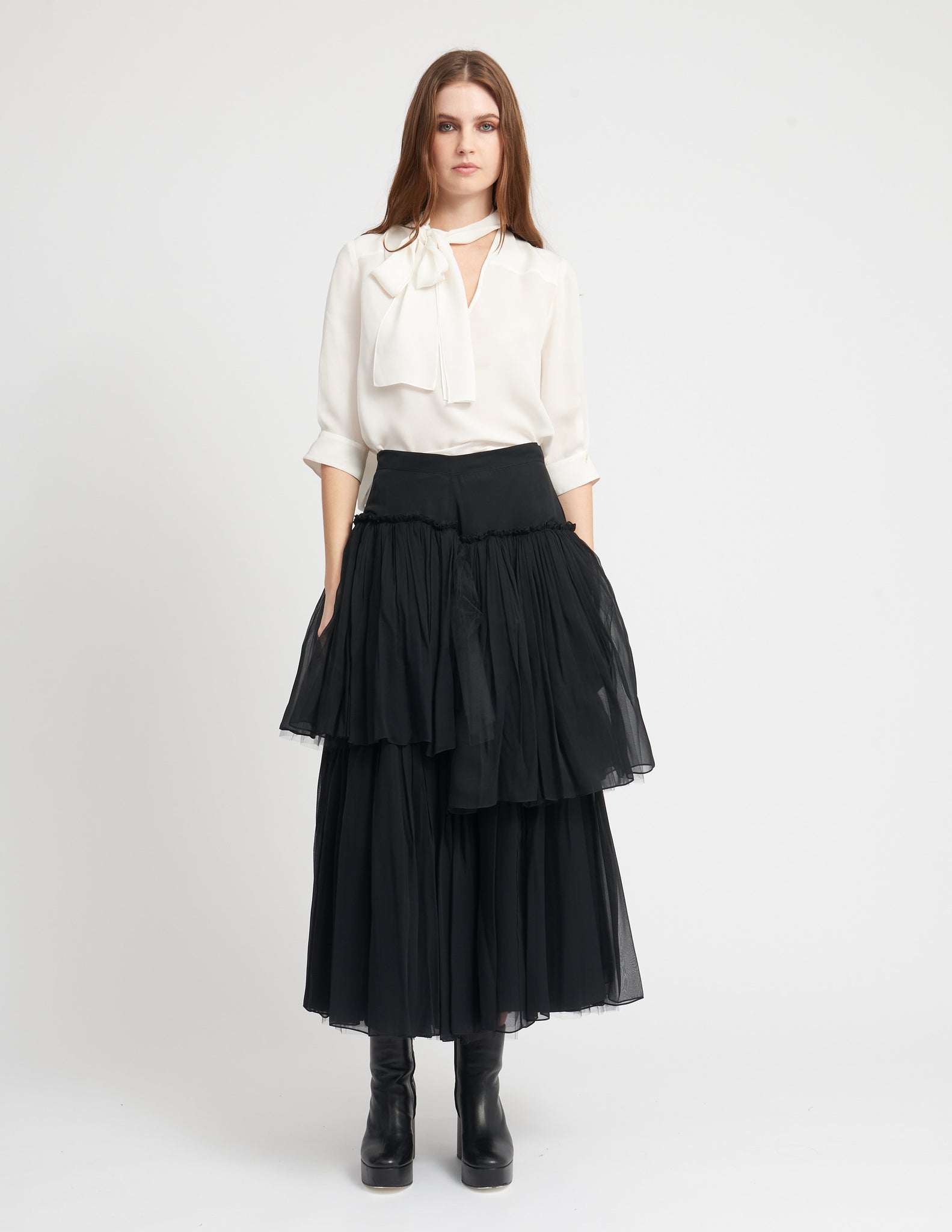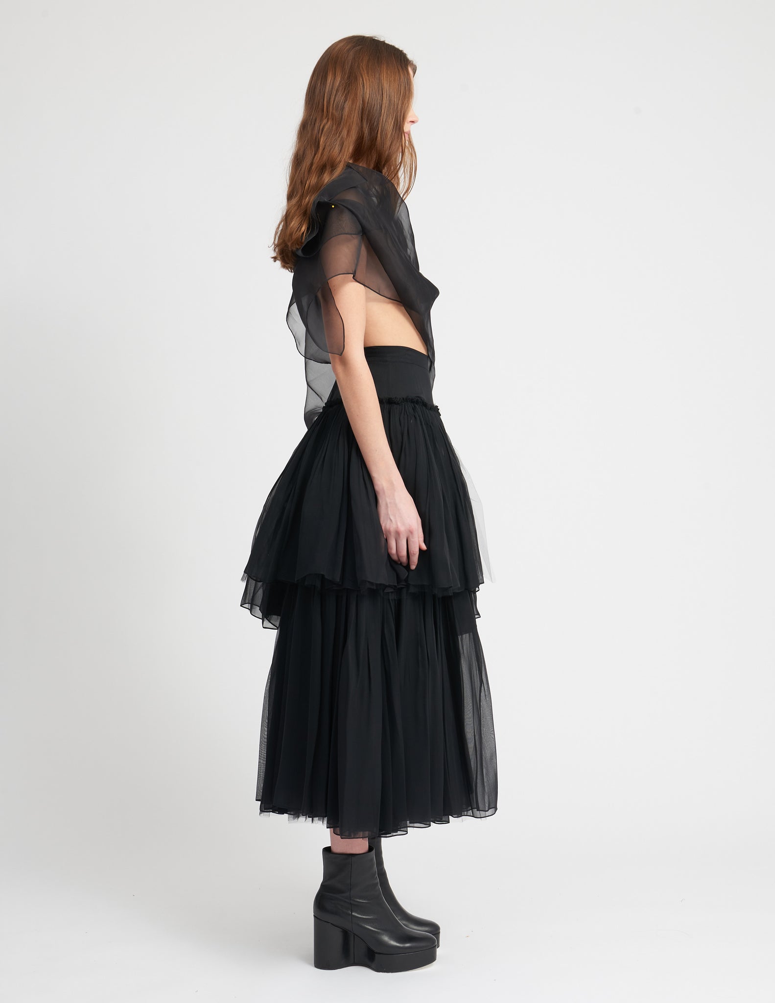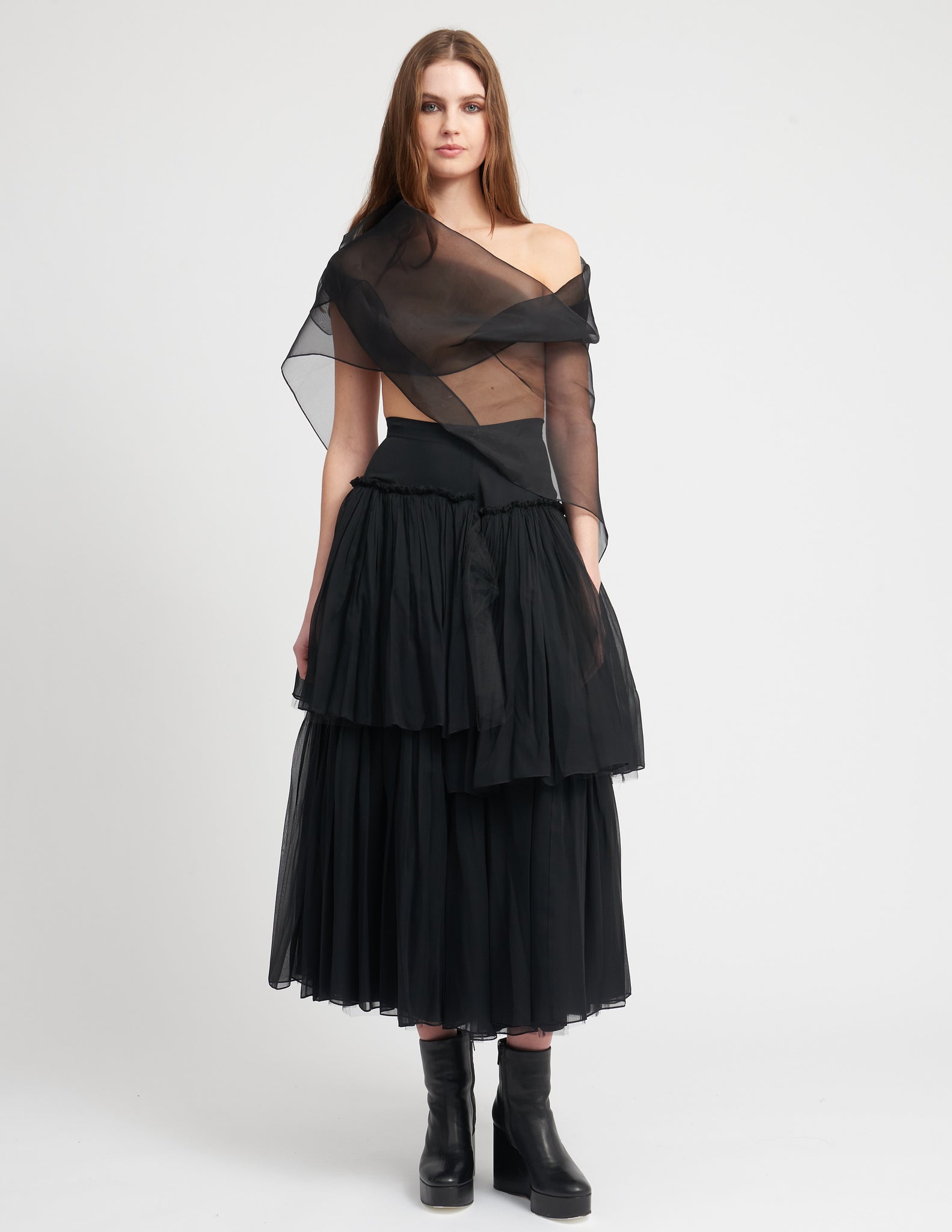 maxi skirt with a waistband and gathered ruffle paneling with tulle to create a voluminous silhouette. comes with an artistic top that can also be worn as an accessory. styled with the light blouse.