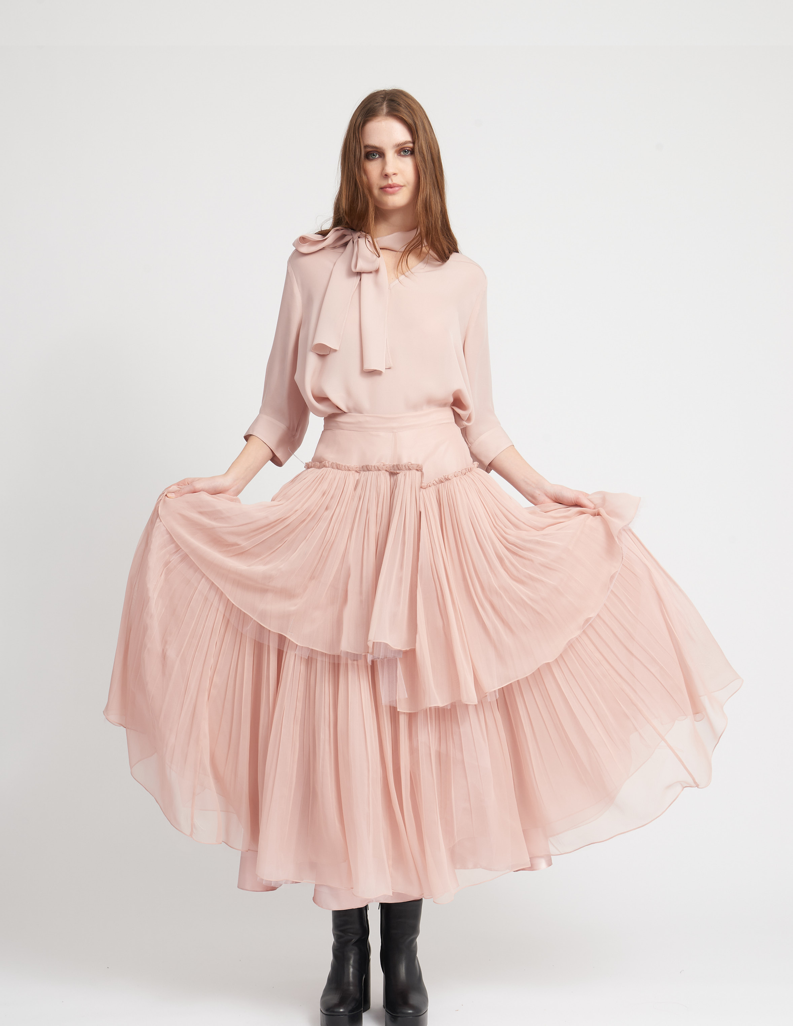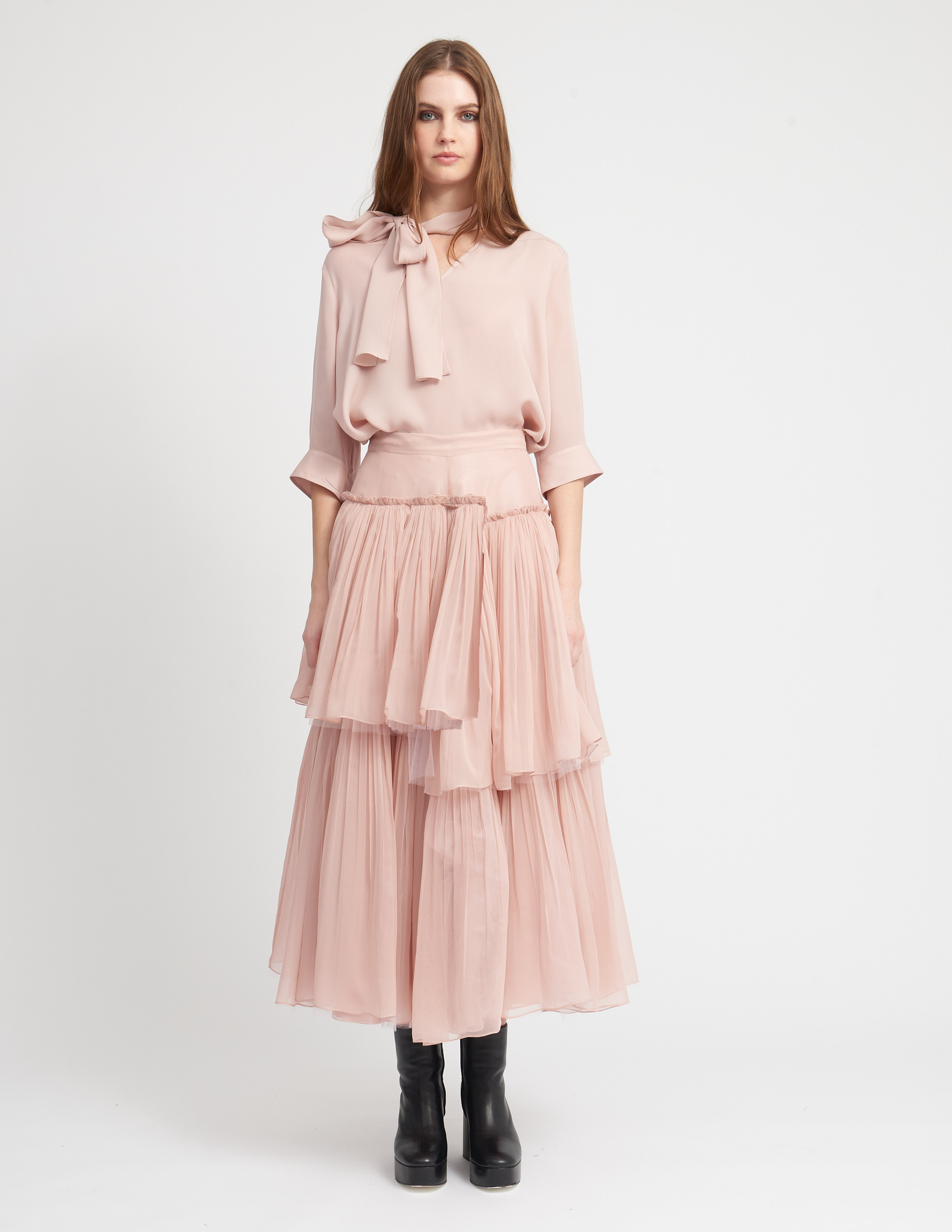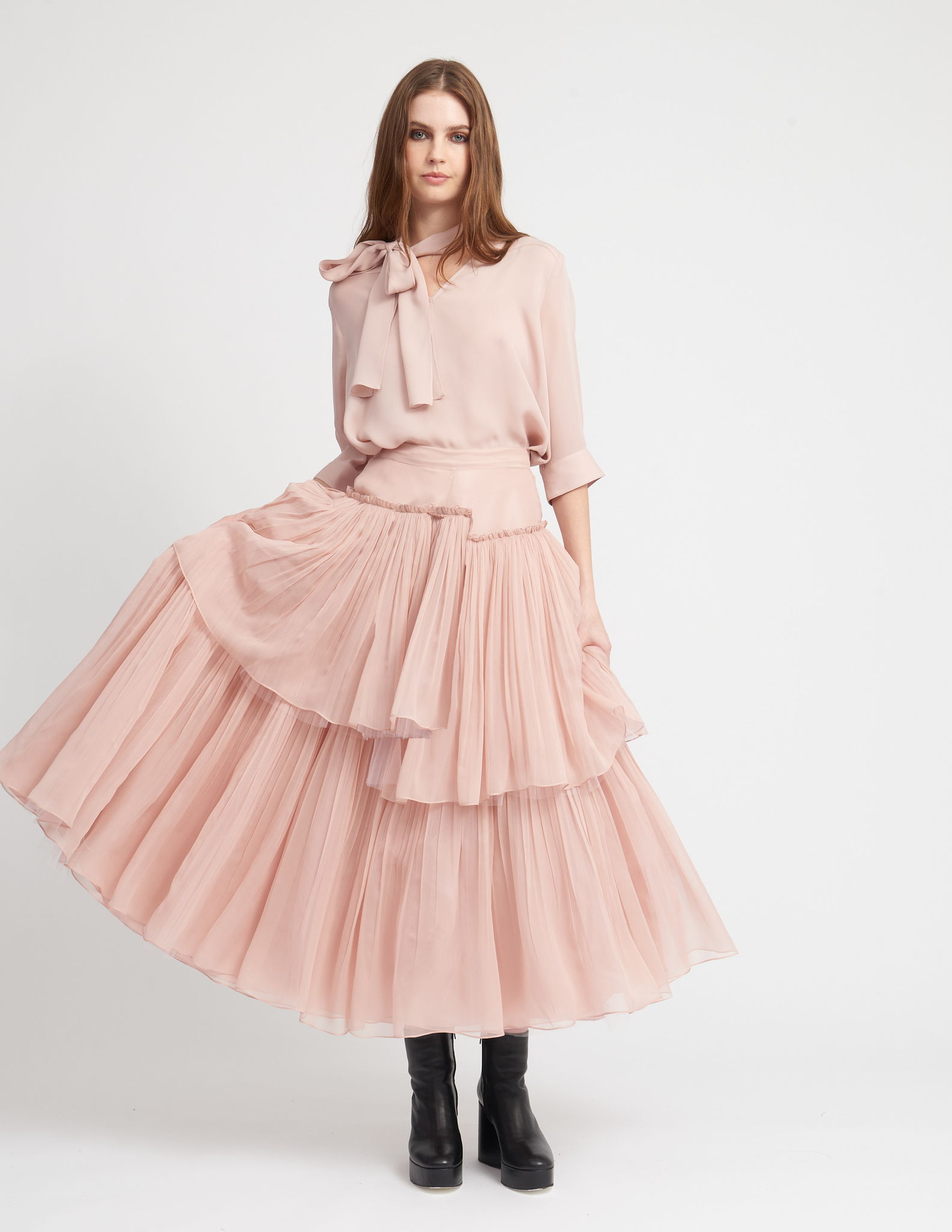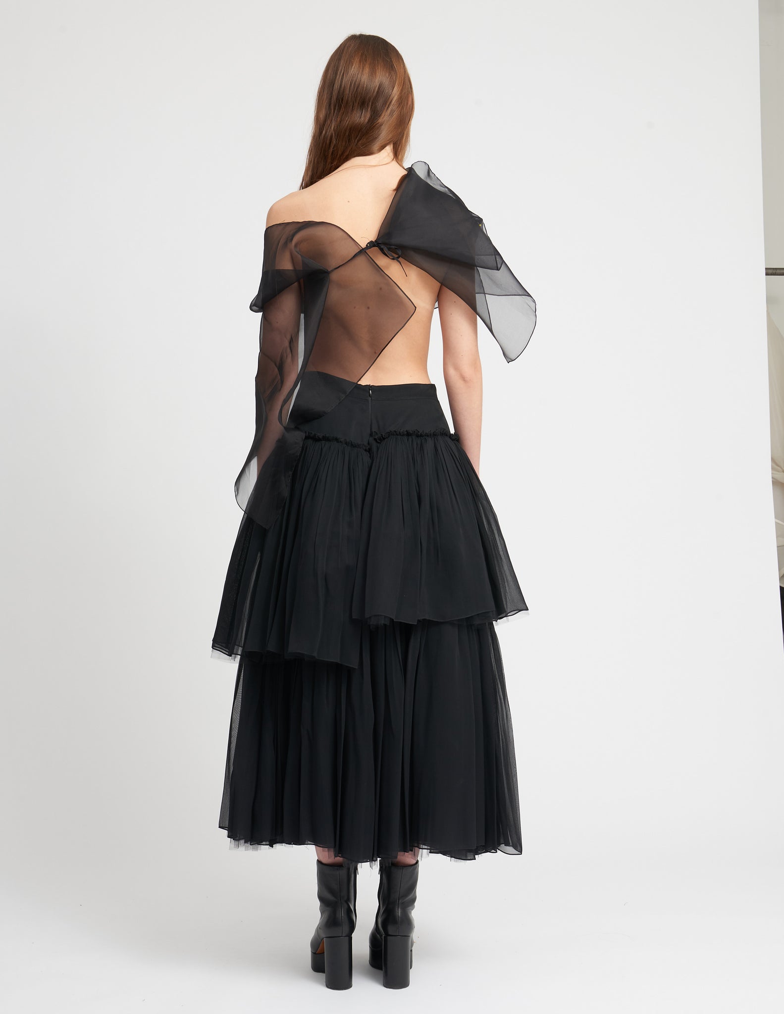 maxi skirt with a waistband and gathered ruffle paneling with tulle to create a voluminous silhouette. comes with an artistic top that can also be worn as an accessory. styled with the light blouse.