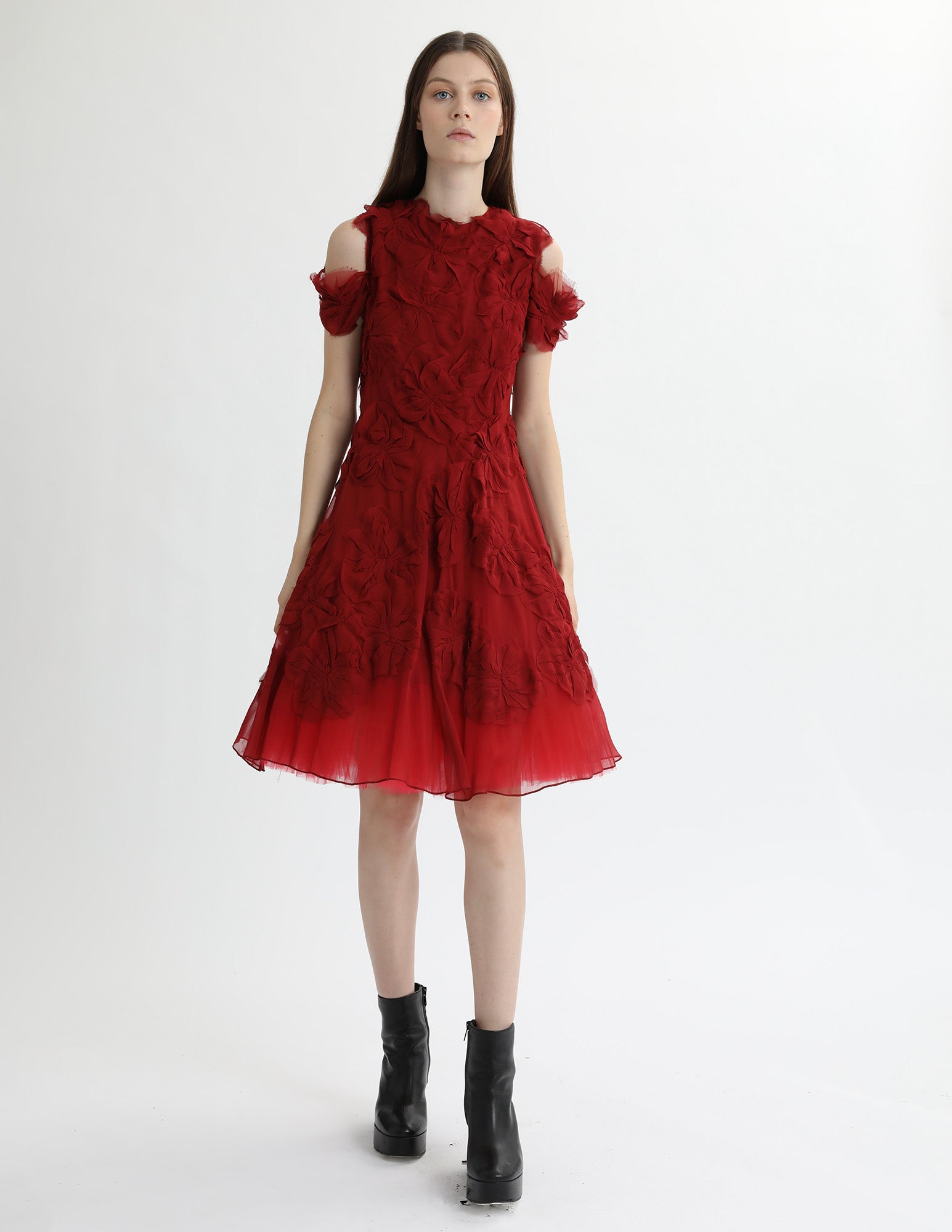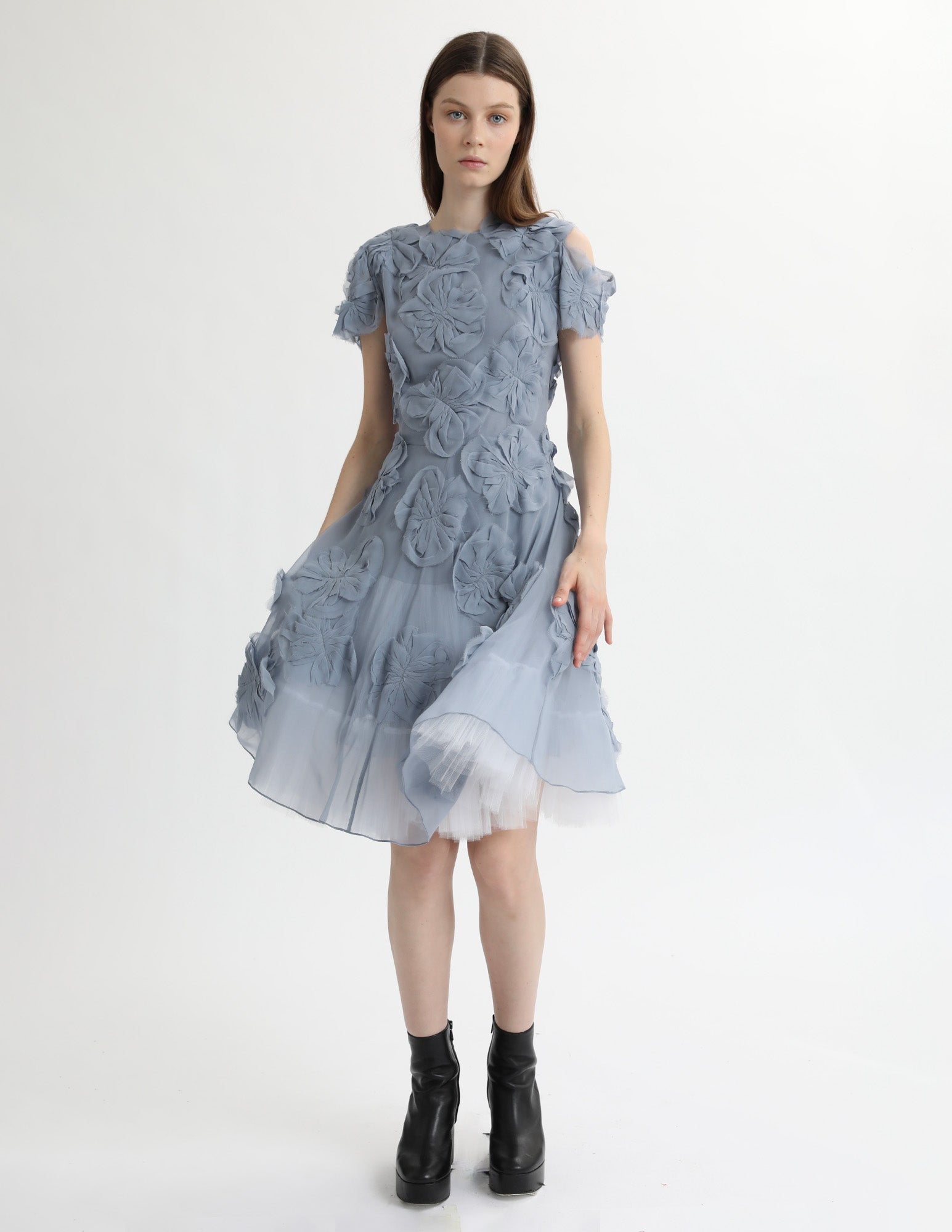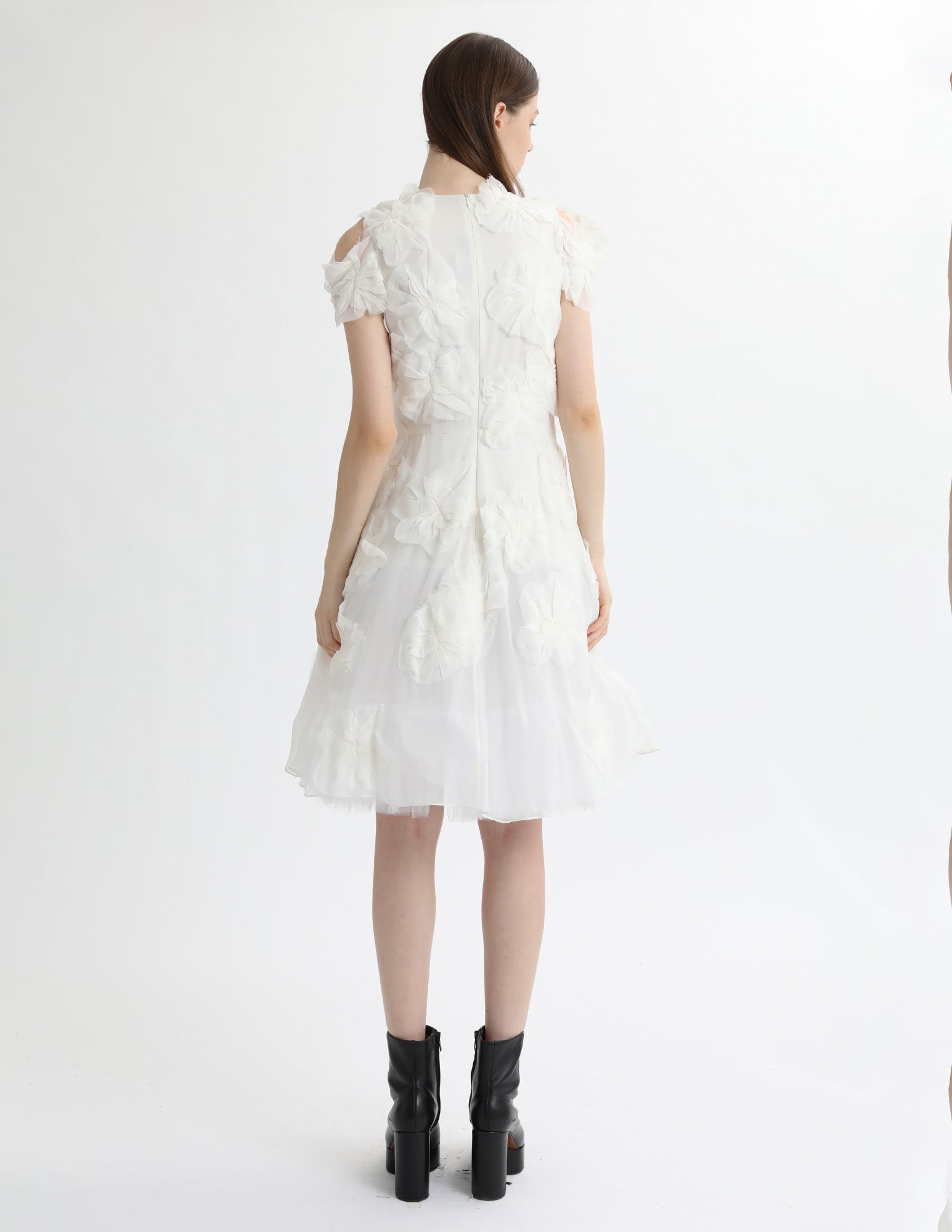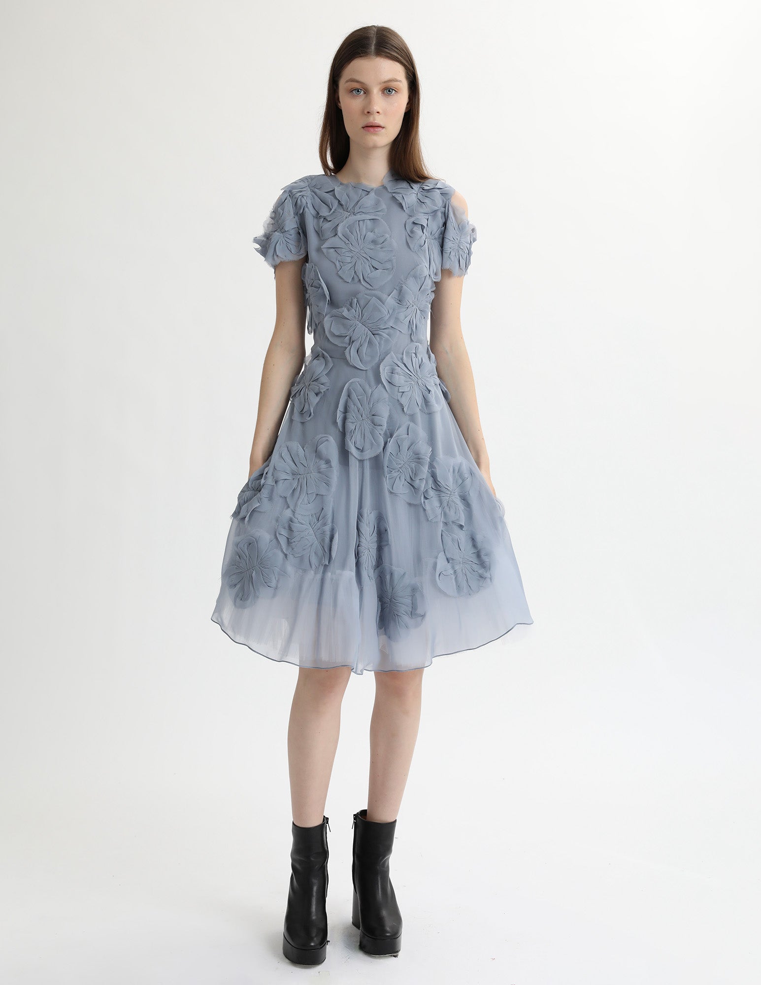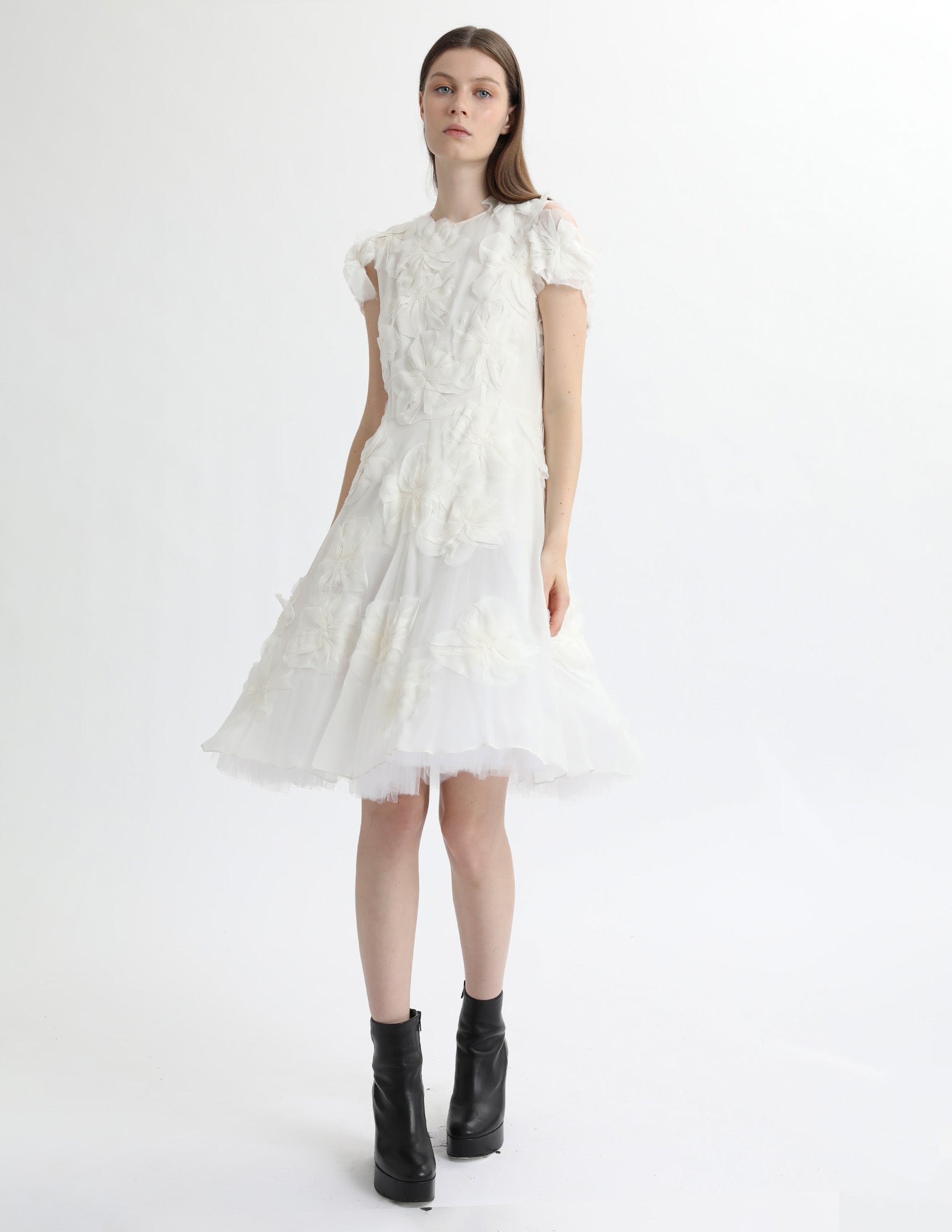 short chiffon gown with interior crinoline featuring delicate floral appliqués placed all over the gown and delicate floral sleeve details.