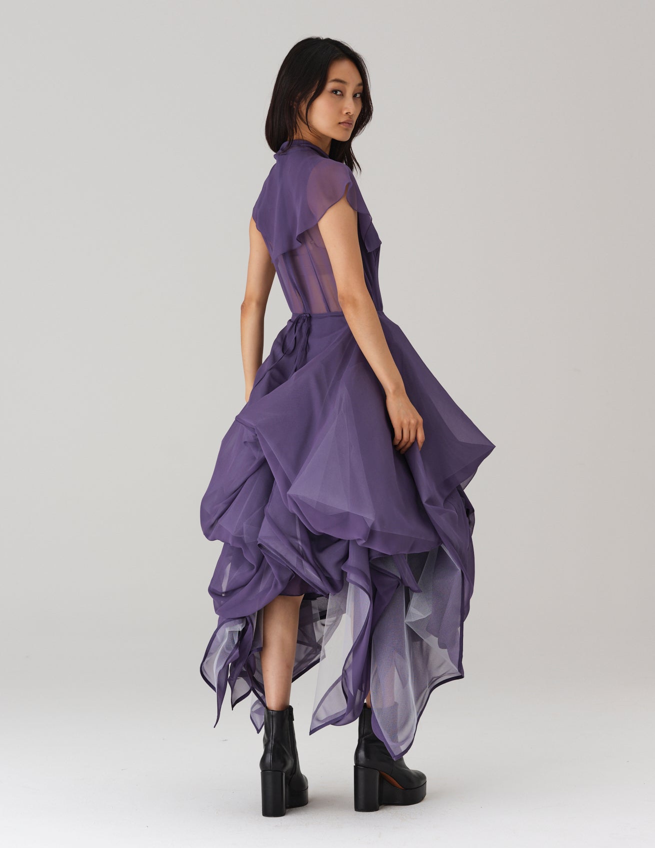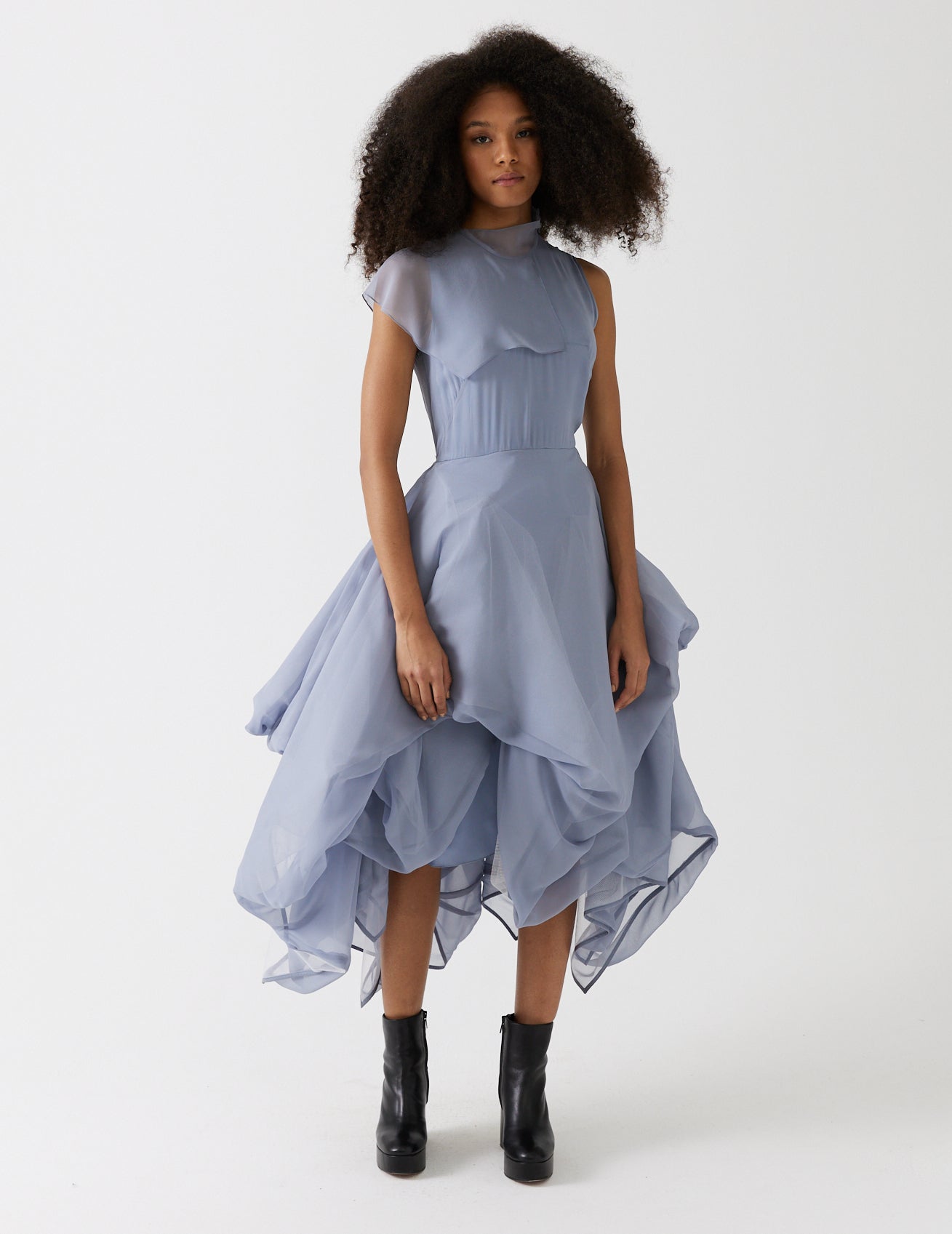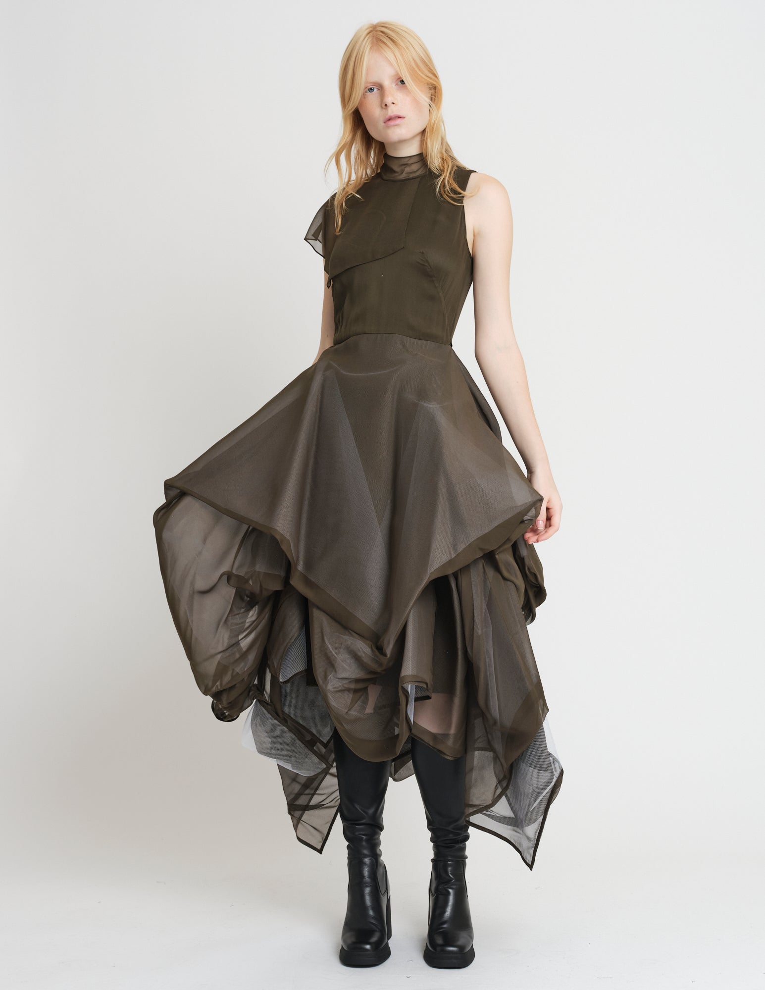 fitted bodice gown featuring a high neck, draped collar and extravagant chiffon and heavy tulle skirt. back bodice is unlined.