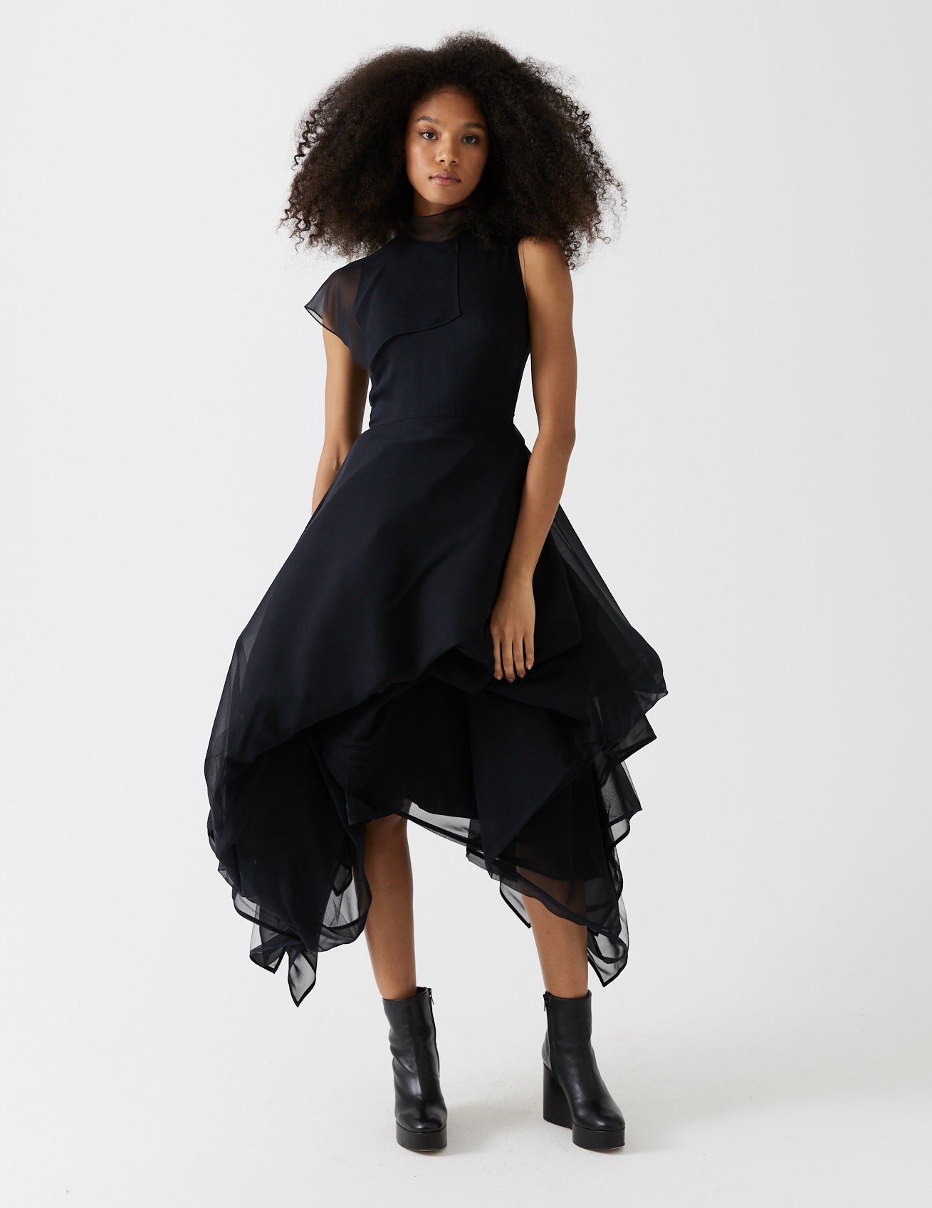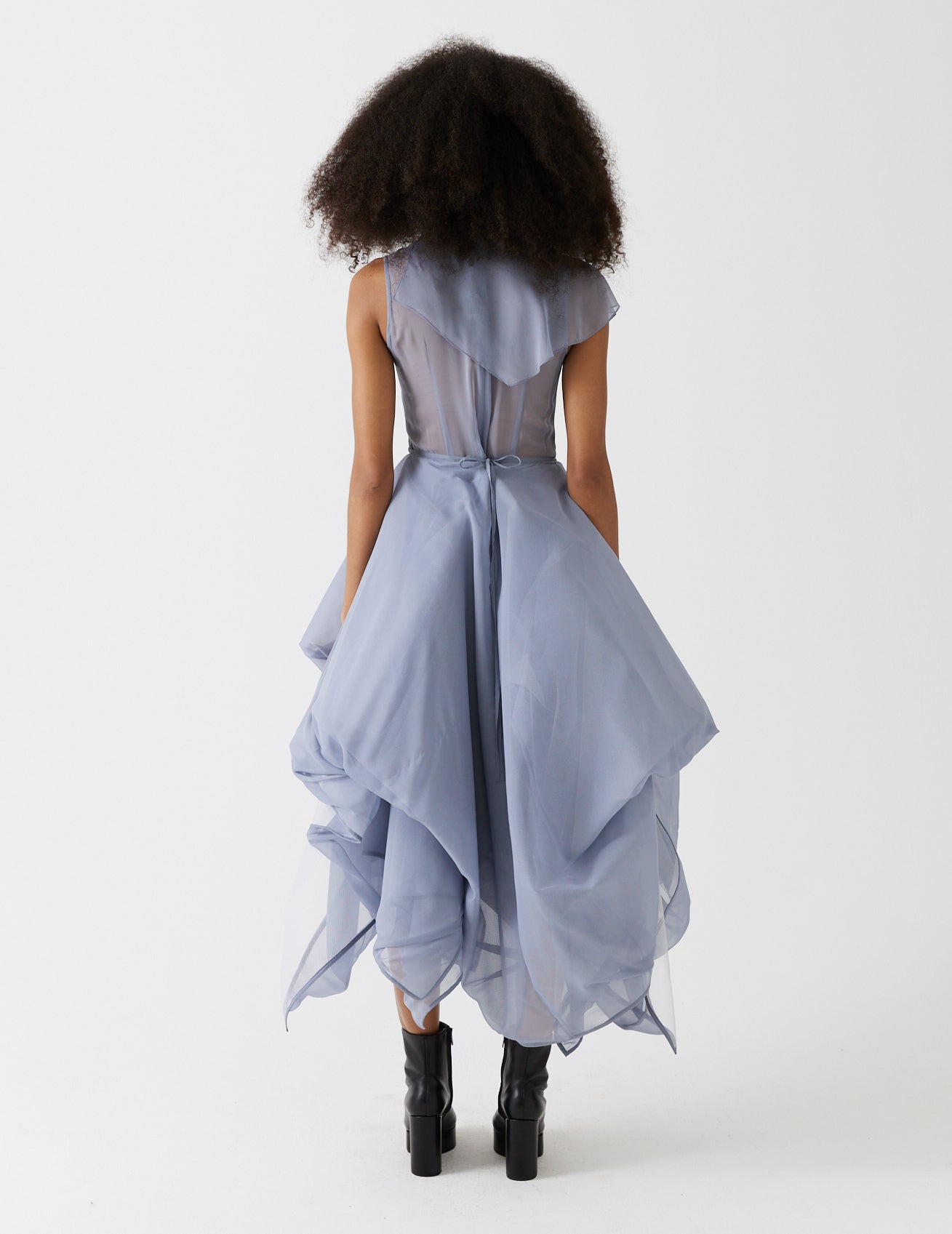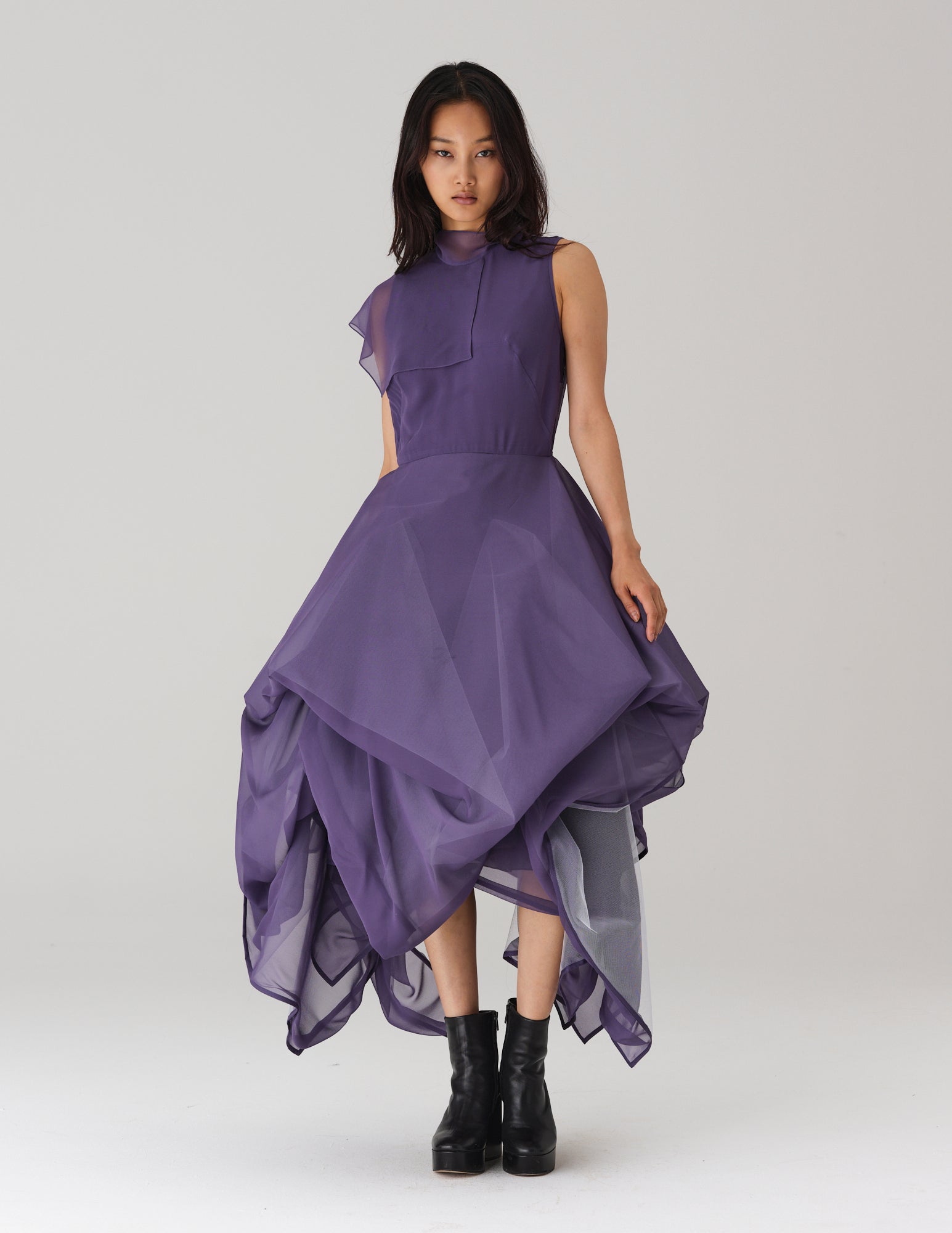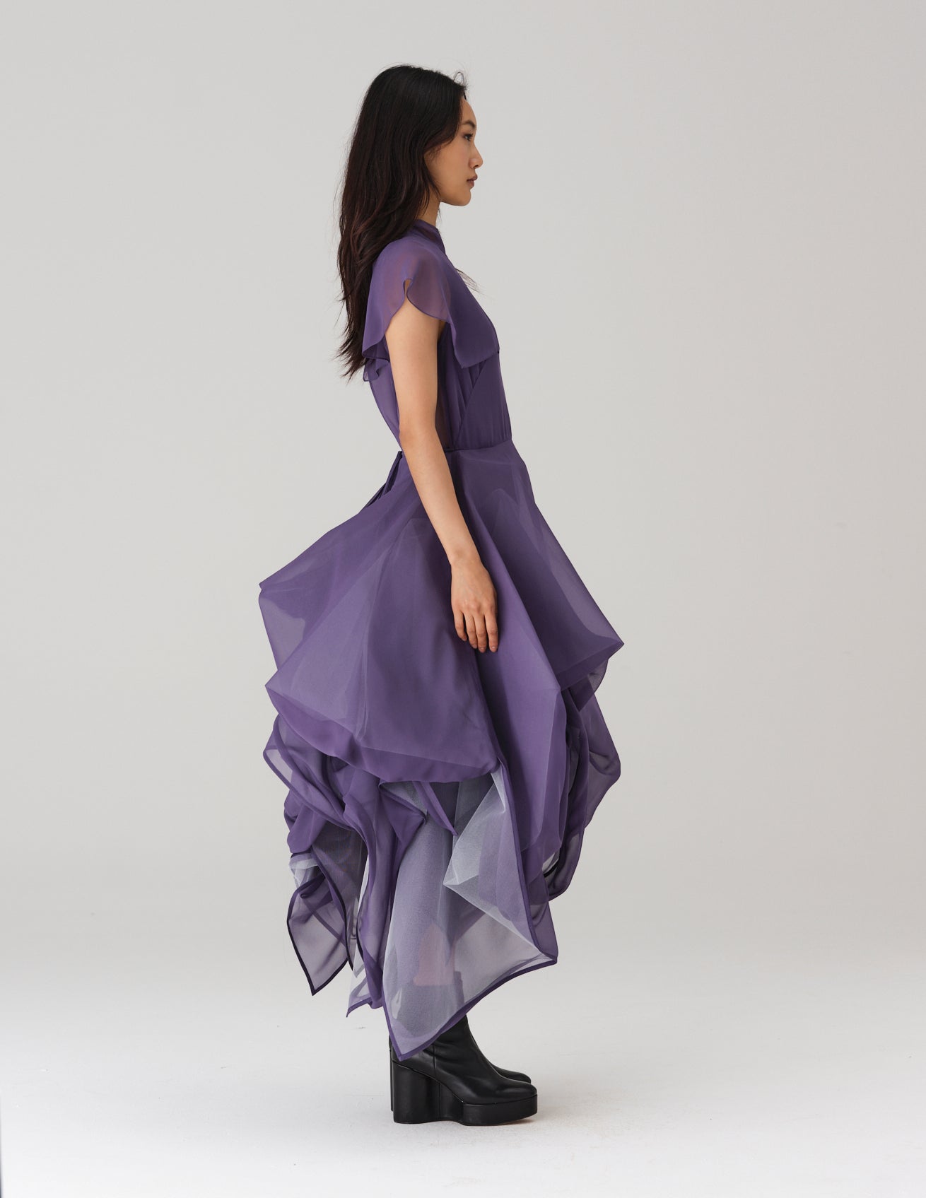 fitted bodice gown featuring a high neck, draped collar and extravagant chiffon and heavy tulle skirt. back bodice is unlined.