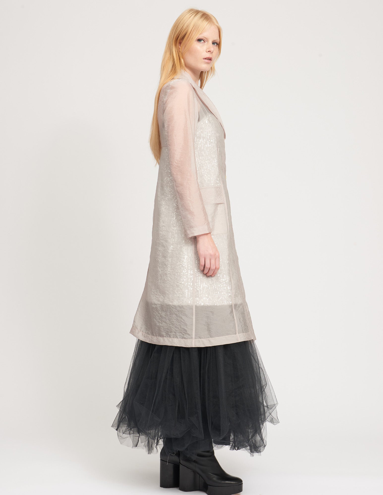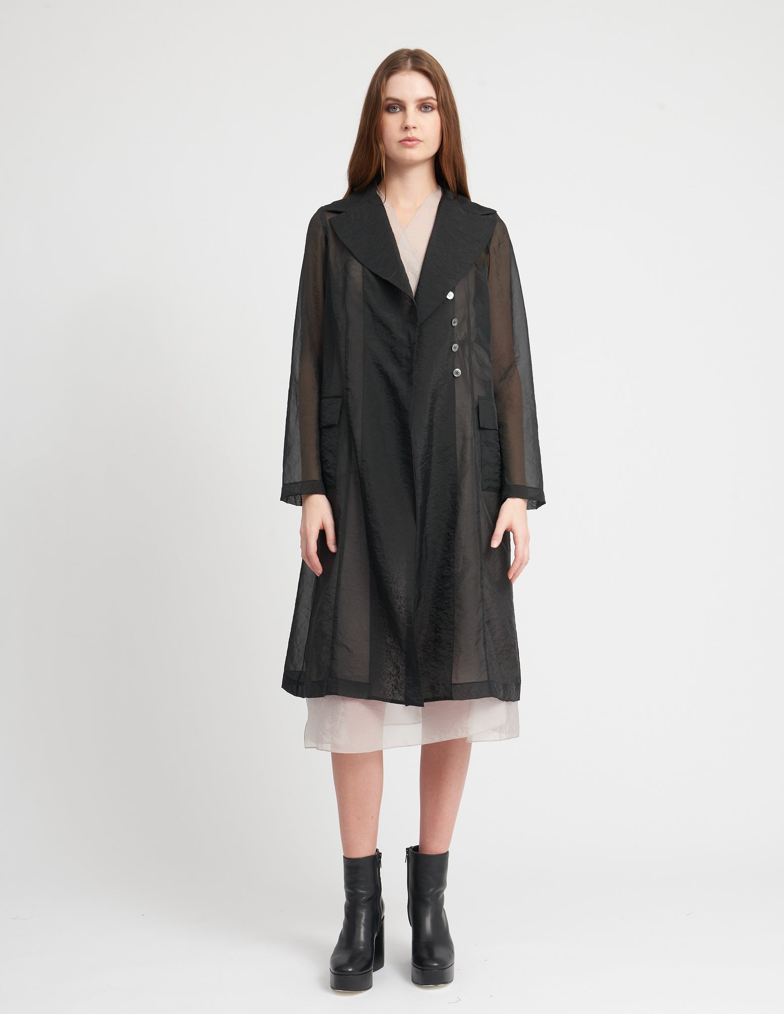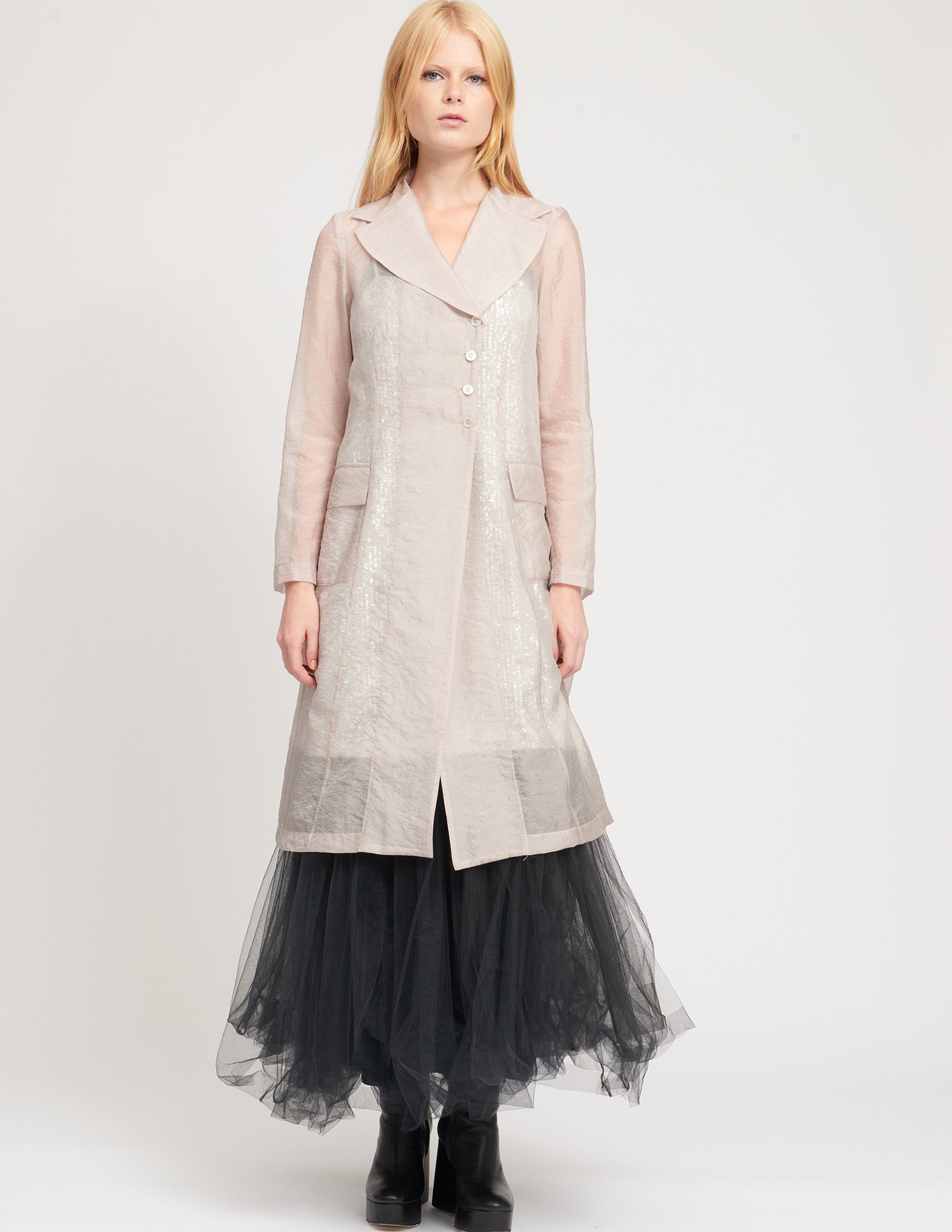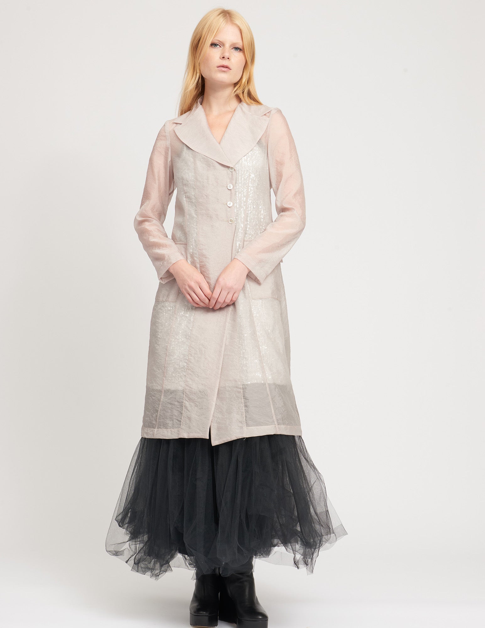 maxi jacket with a semi-fitted silhouette, a cross button closure, pockets, and interior ties to create drapery. styled with the ellis crinoline and mulberry dress.
