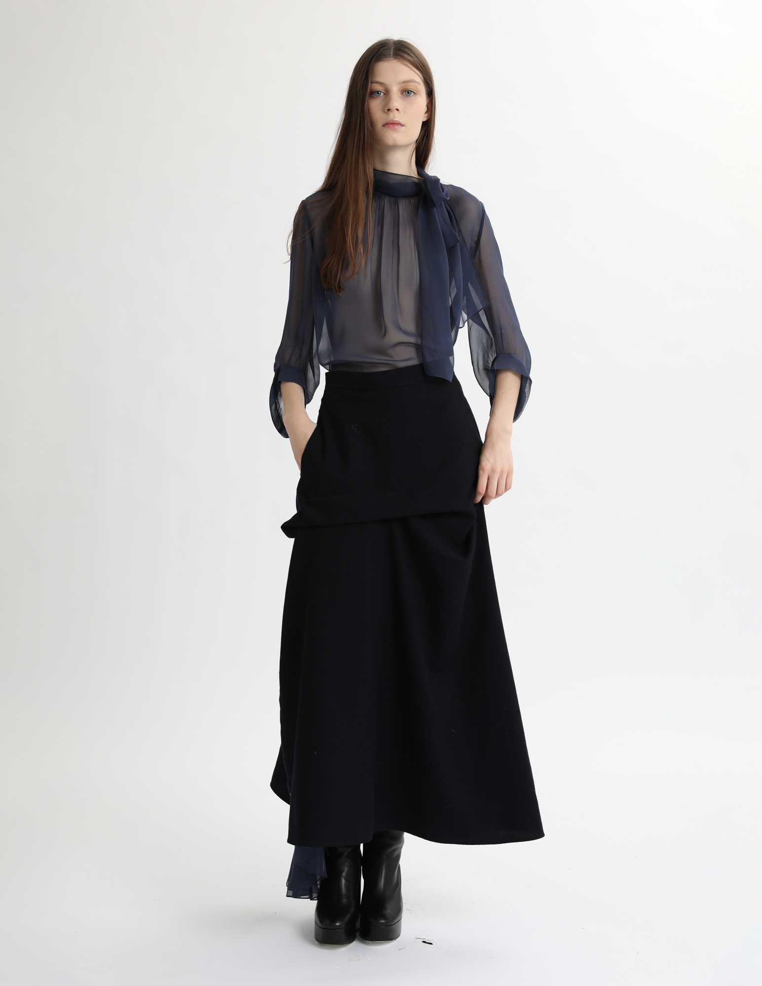 maxi skirt with a front and back fixed drape, a waistband, and interior pockets. styled with the uranus gown.