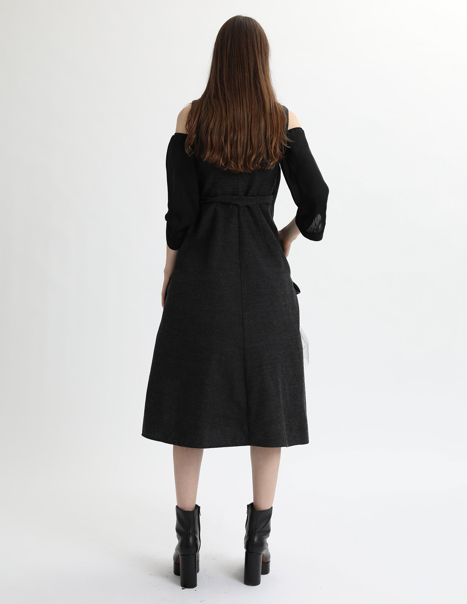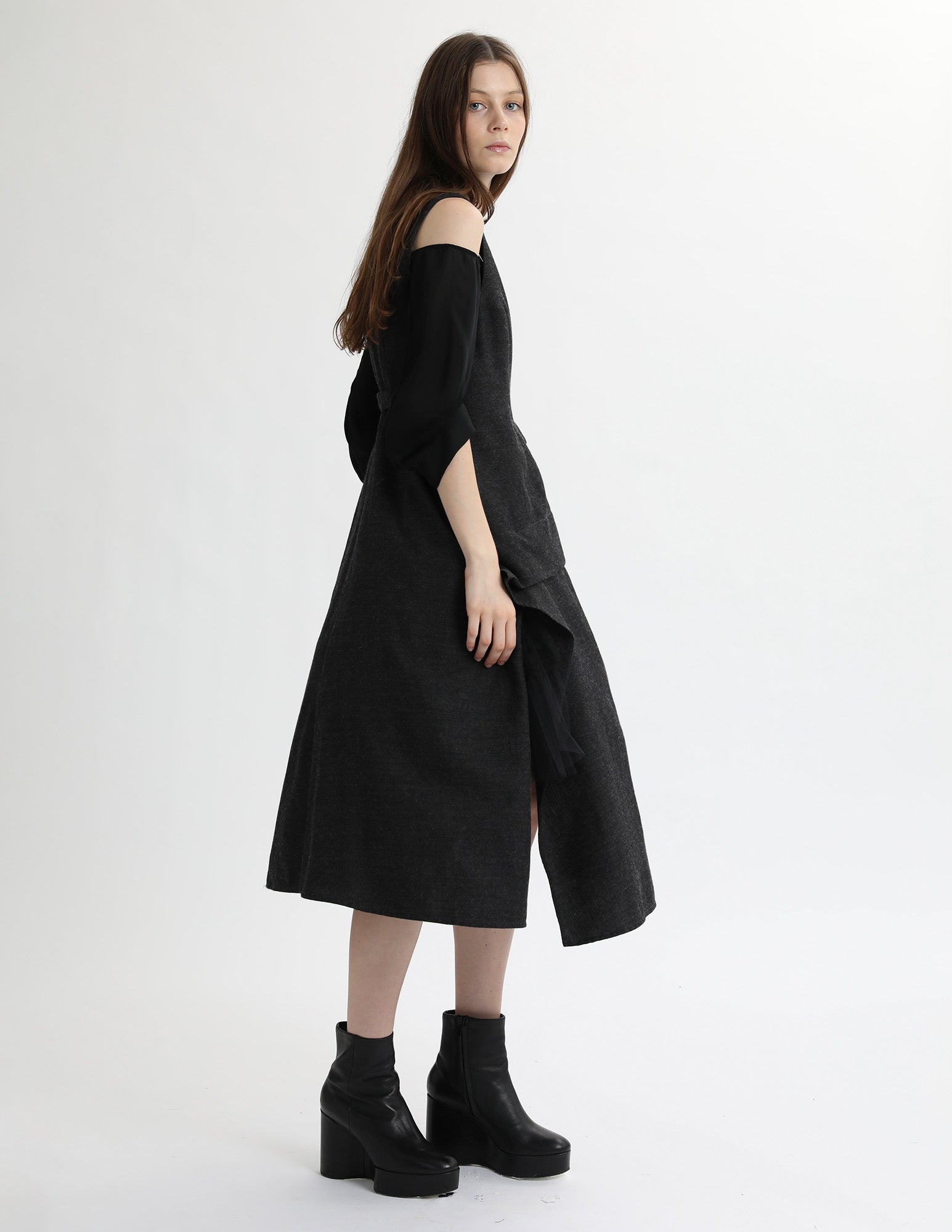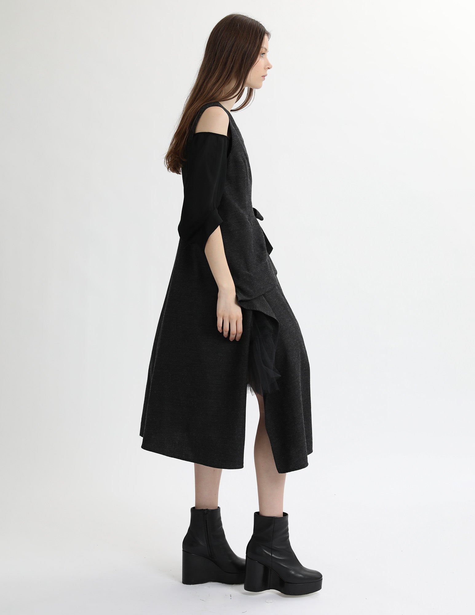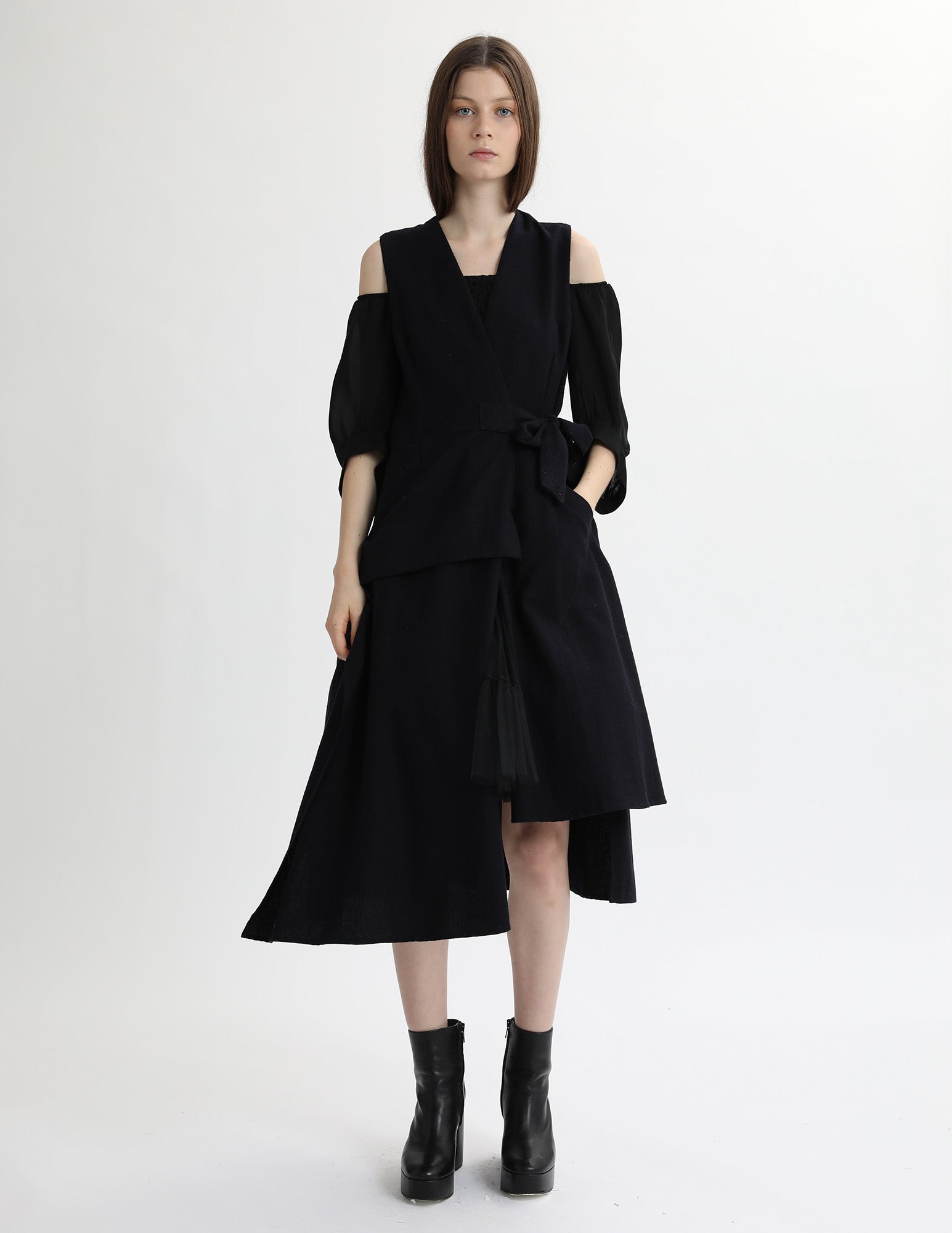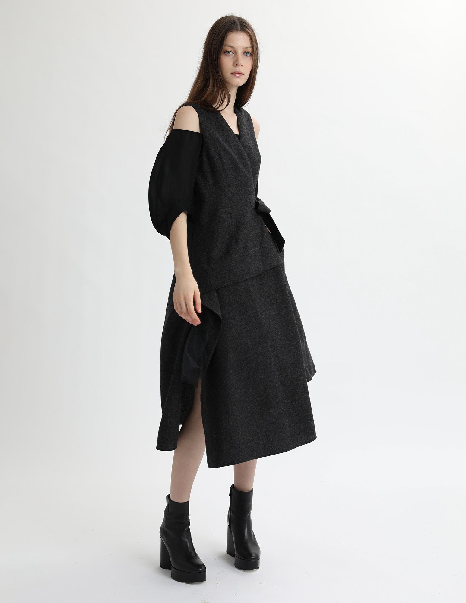 fitted maxi vest with wrap around tie detail and layered draping with optional ties for additional bustling. styled with the waverly blouse and bard crinoline.