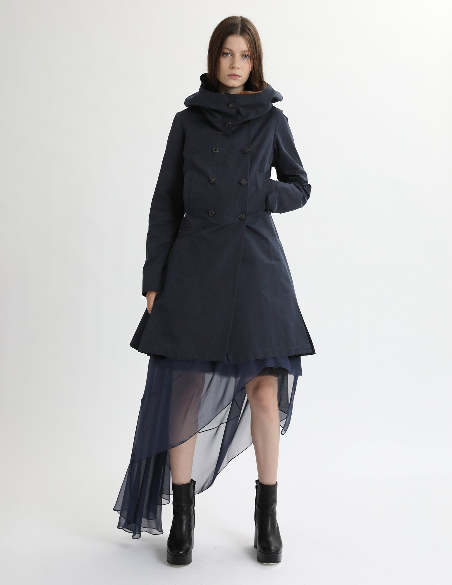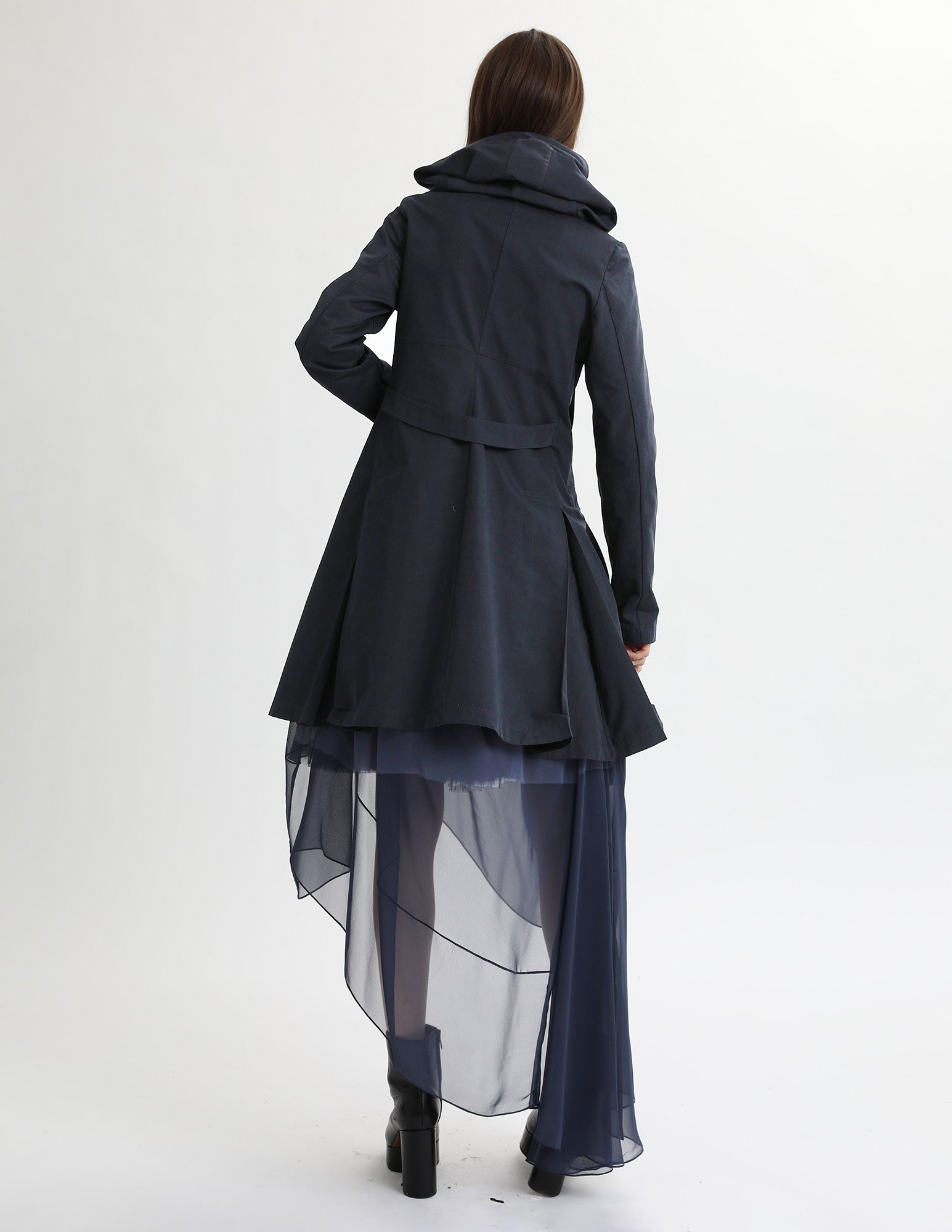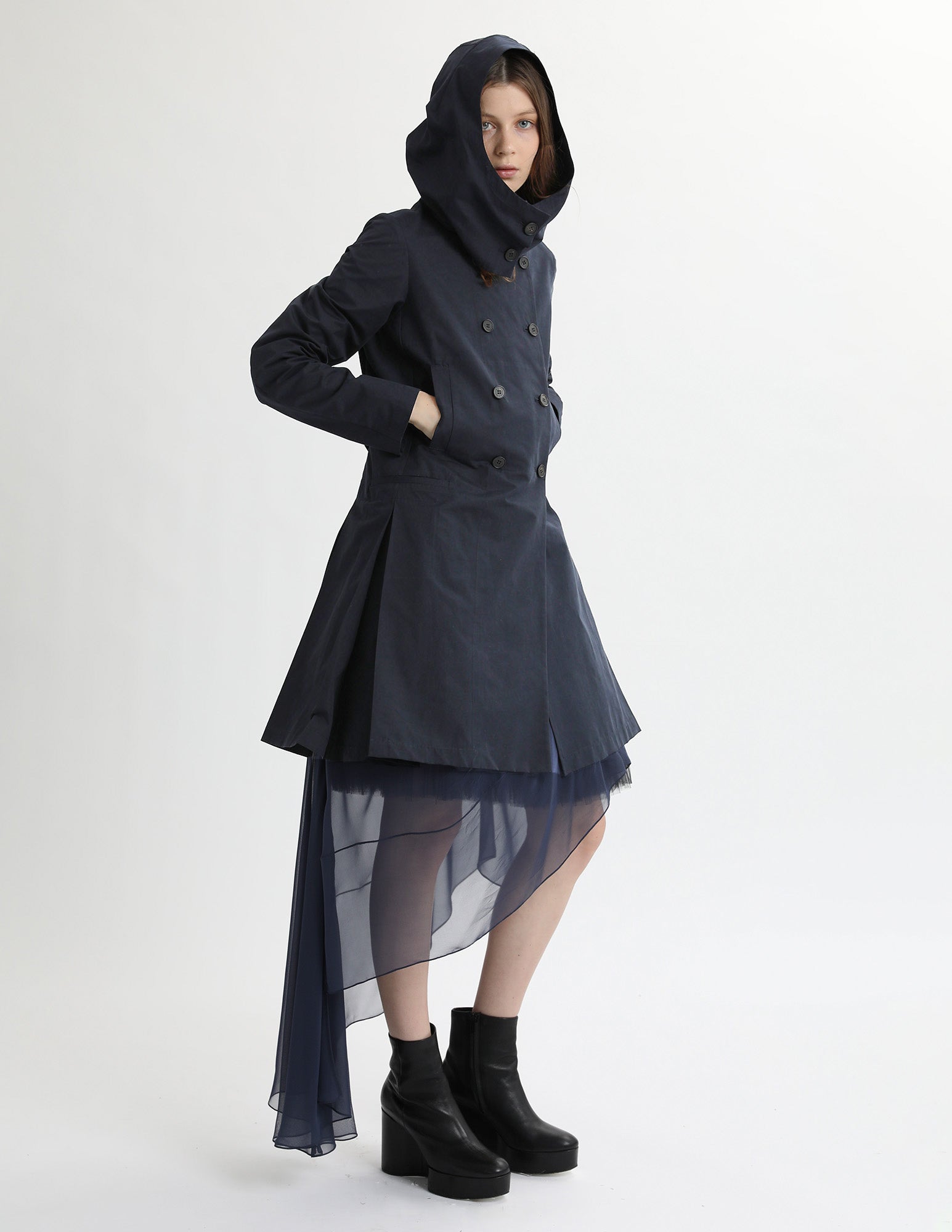 adapted from a morgane le fay classic, this hooded trench jacket features three pockets. box pleated skirt, and a hood. styled with the bard crinoline and uranus gown.