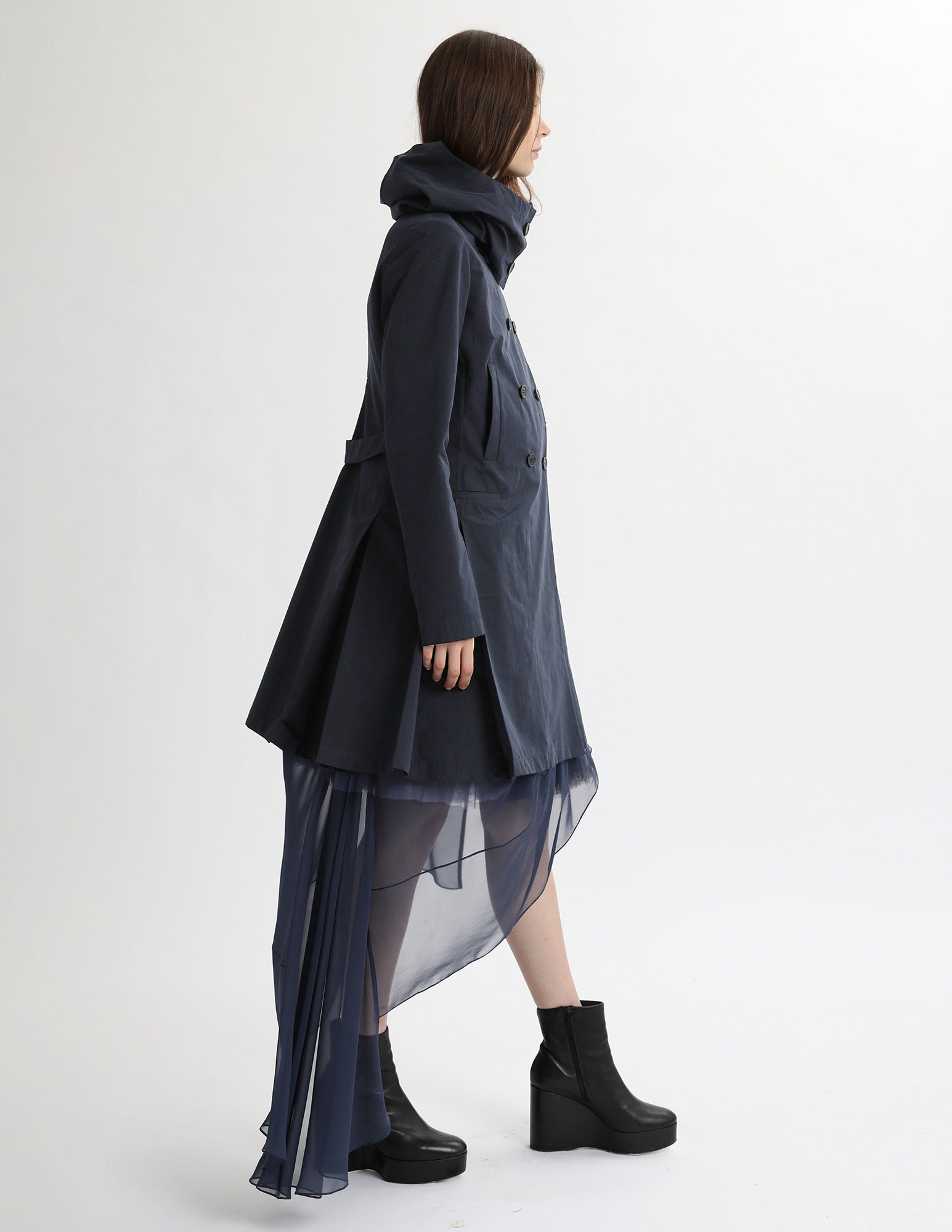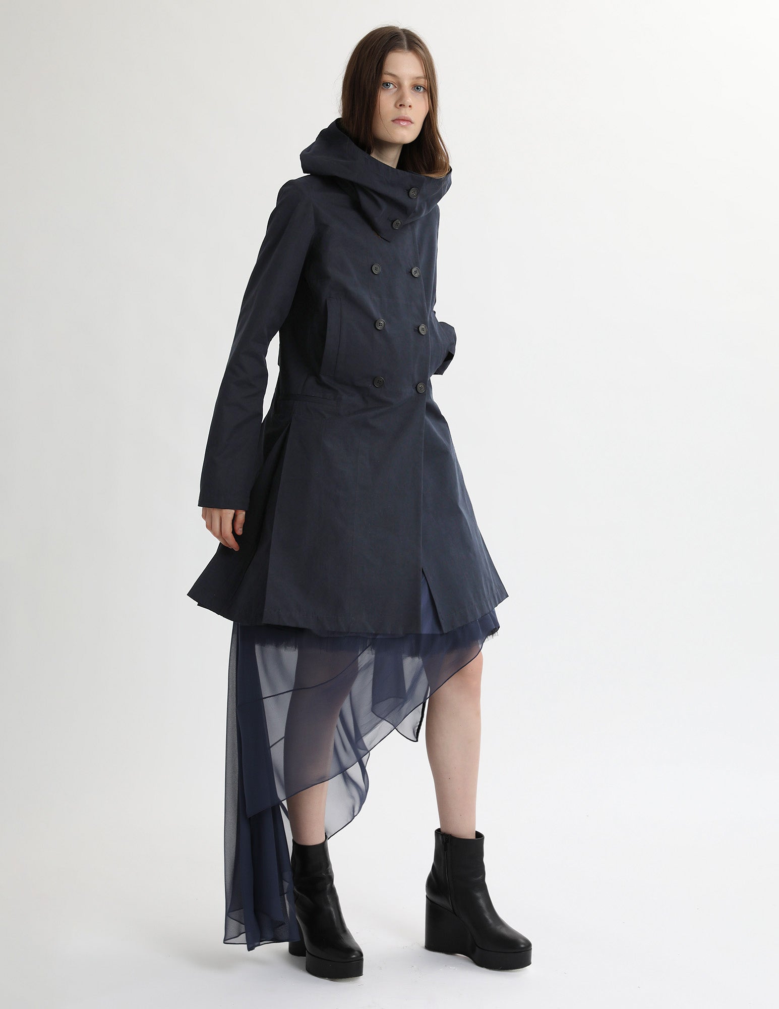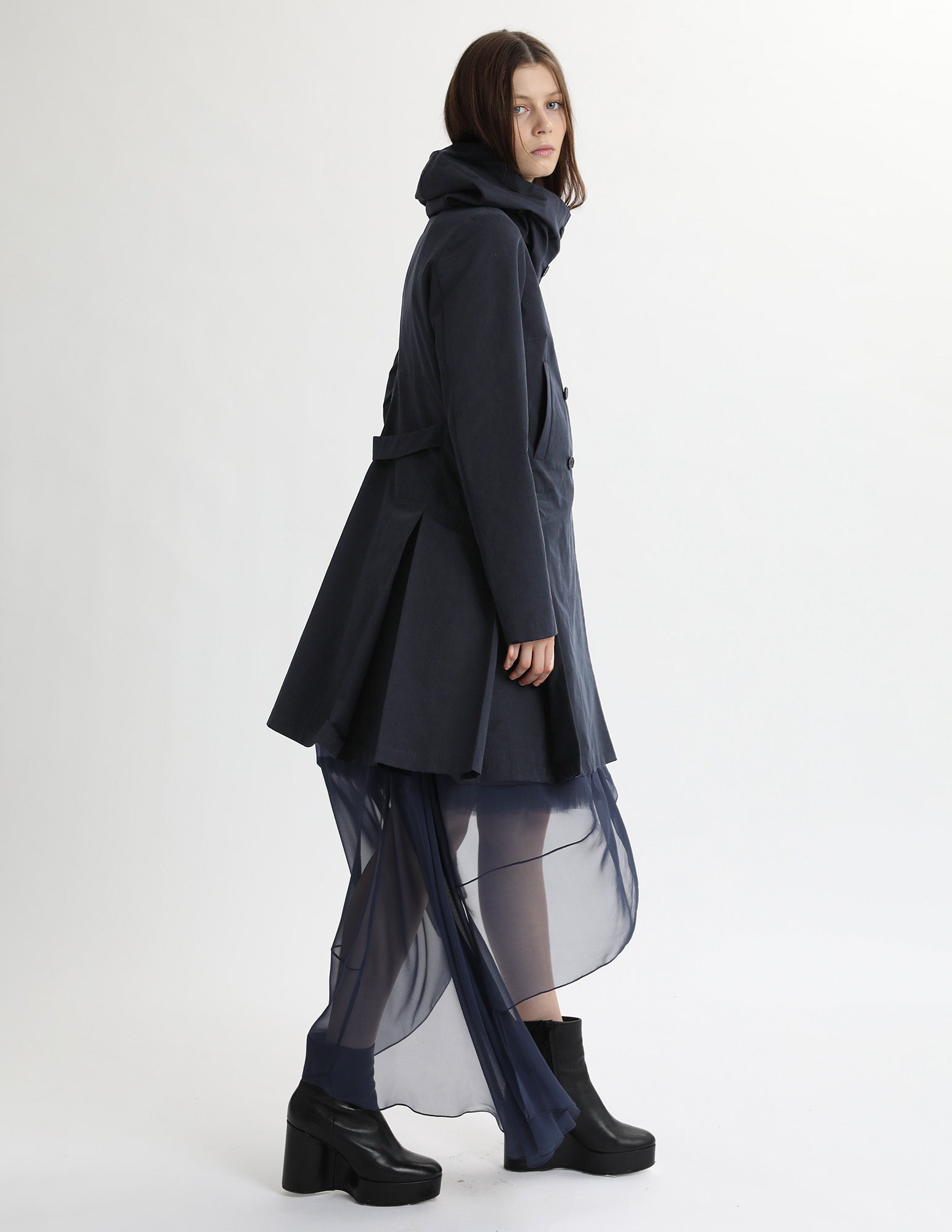 adapted from a morgane le fay classic, this hooded trench jacket features three pockets. box pleated skirt, and a hood. styled with the bard crinoline and uranus gown.