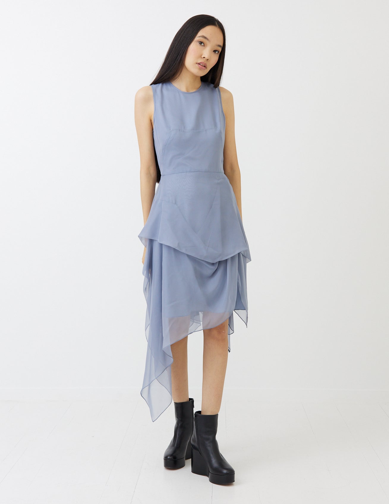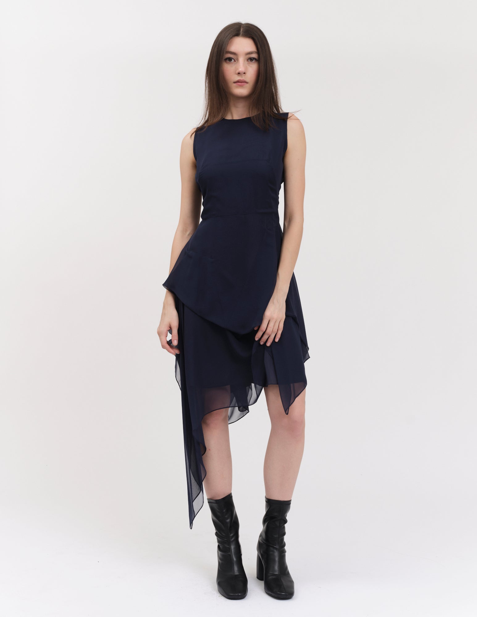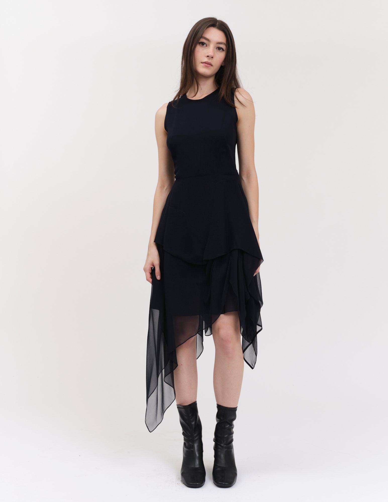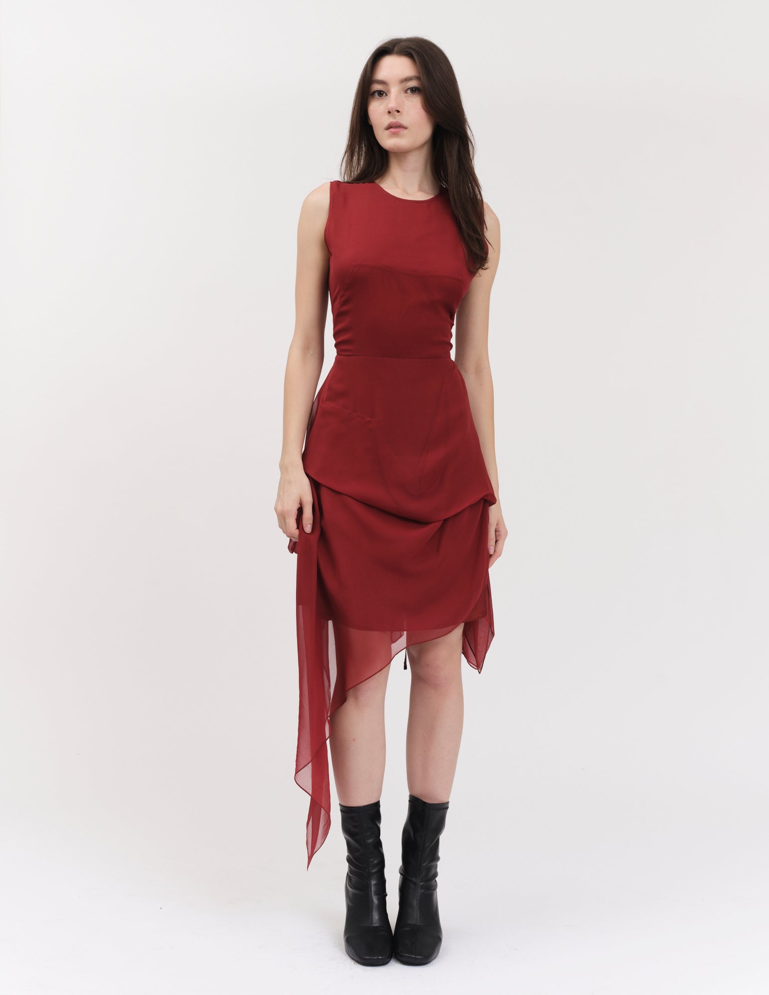 short chiffon dress featuring a fitted bodice with signature bodice paneling and layered draping in skirt.