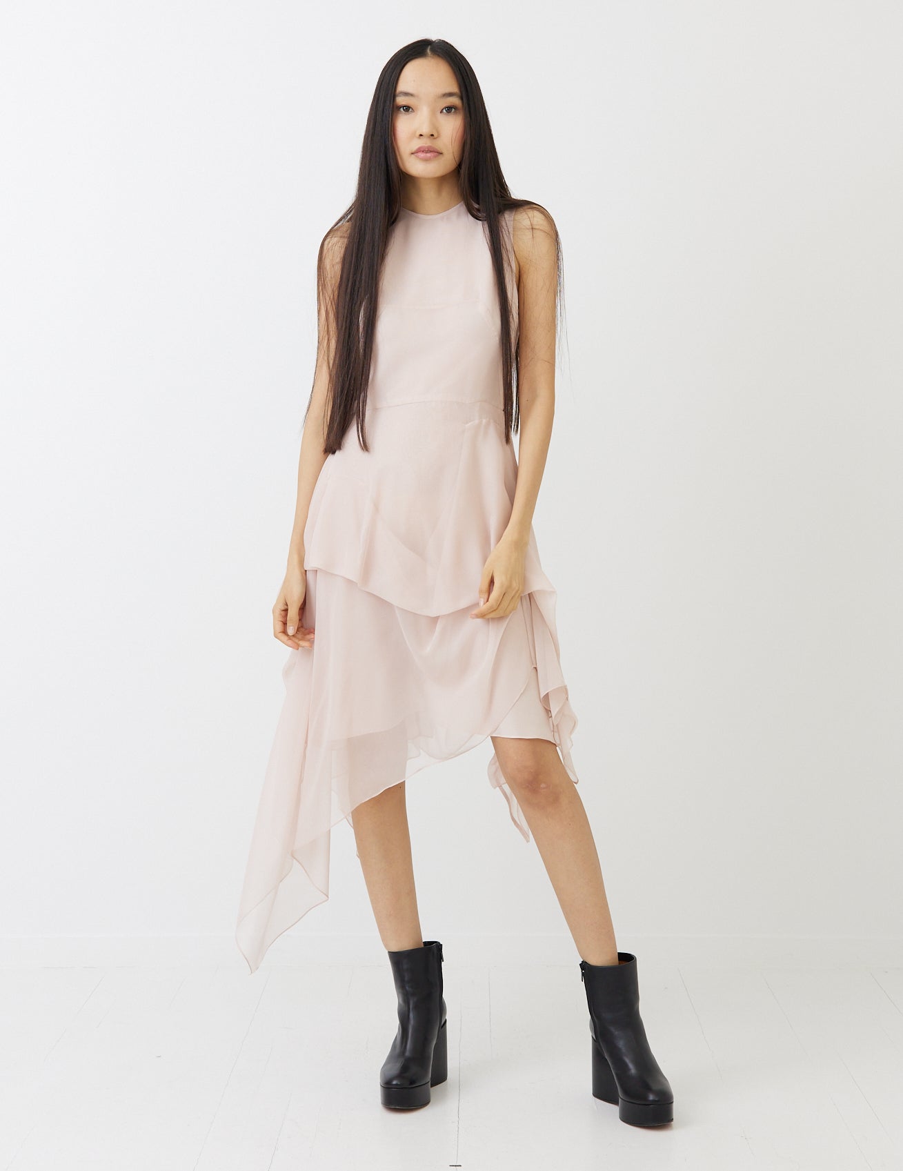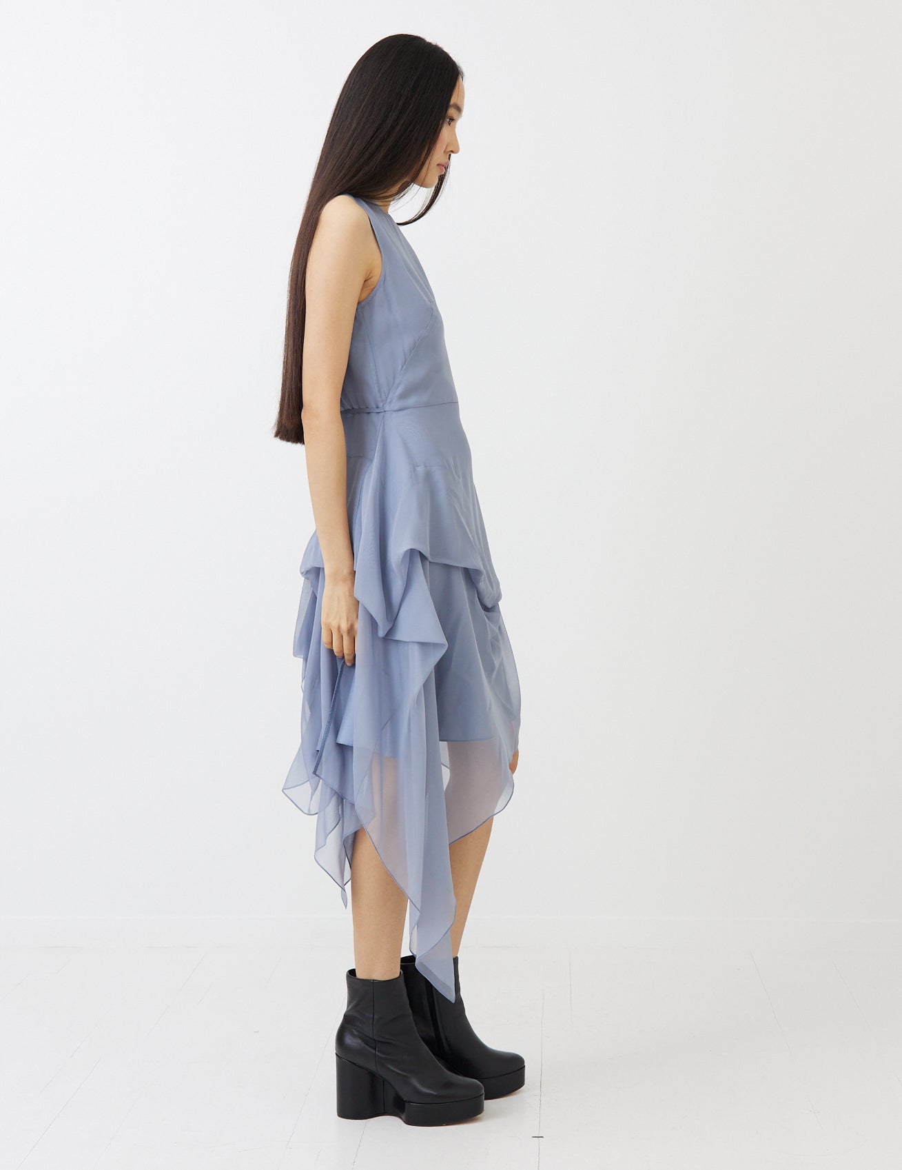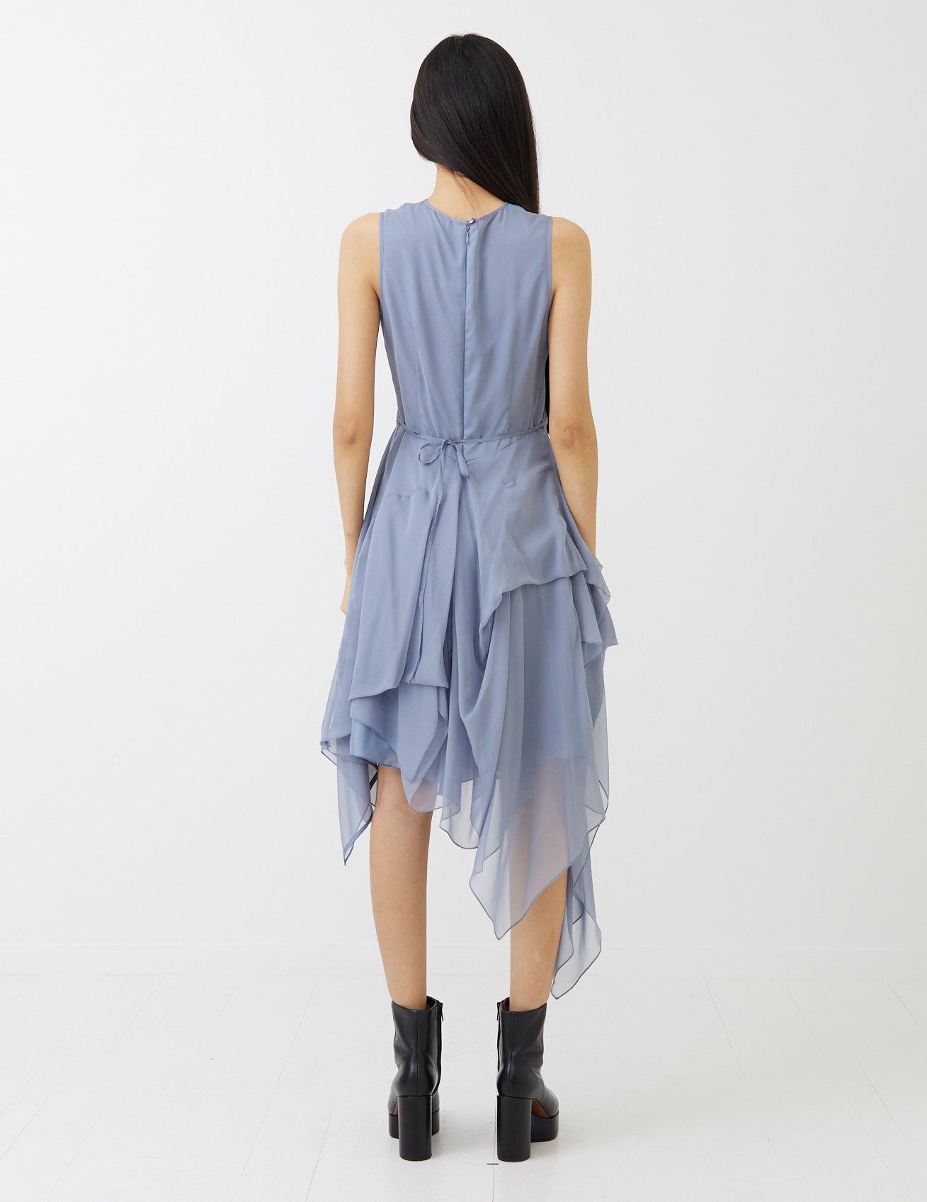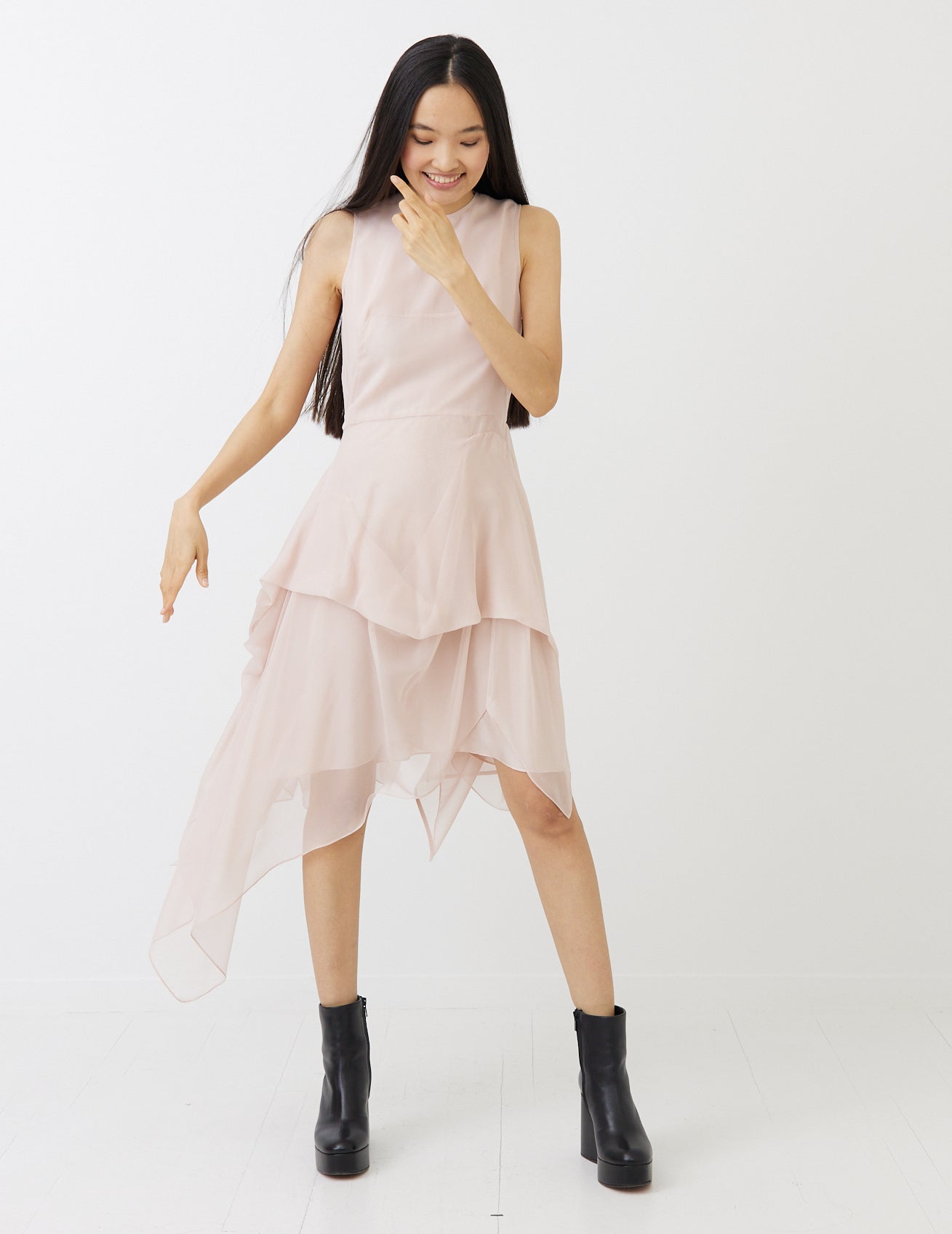 short chiffon dress featuring a fitted bodice with signature bodice paneling and layered draping in skirt.