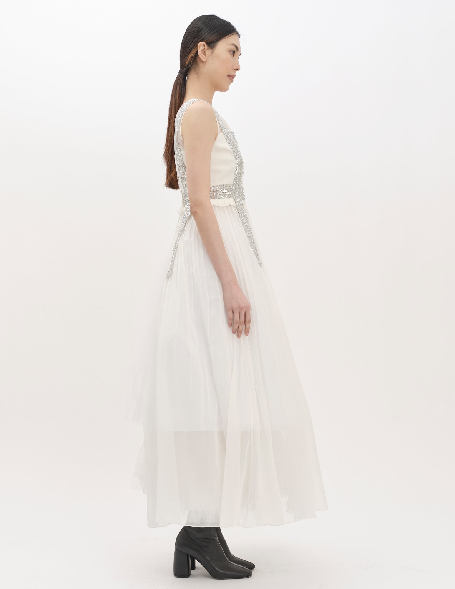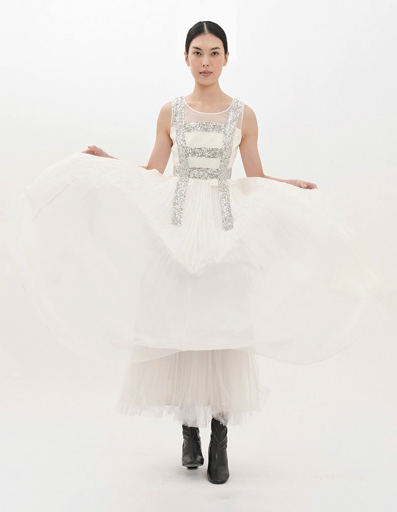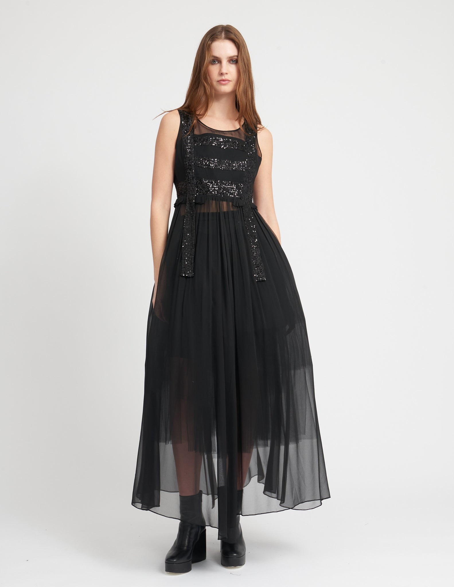 maxi gown in chiffon with sequin detailing, a fitted bodice, and a loose split back silhouette from the waist. styled with the ellis crinoline.