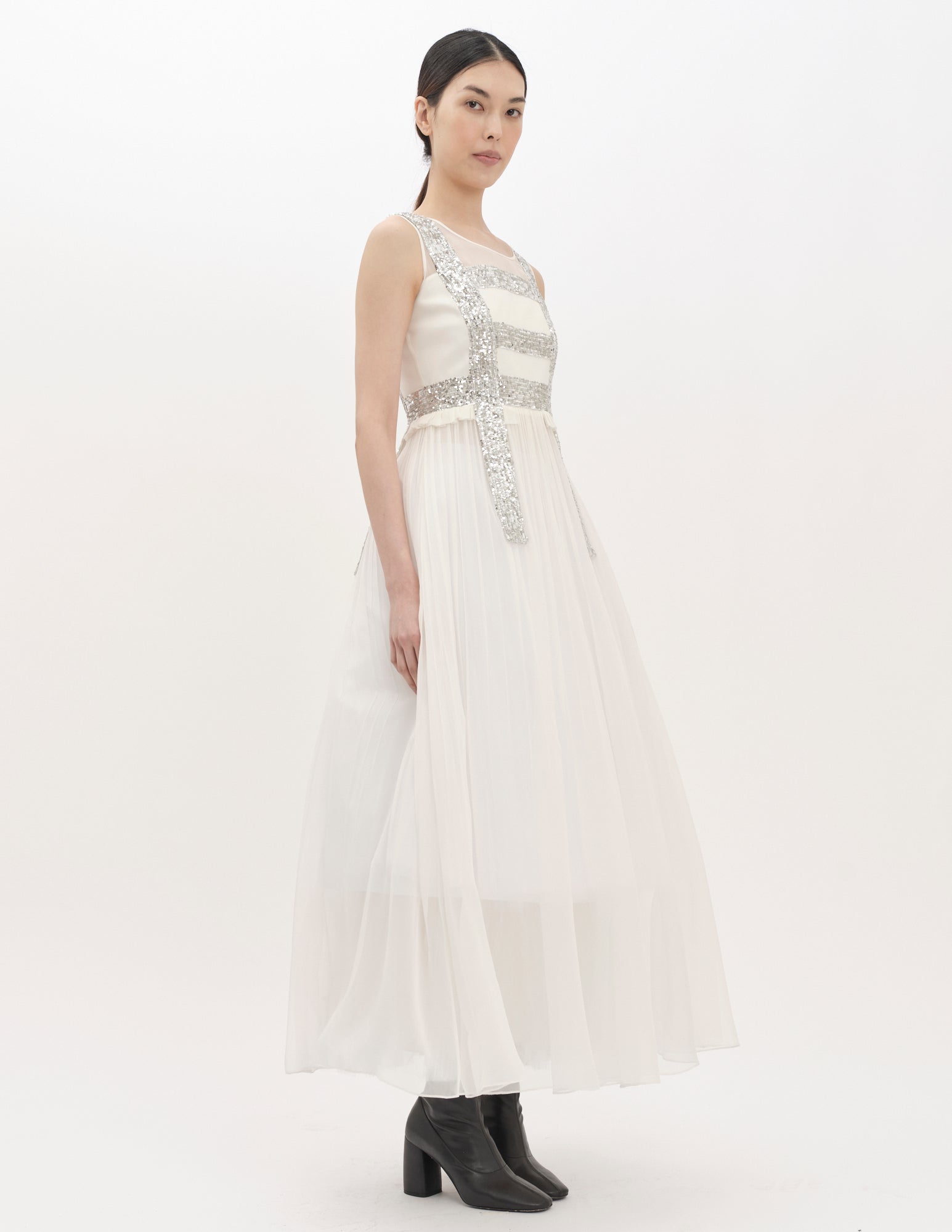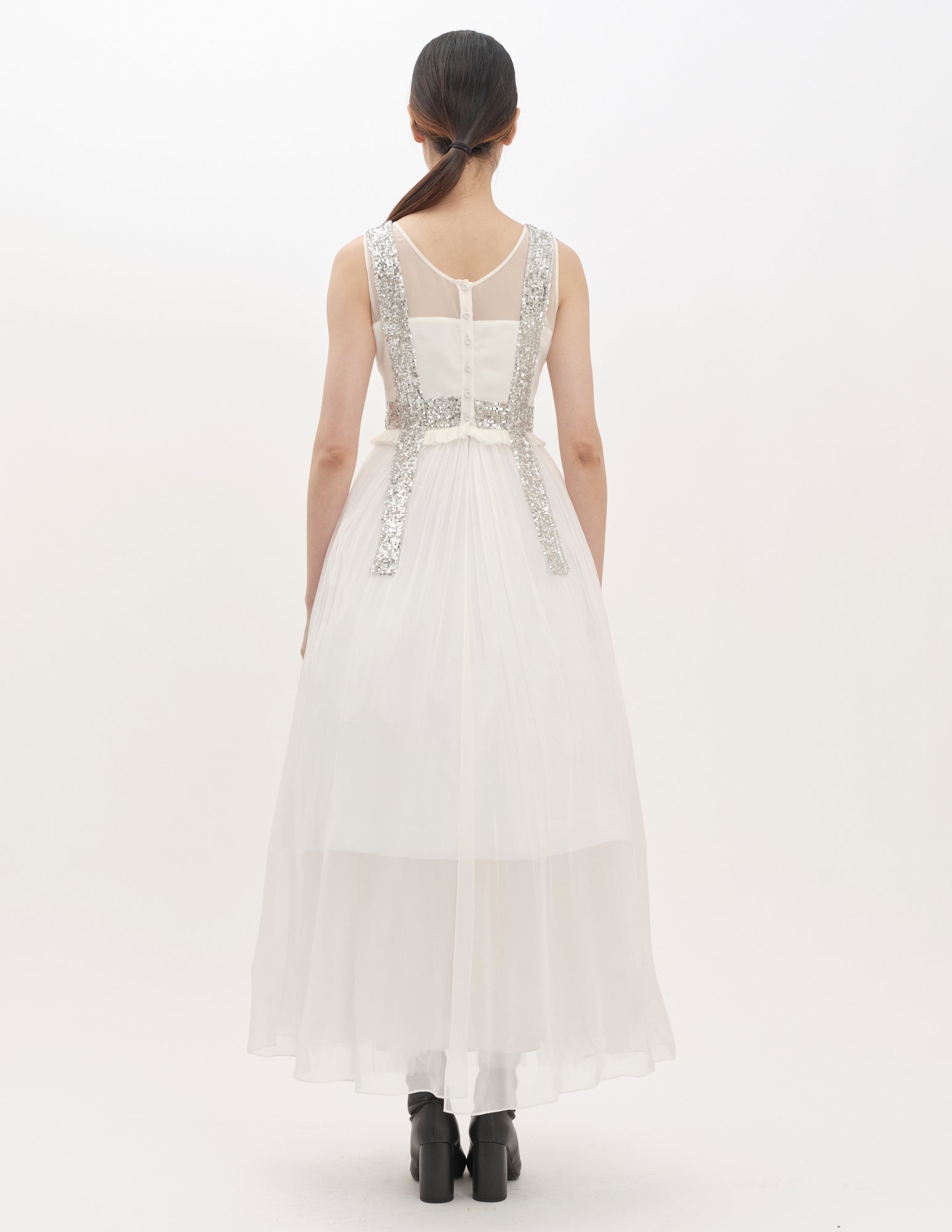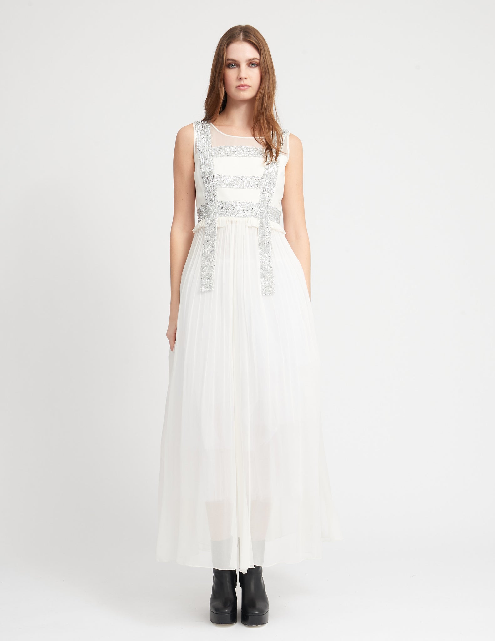 maxi gown in chiffon with sequin detailing, a fitted bodice, and a loose split back silhouette from the waist. styled with the ellis crinoline.